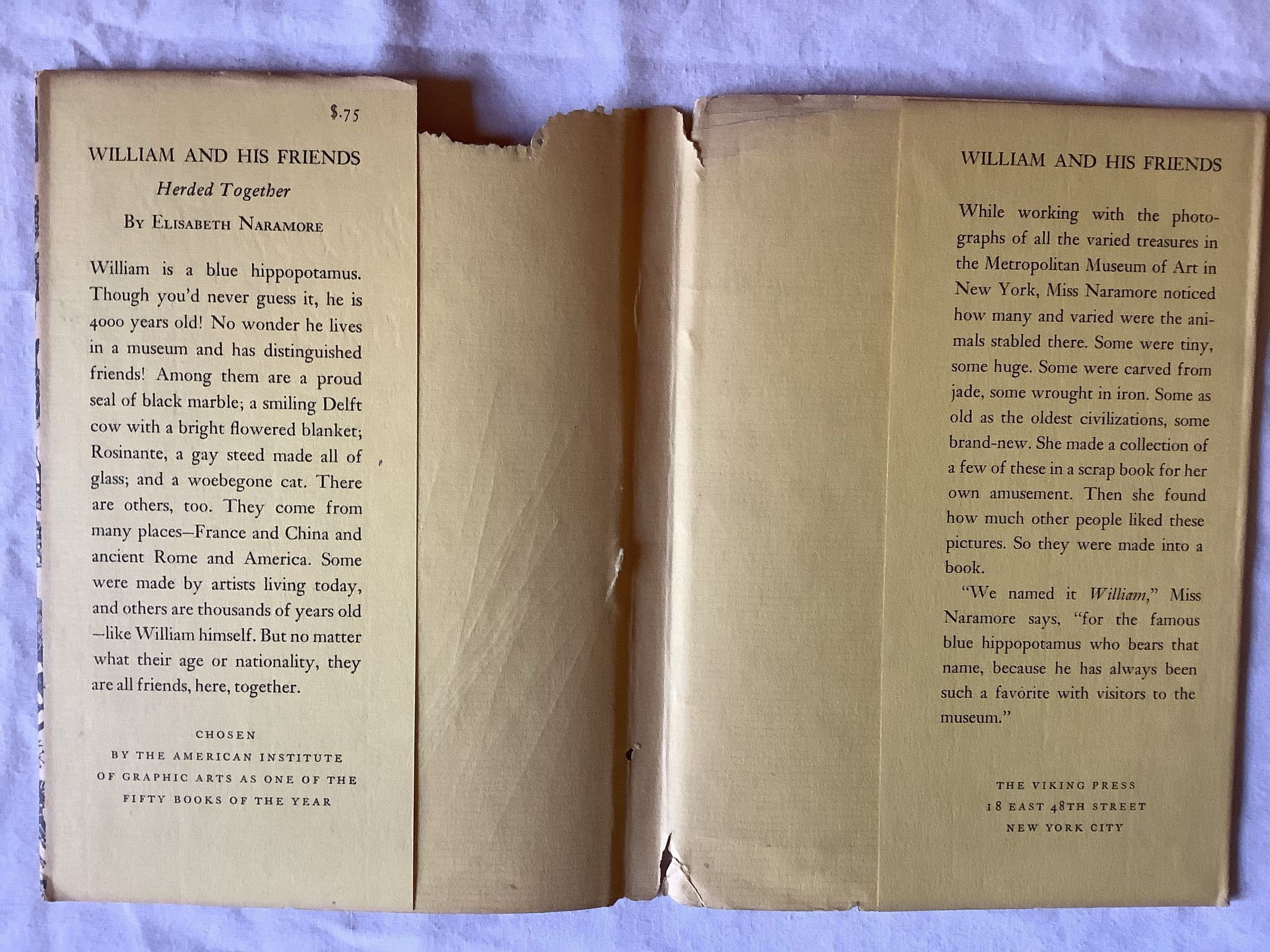 The book is named William for the blue hippopotamus, because he has always been such a favorite with visitors to the museum. -NoteInscription/Signature/Marks