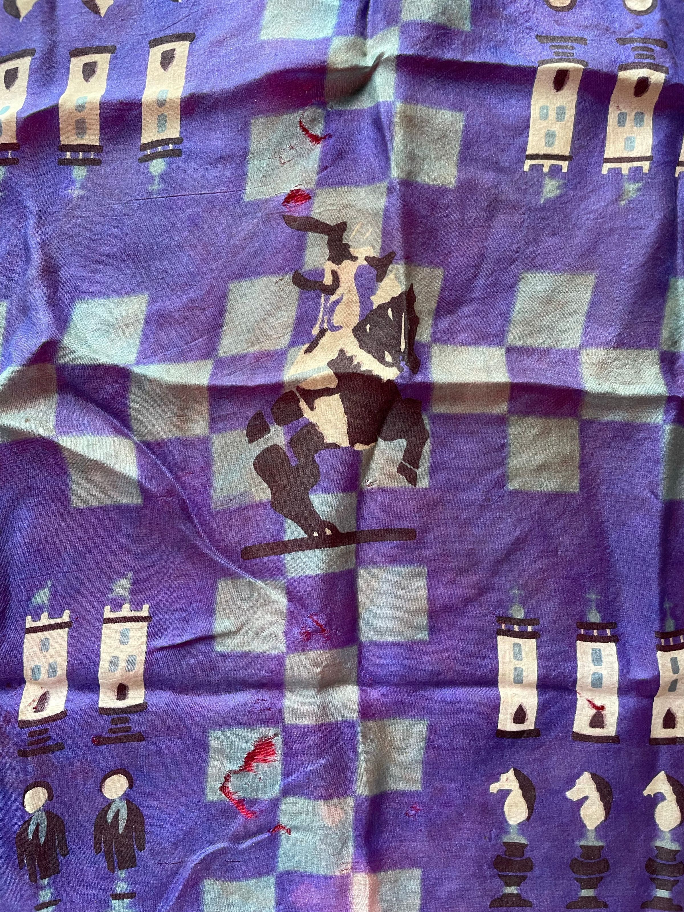 A blue patterned scarf with a chessboard and pieces pattern. There are a few holes.