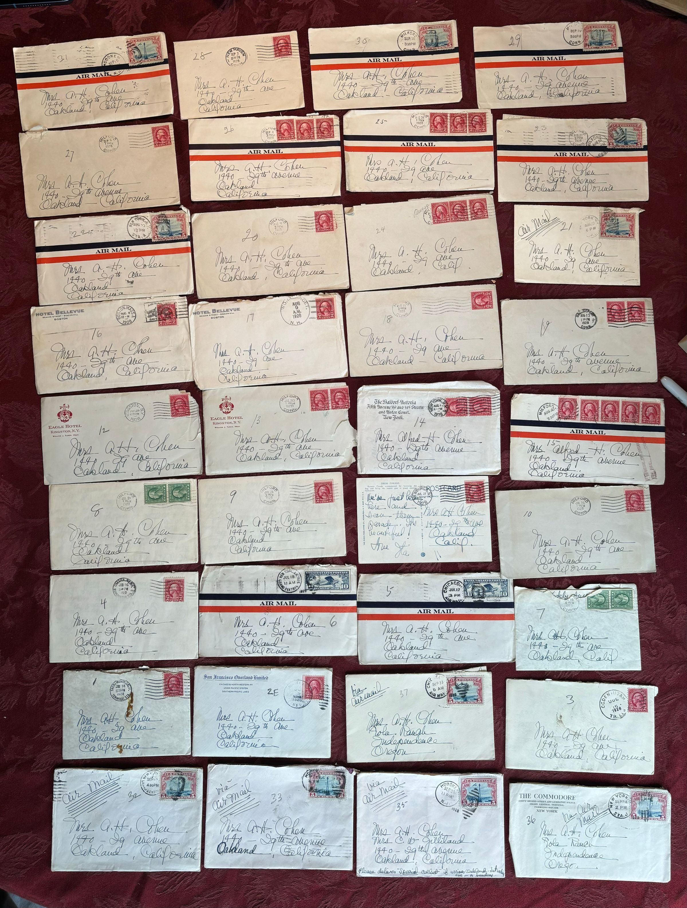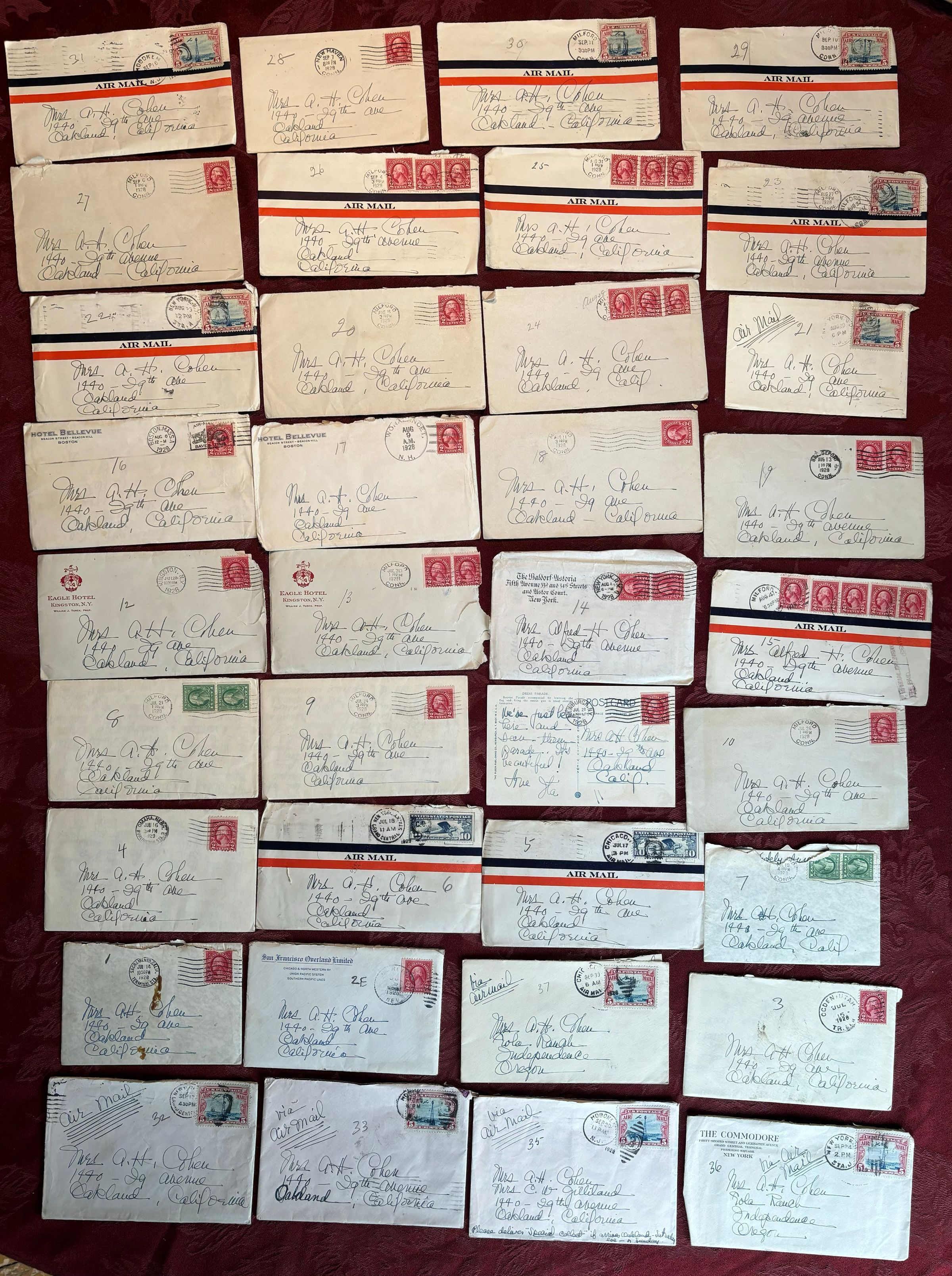 This is a collection of letters from Emelita to Emma, they are all from Emelita's travels to the East coast. There is 36 total, they are numbered 1-37 with number 34 not with the rest of the collection (lost ?). Letters are from July 14th 1928 to September 30th 1928. She took a train to travel so the letters start with Sacramento. They were found in the hidden drawer, tucked inside an envelope addressed to Mrs. Douglas Bray Cohen, though all the letters in the collection are addressed to Mrs. A. H. Cohen (Emma).Create Date