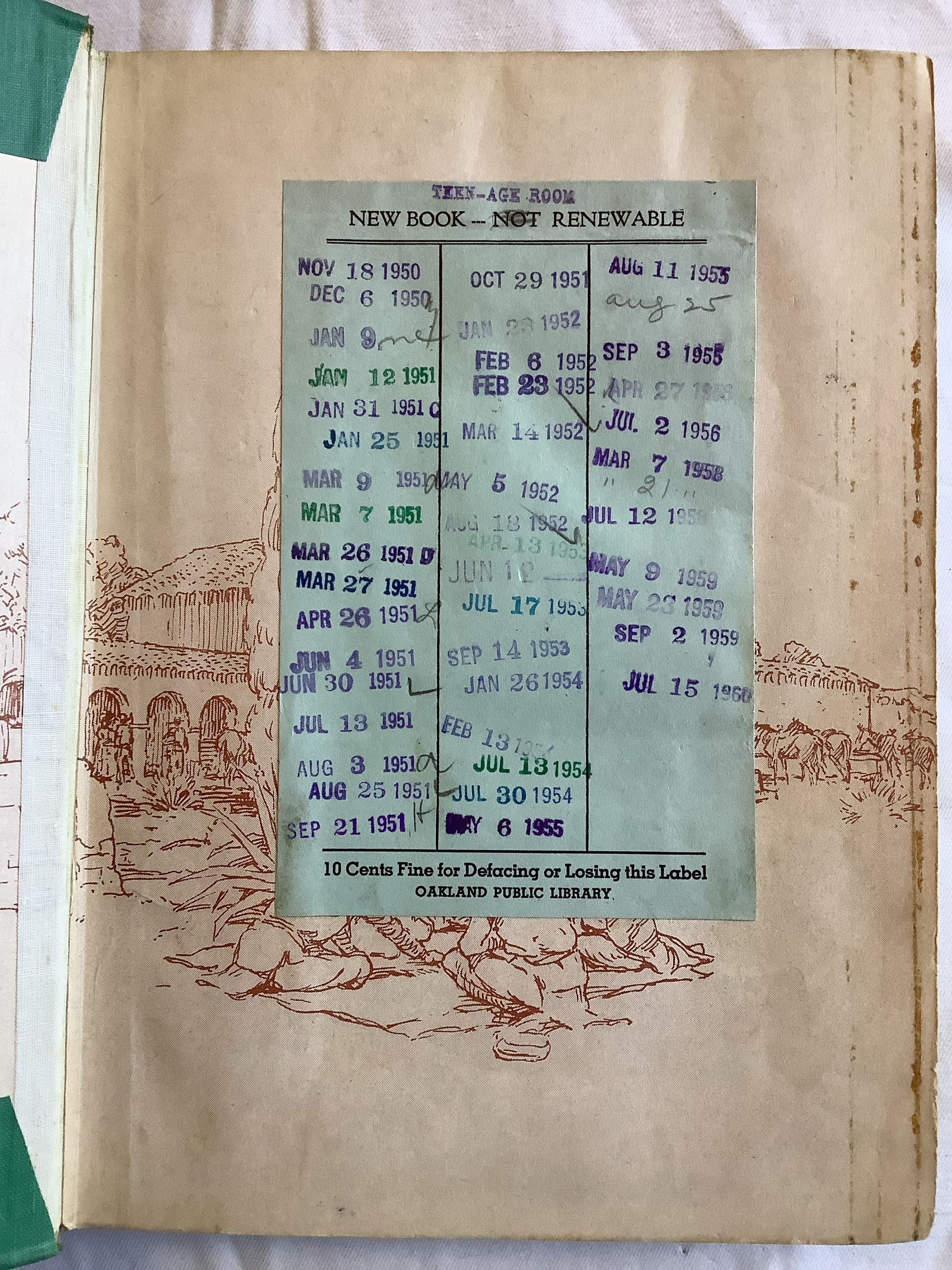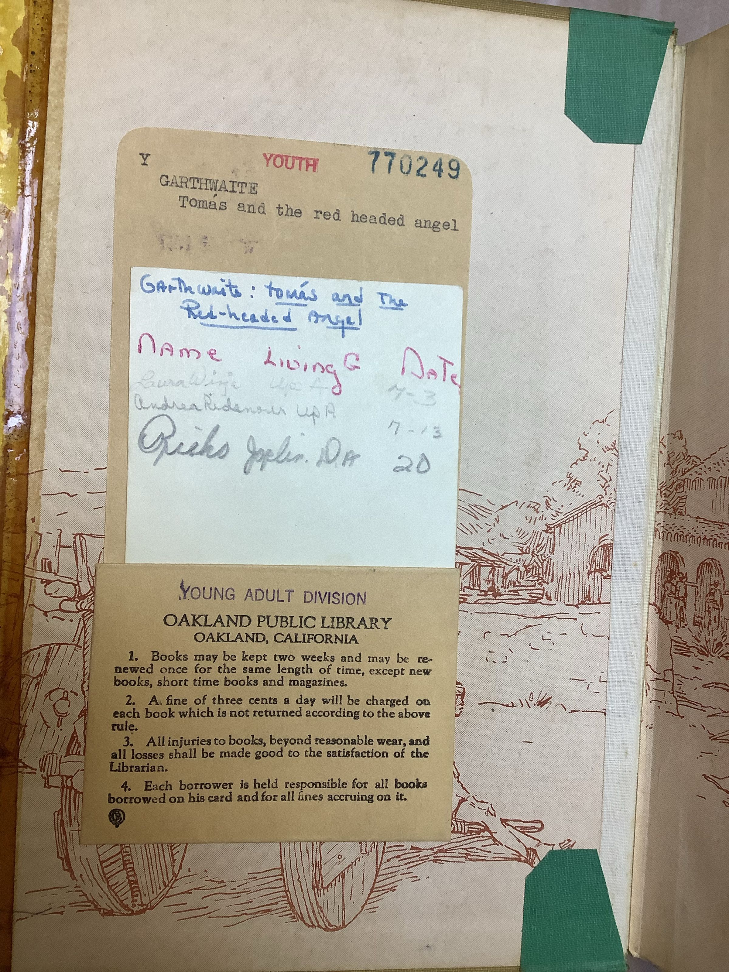 Oakland Public Library due date slips and pocket, pictured. First loan is from 1950 and last is from 1960.Type