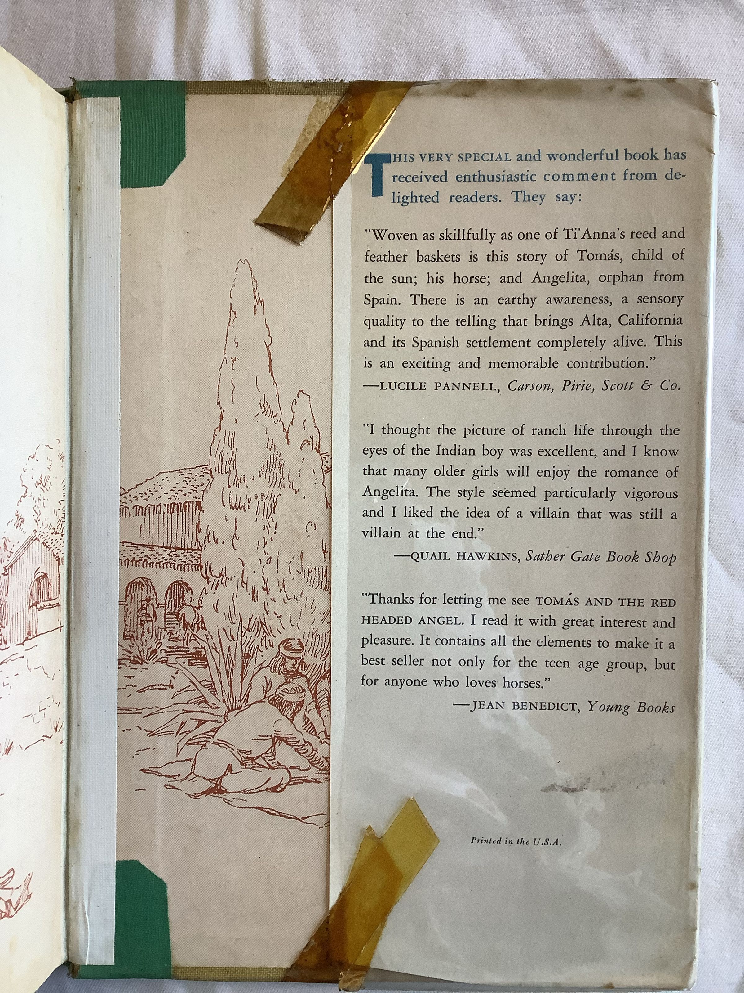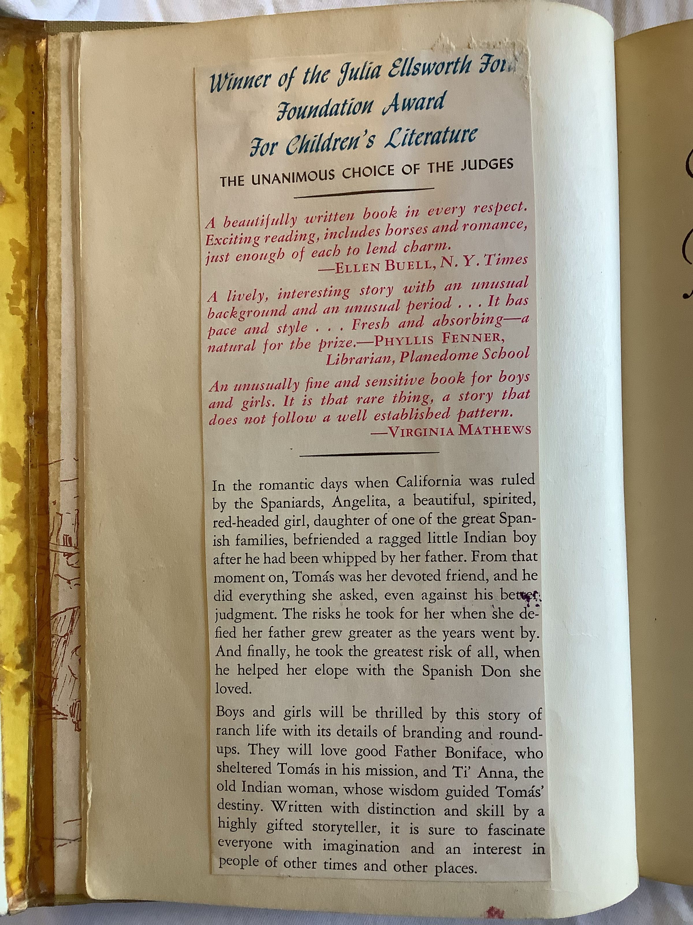 In the romantic days when California was ruled by the Spaniards, Angelita, a beautiful, spirited, red-headed girl, daughter of one of the great Span ish families, befriended a ragged little Indian boy after he had been whipped by her father. From that moment on, Tomás was her devoted friend, and he did everything she asked, even against his better judgment. The risks he took for her when she defied her father grew greater as the years went by. And finally, he took the greatest risk of all, when he helped her elope with the Spanish Don she loved.