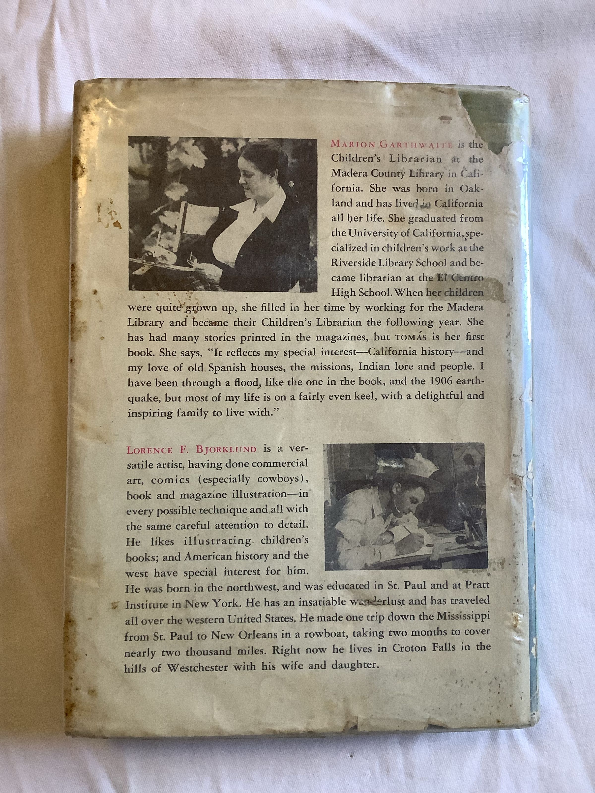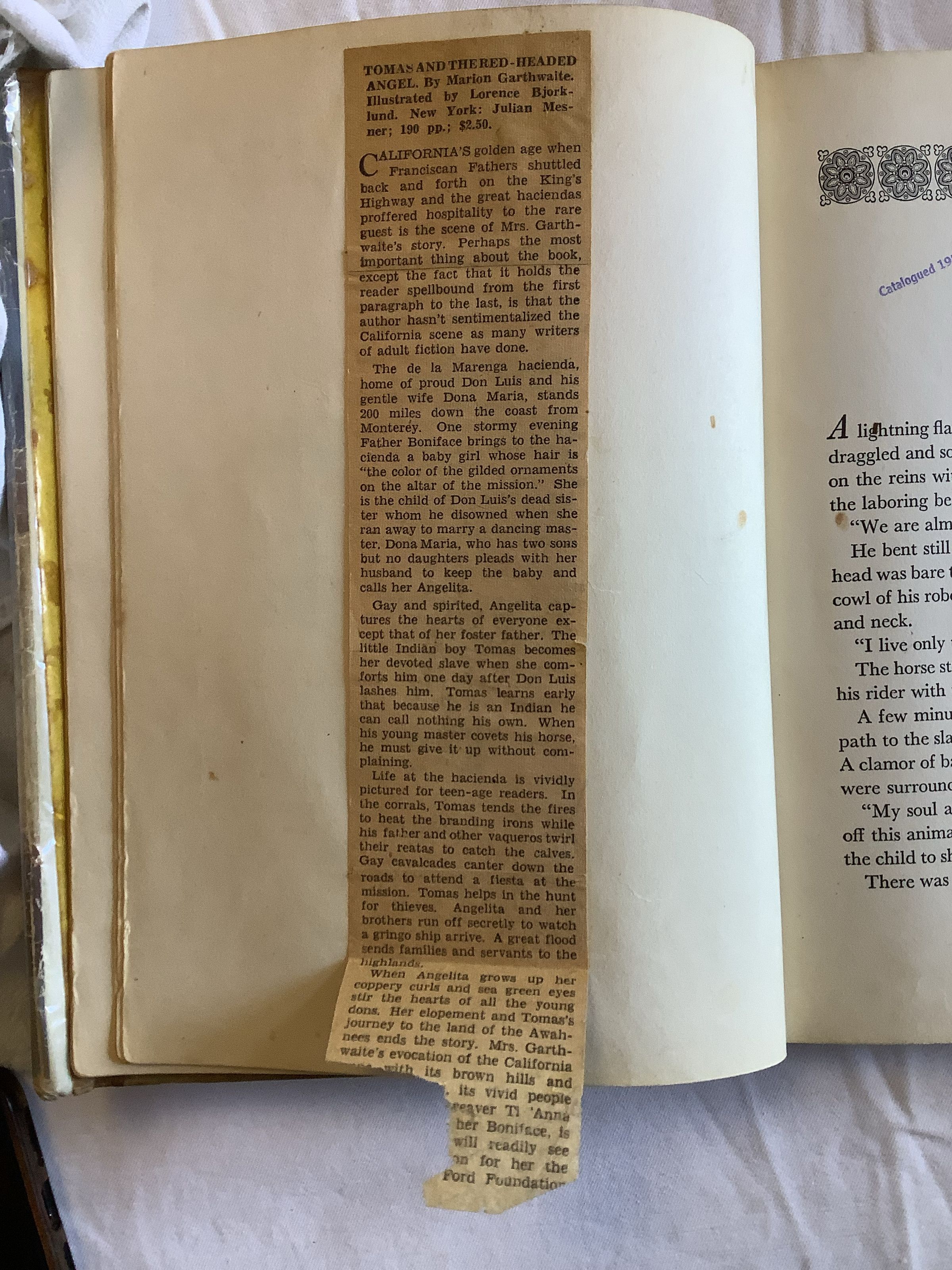 Life at the hacienda is vividly pictured for teen-age readers. In the corrals, Tomas tends the fires to beat the branding irons while his father and other vaqueros twirl their reatas to catch the calves. Gay cavalcades canter down the roads to attend a fiesta at the mission. Tomas helps in the hunt for thieves. Angelita and her brothers run off secretly to watch a gringo ship arrive. A great flood sends families and servants to the Highlands,