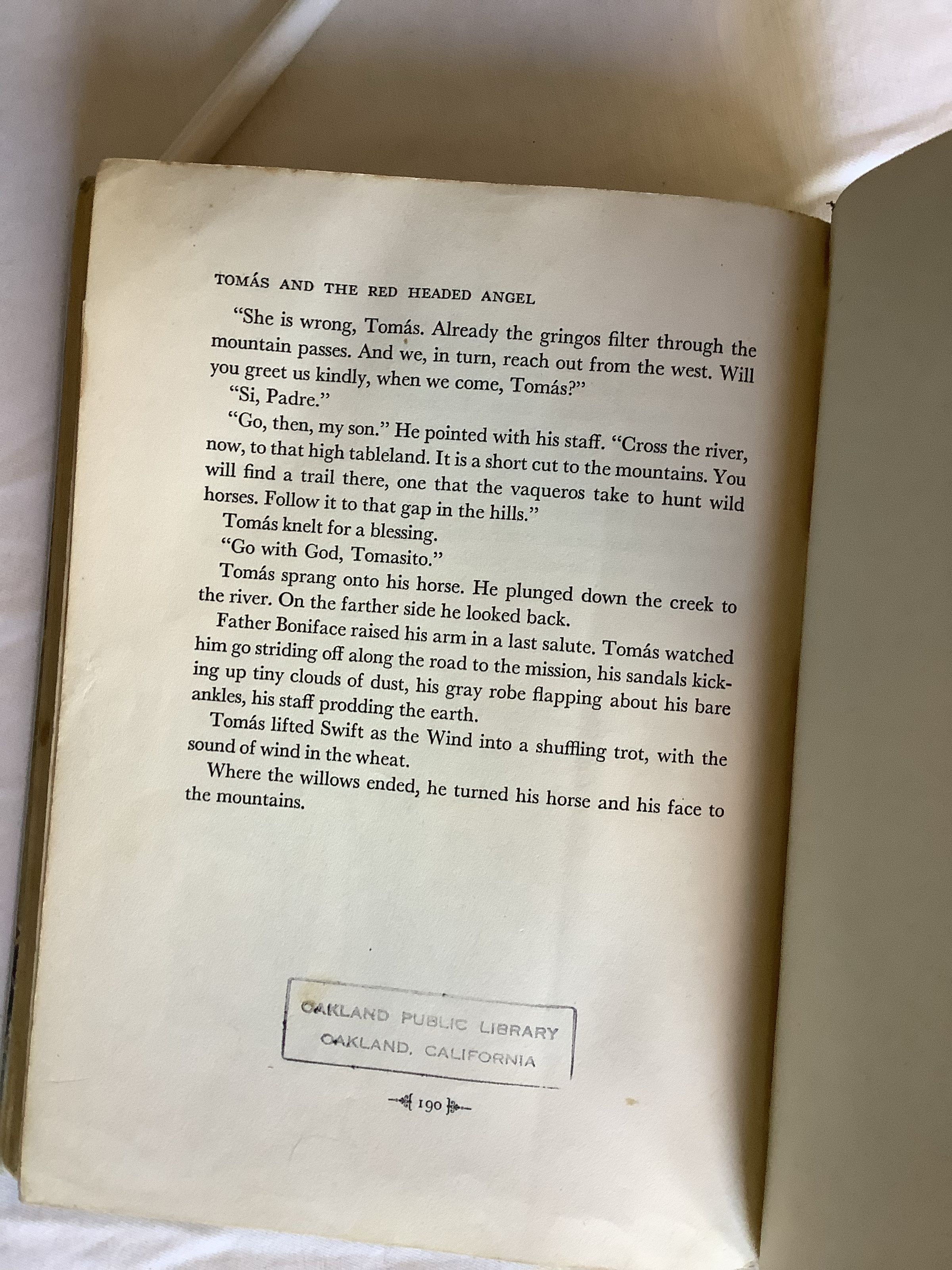 When Angelita grows up her coppery curls and sea green eyes stir the hearts of all the young dons. Her elopement and Toman's Journey to the land of the Awahnees ends the story [Missing].Language