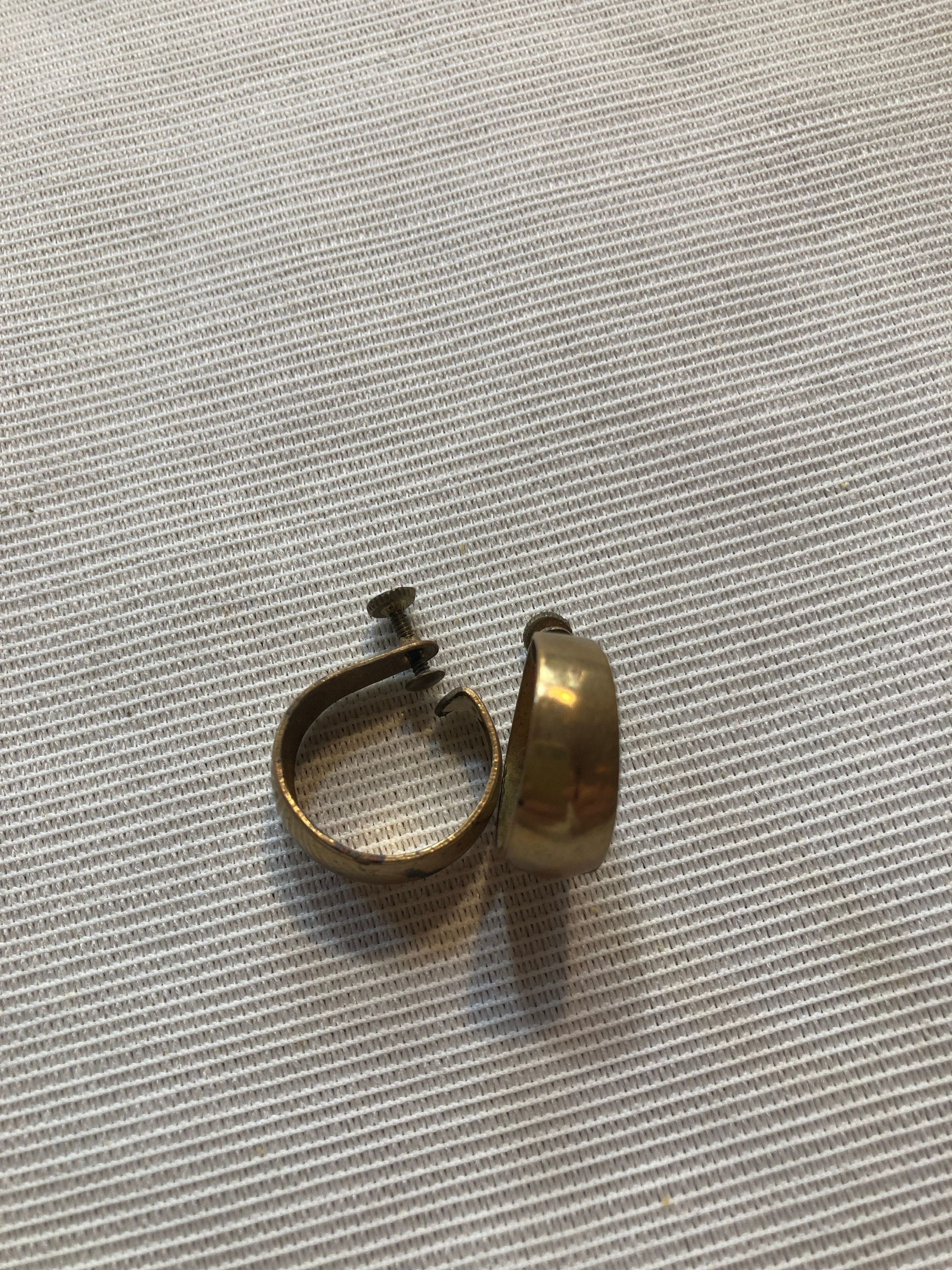 Pair of clip on earrings with screw back. Small gold colored hoops with some spots of discoloration.