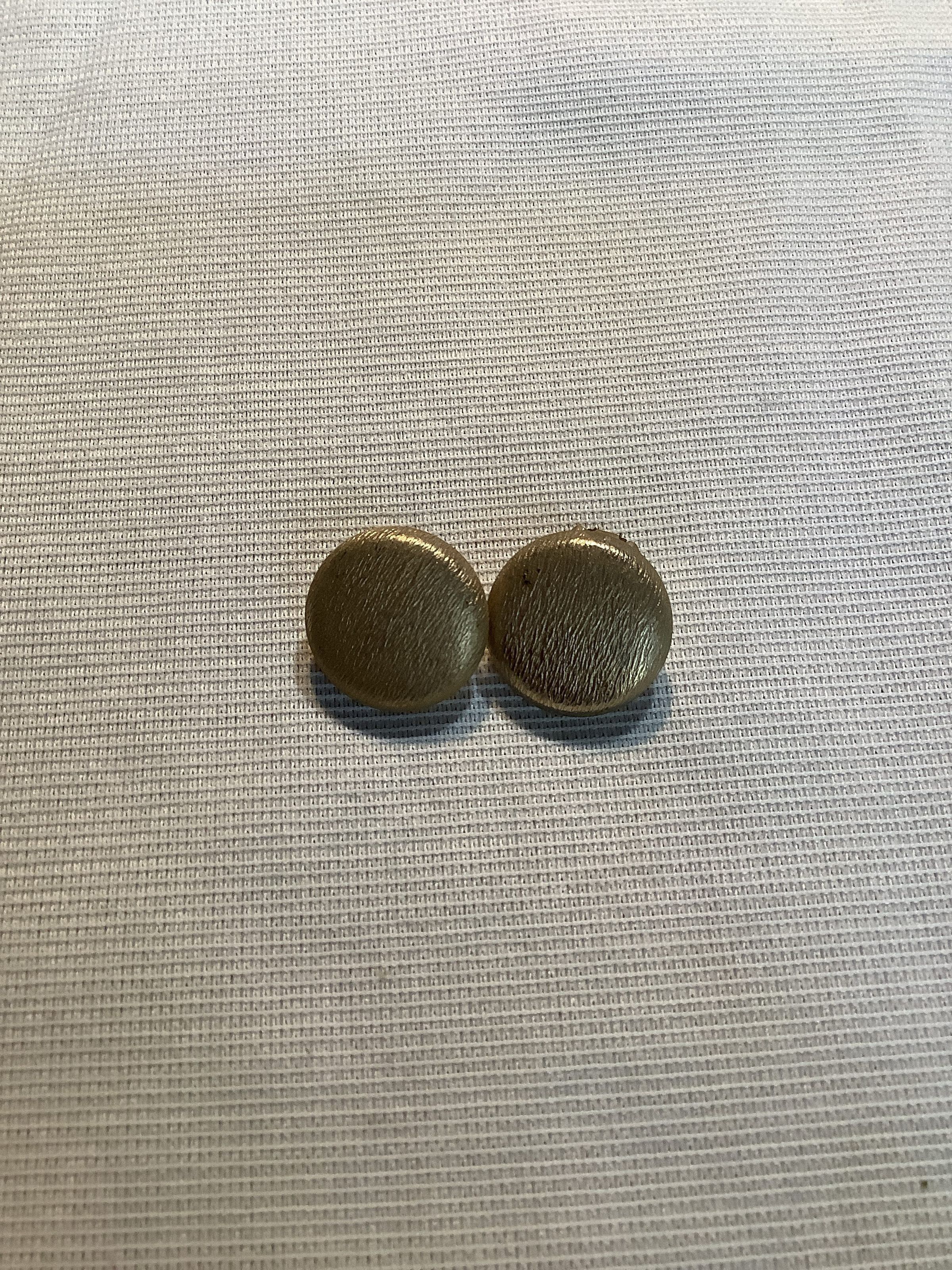 Pair of clip on earrings with a domed button shape, and a brushed gold tone finish.