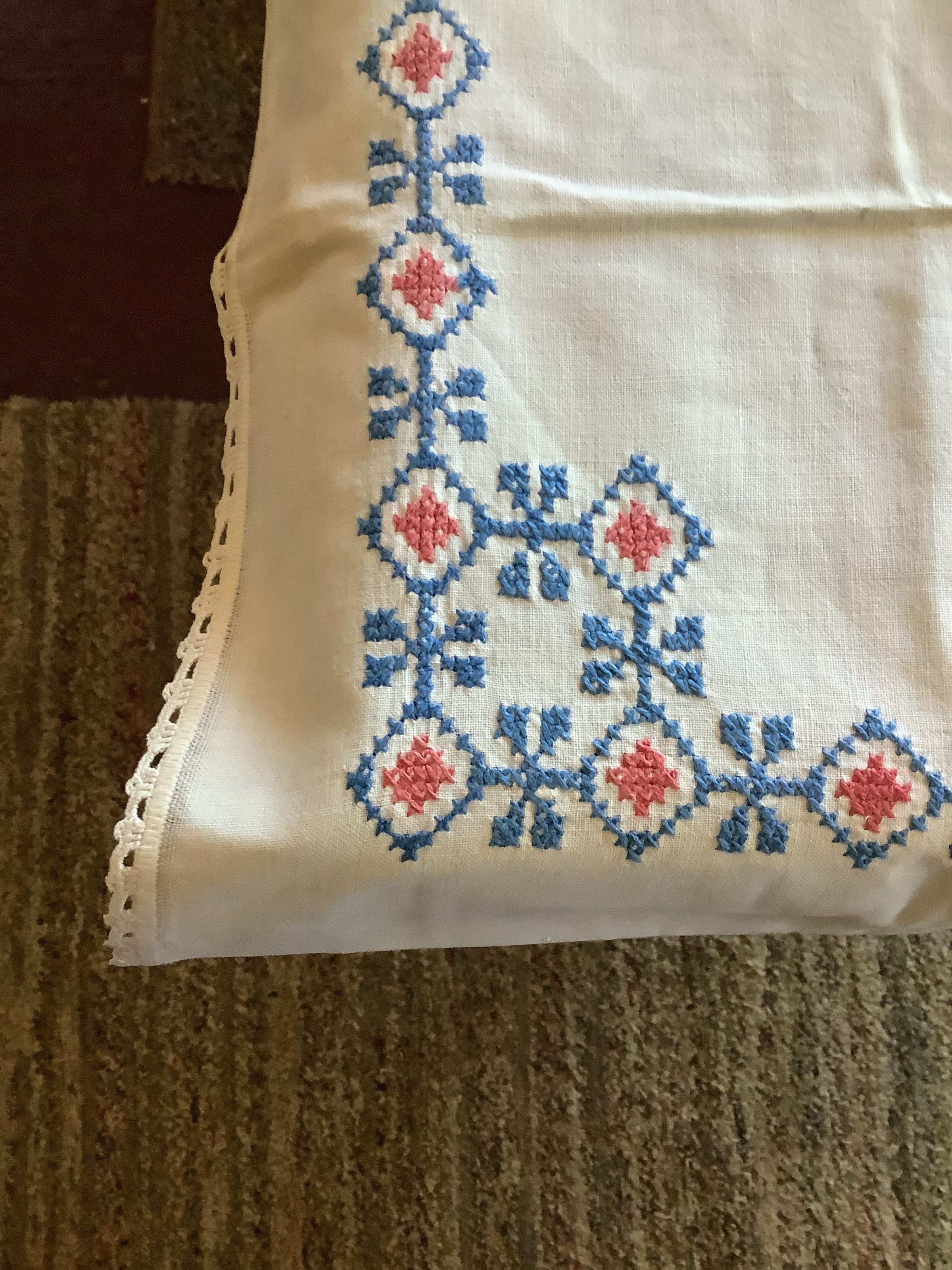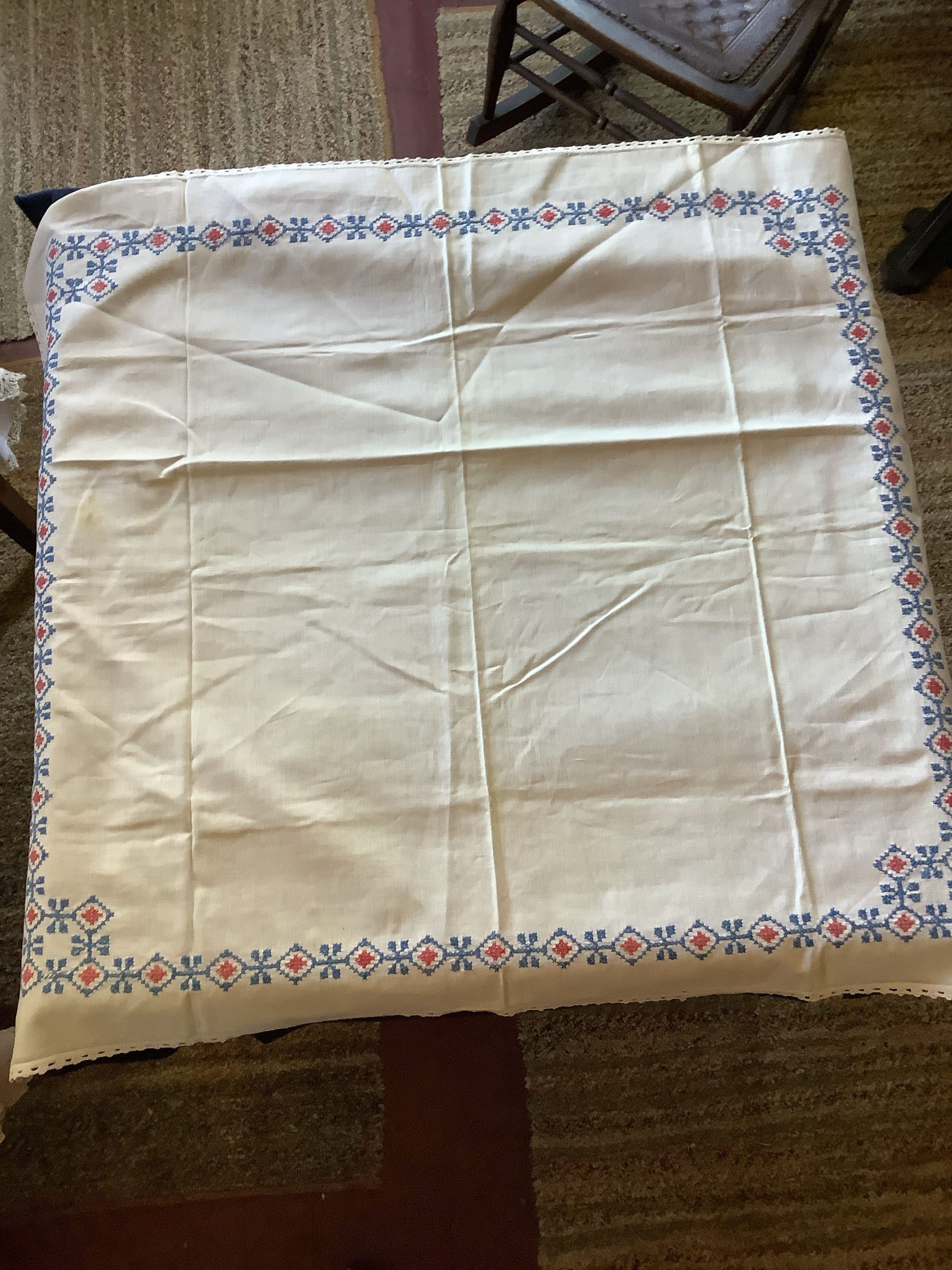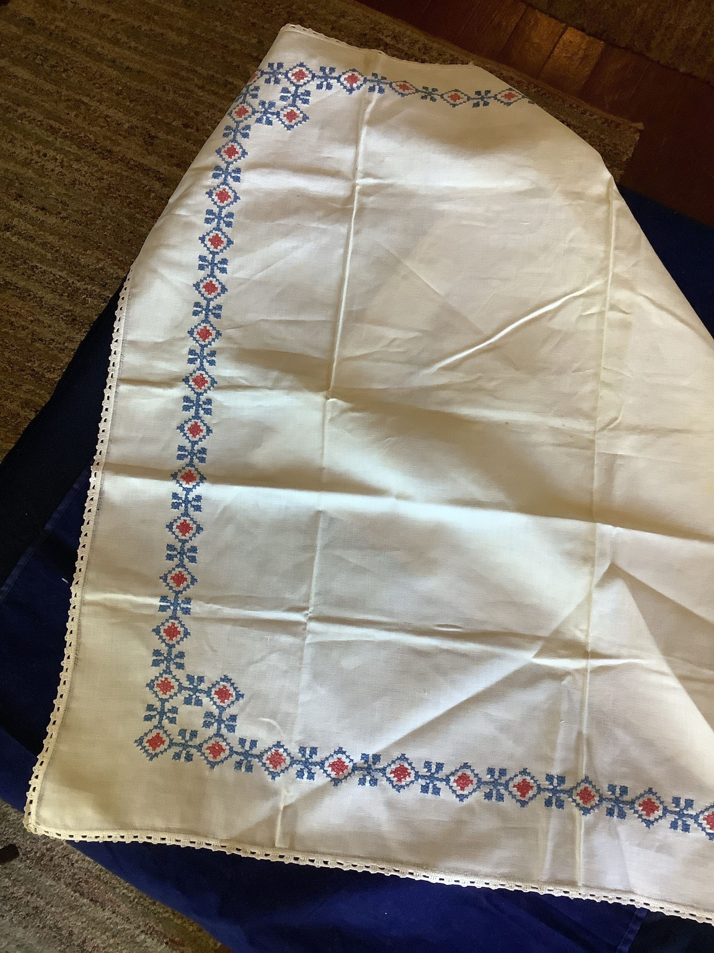 This is a rectangle table cloth with a red and blue cross-stitch embroidery border. It is also hemmed by a crocheted edge.