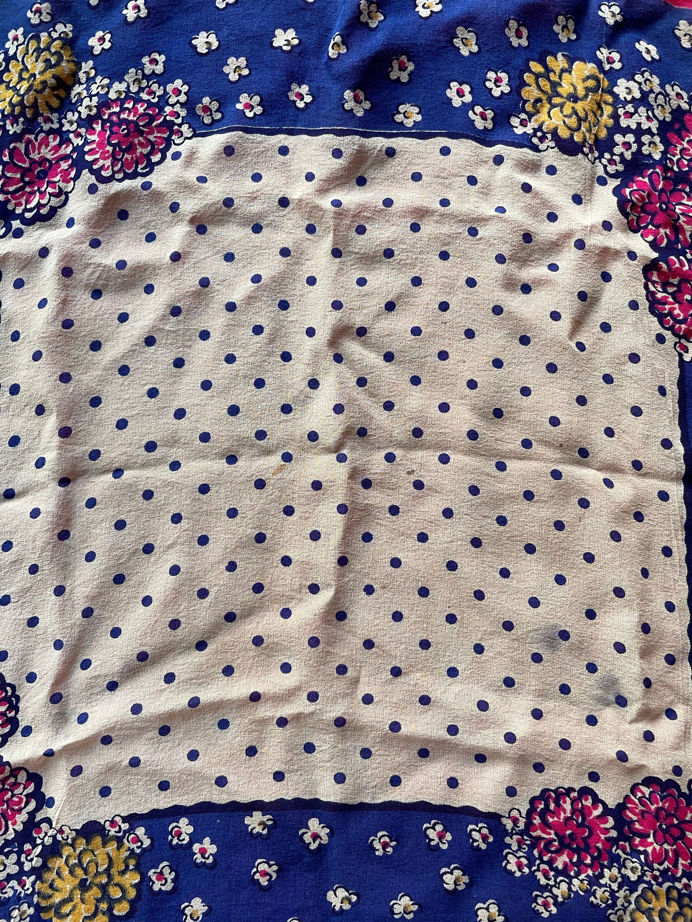 A multicolored polka dot patterned scarf with flower decorations lining the border.