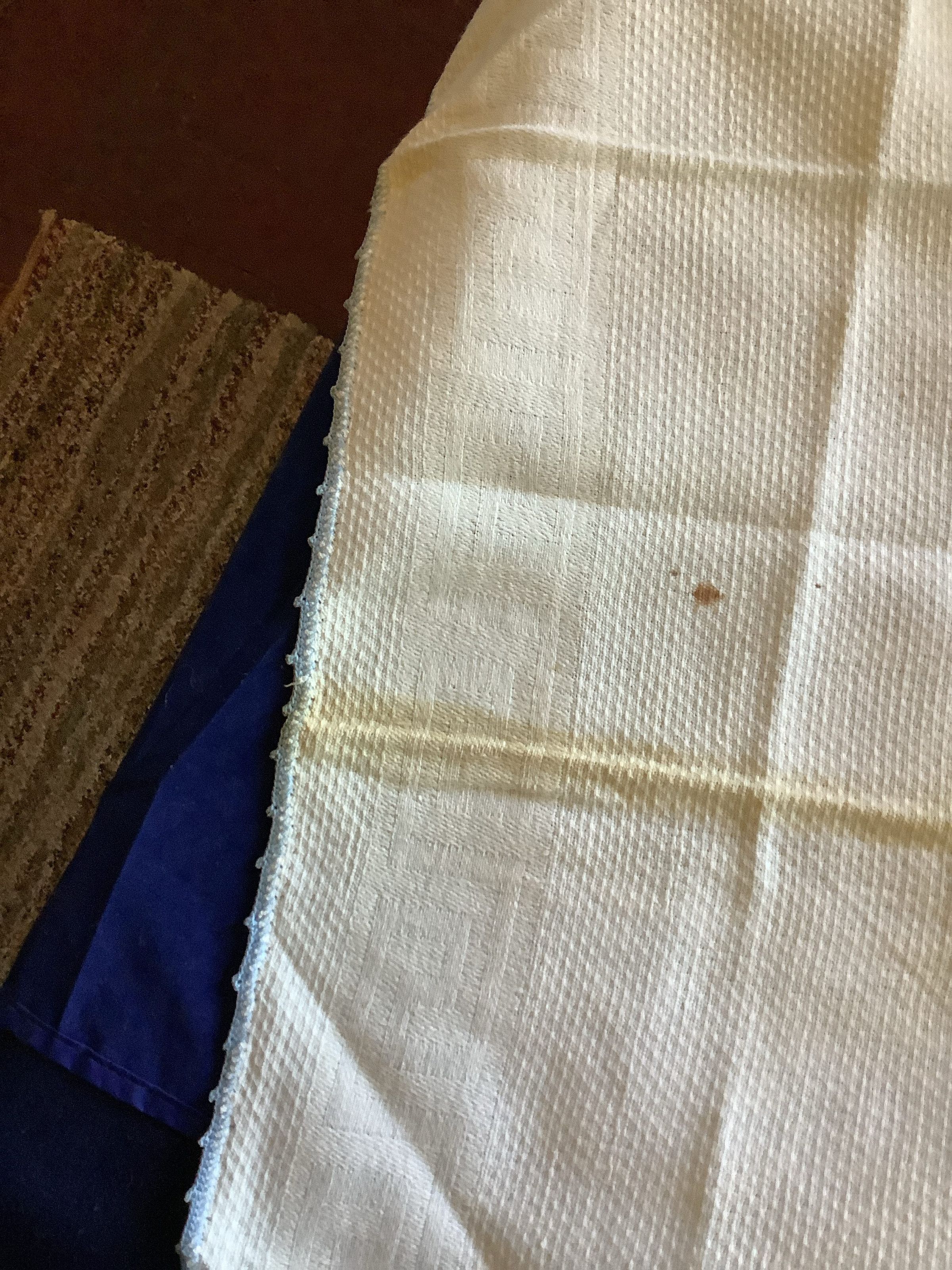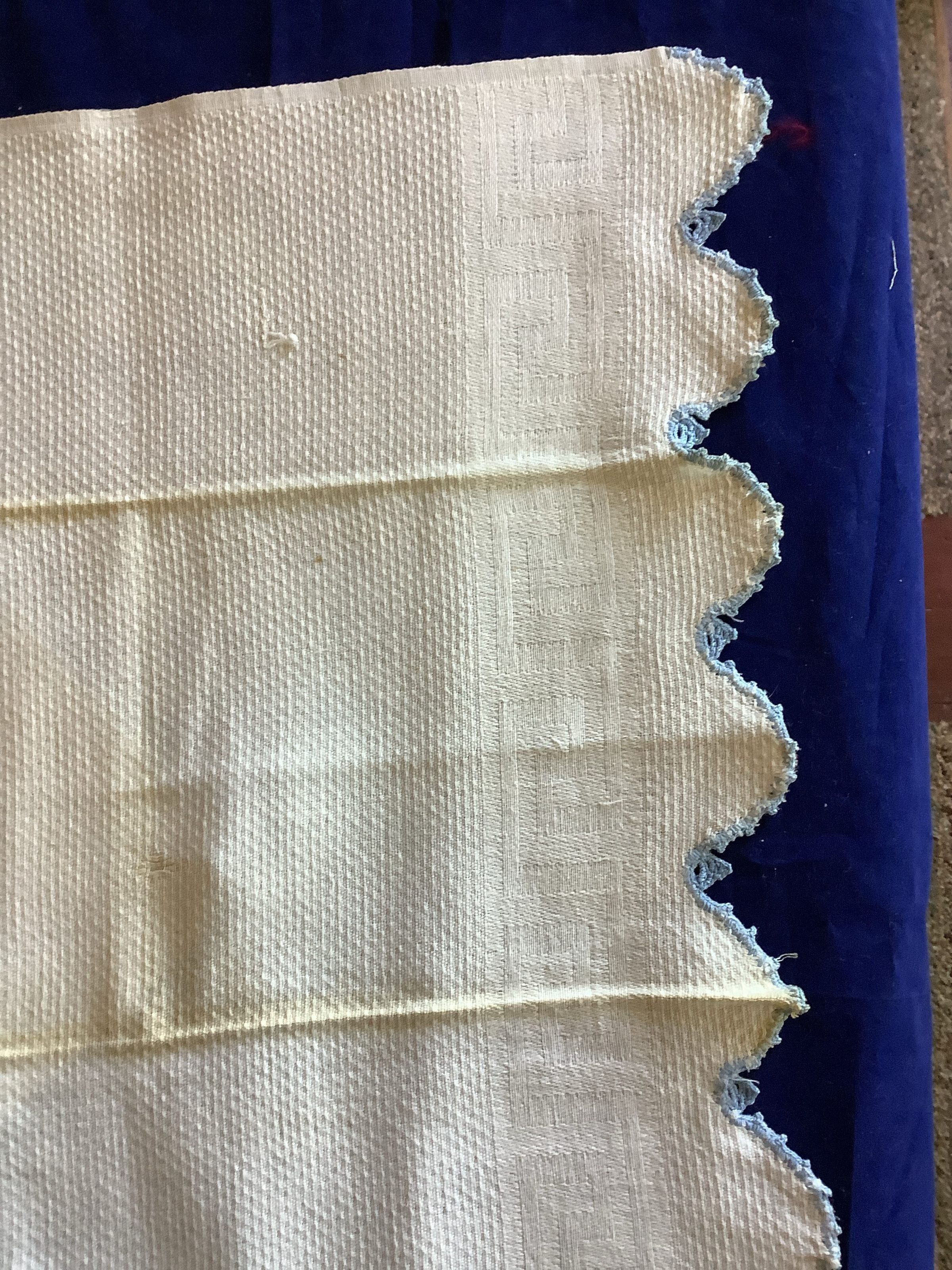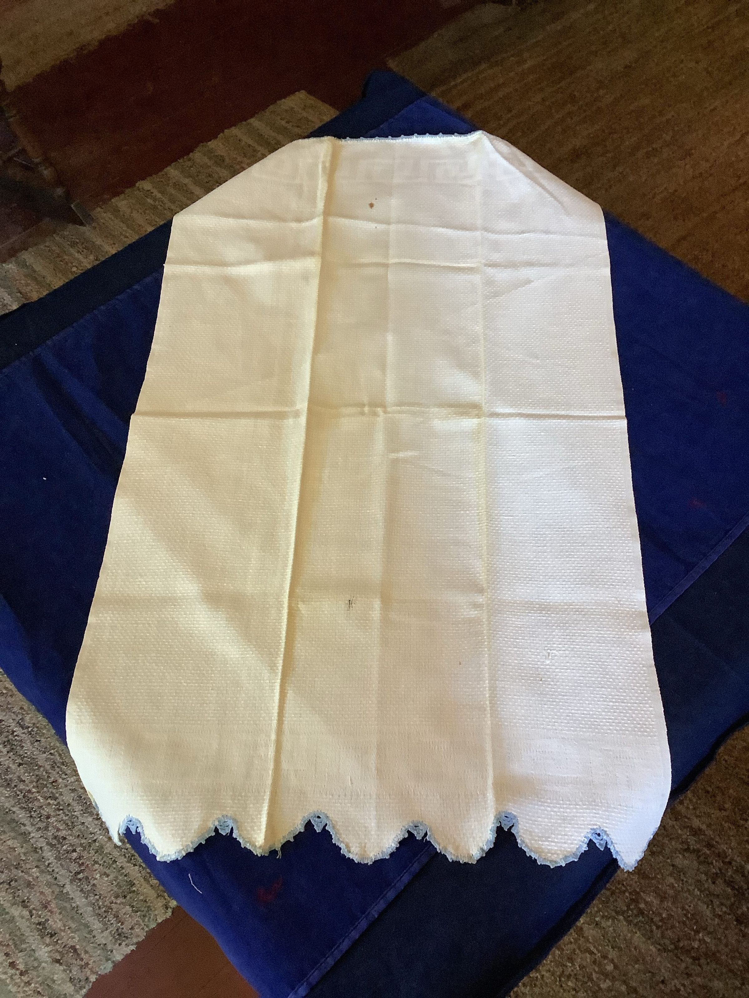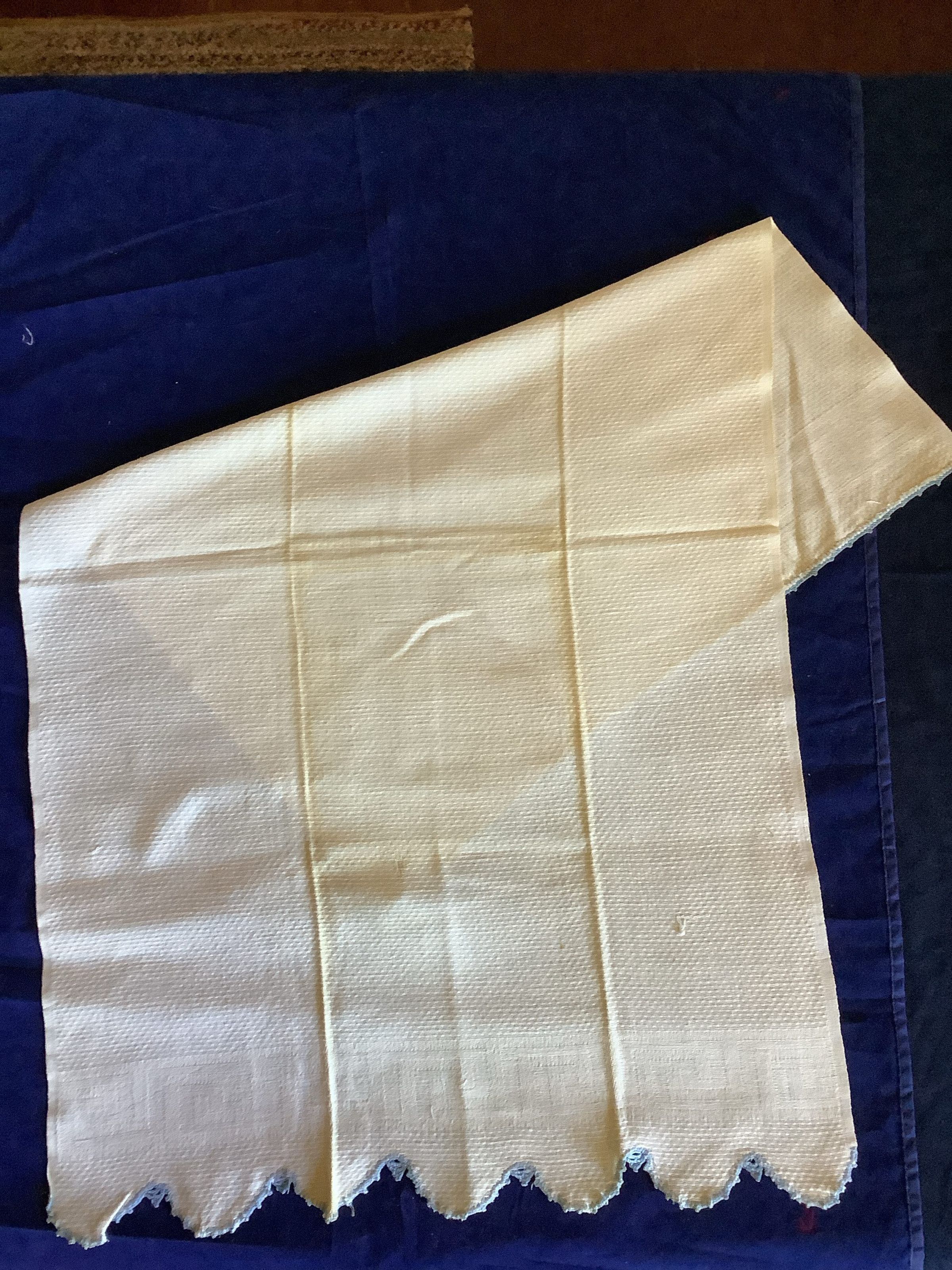 Hand towel with two embroidered blue rimmed edges. One is scalloped and one is straight.