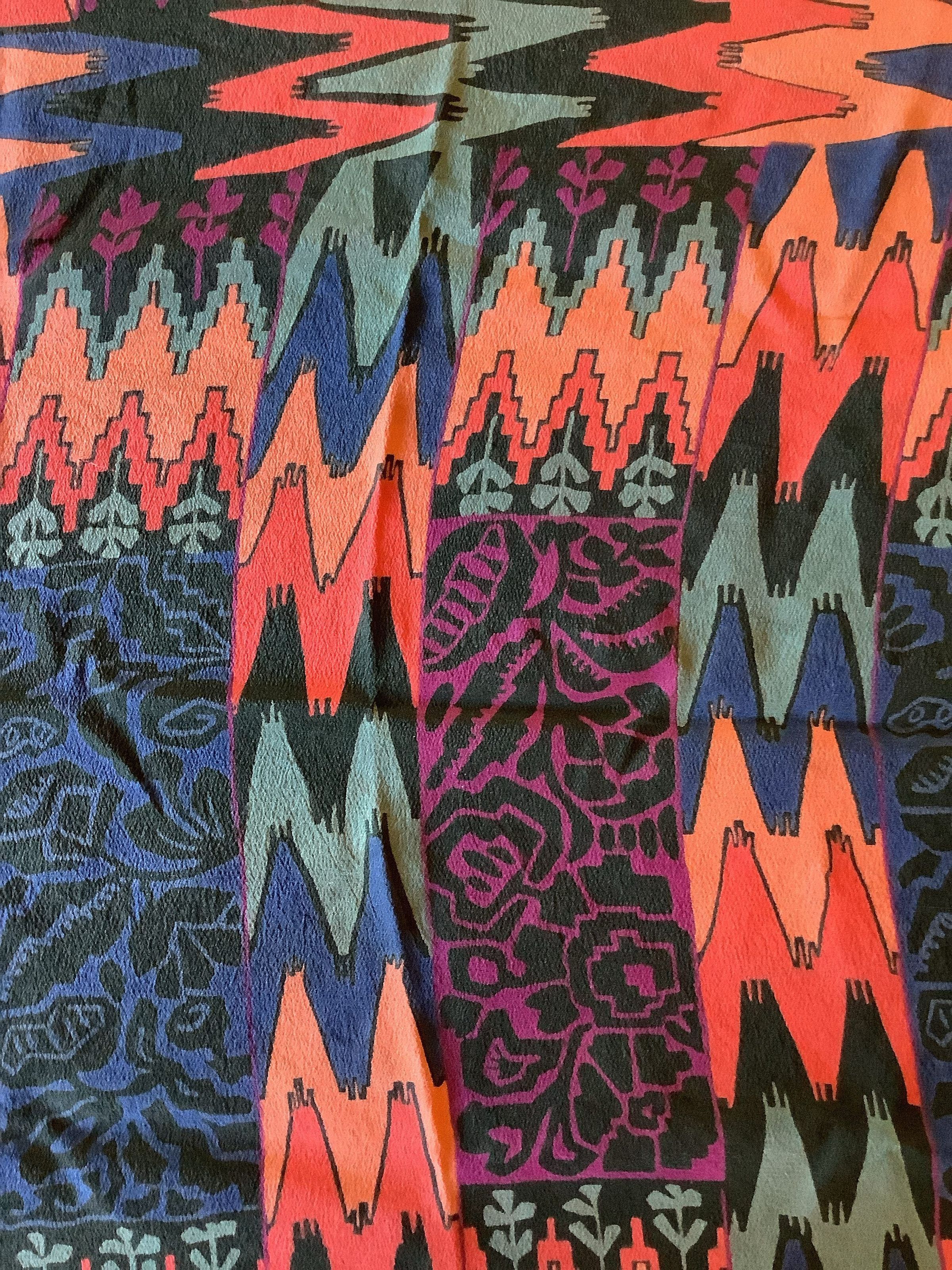 A multicolored patterned scarf that has depictions of plants and jagged, tiered structures that may be representing the old, indigenous edifices of various Central and South American cultures. The colors range from black to light blue, with orange, purple, red, and green also strewn throughout. The maker is unknown.Create Date