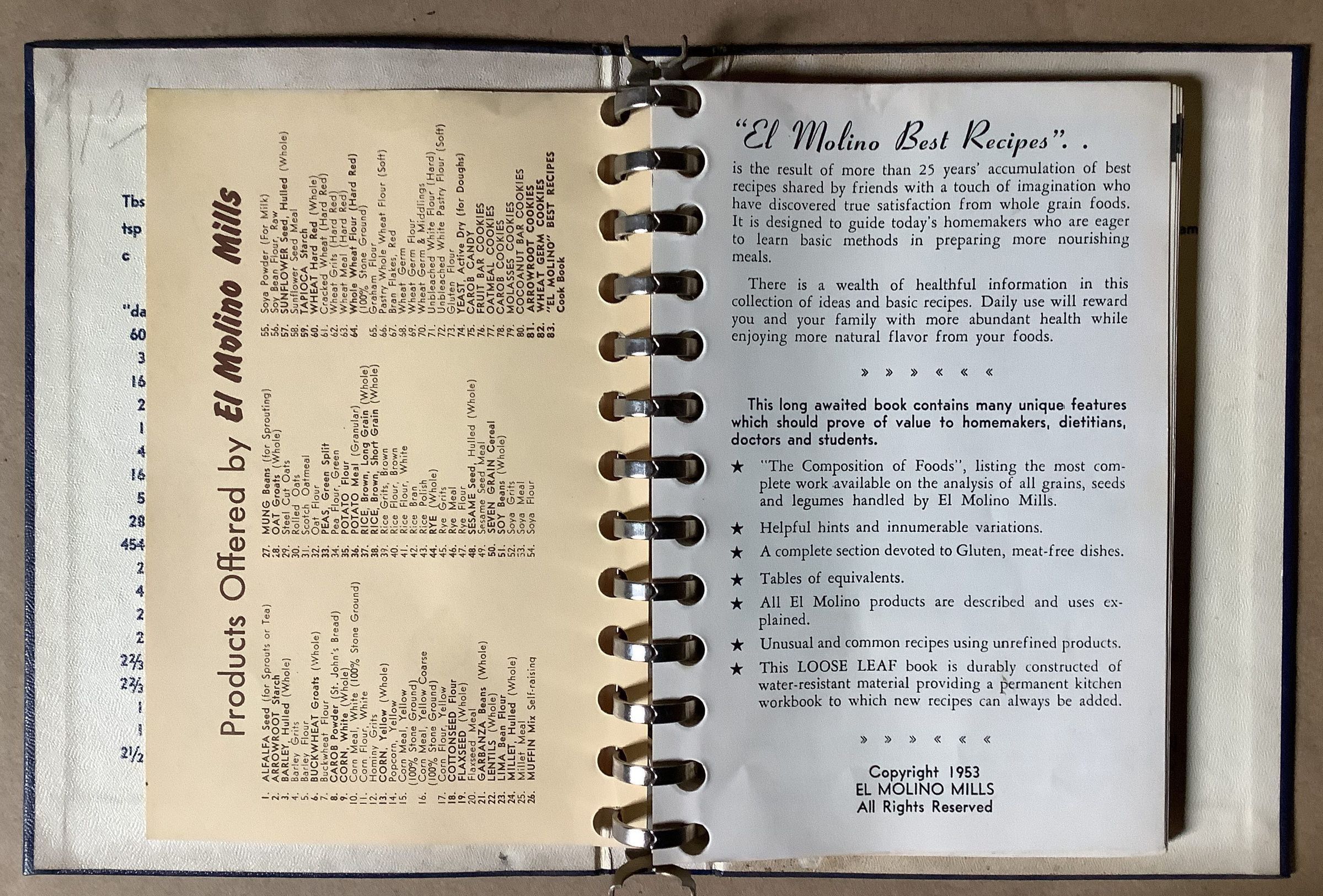 Promotional booklet; includes advertising for various El Molino products, outside view of El Molino Mills, and list of El Molino products