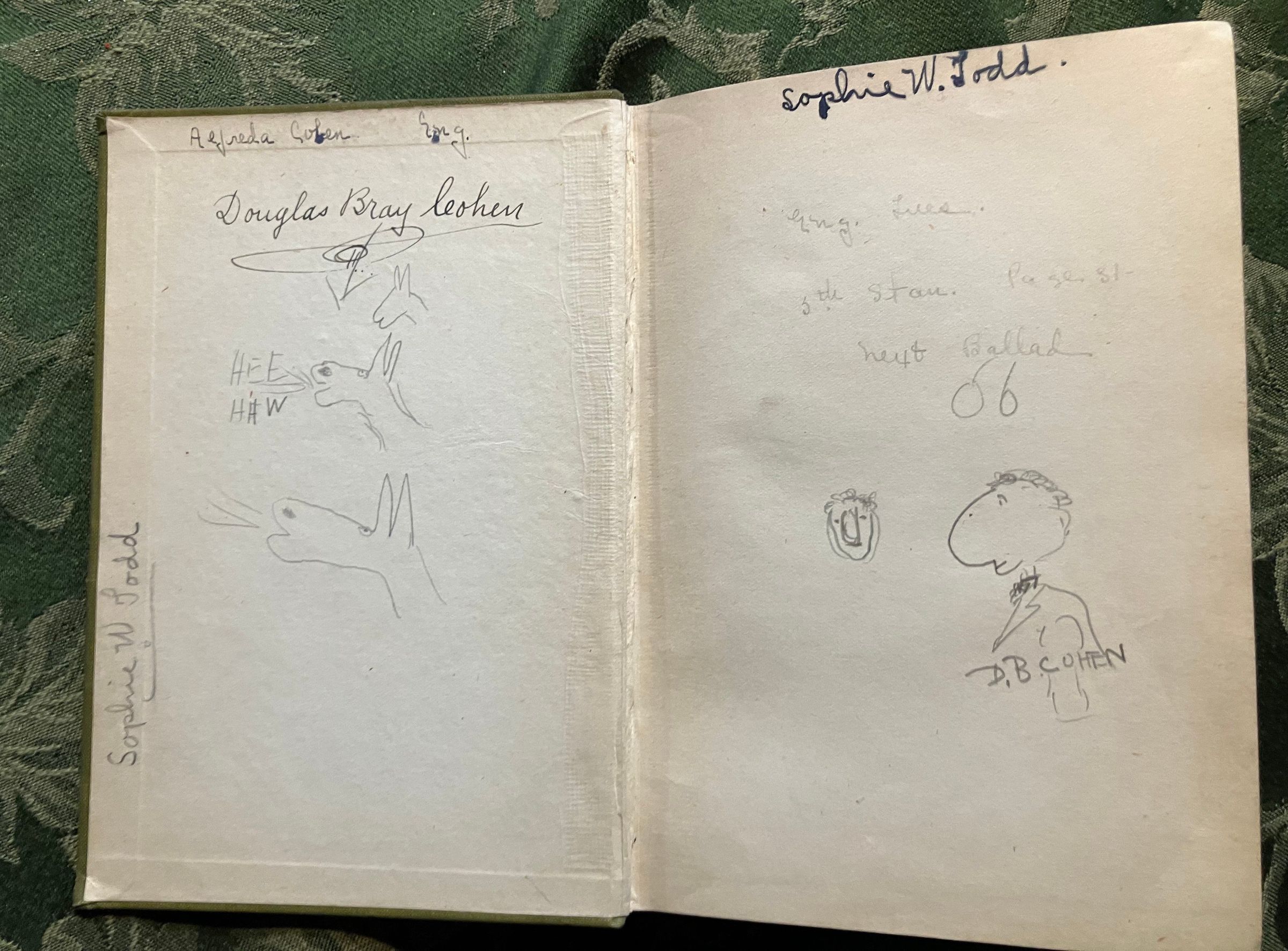 Various doodles- donkeys braying/saying "hee haw", cartoon man with name "D.B. Cohen"Type
