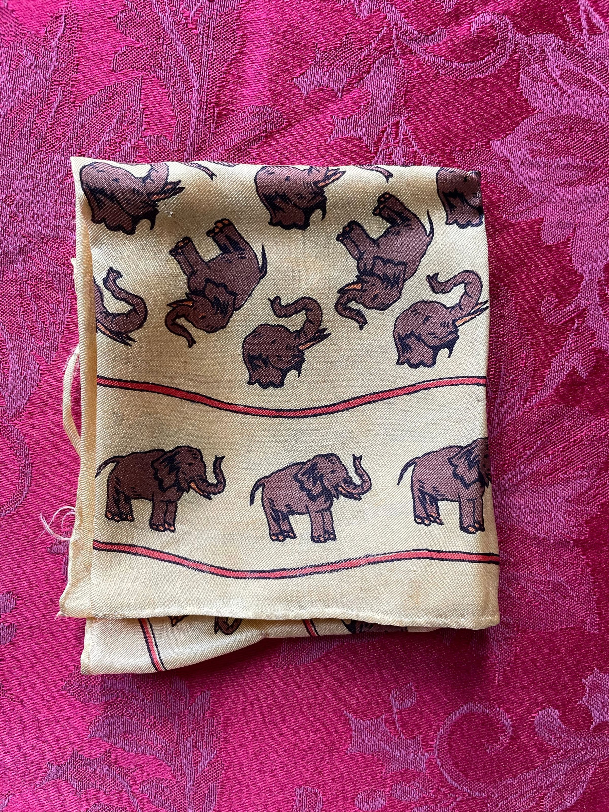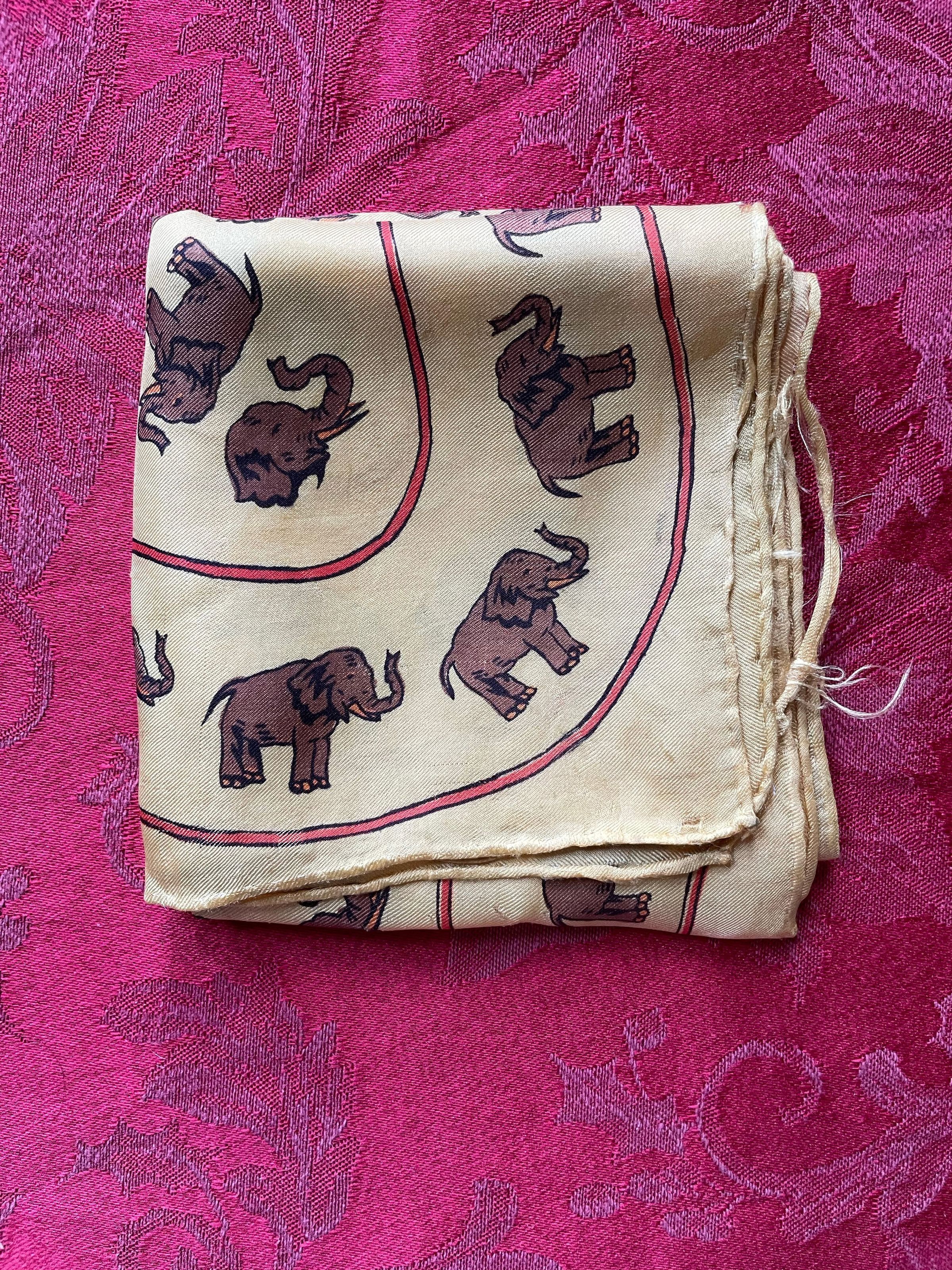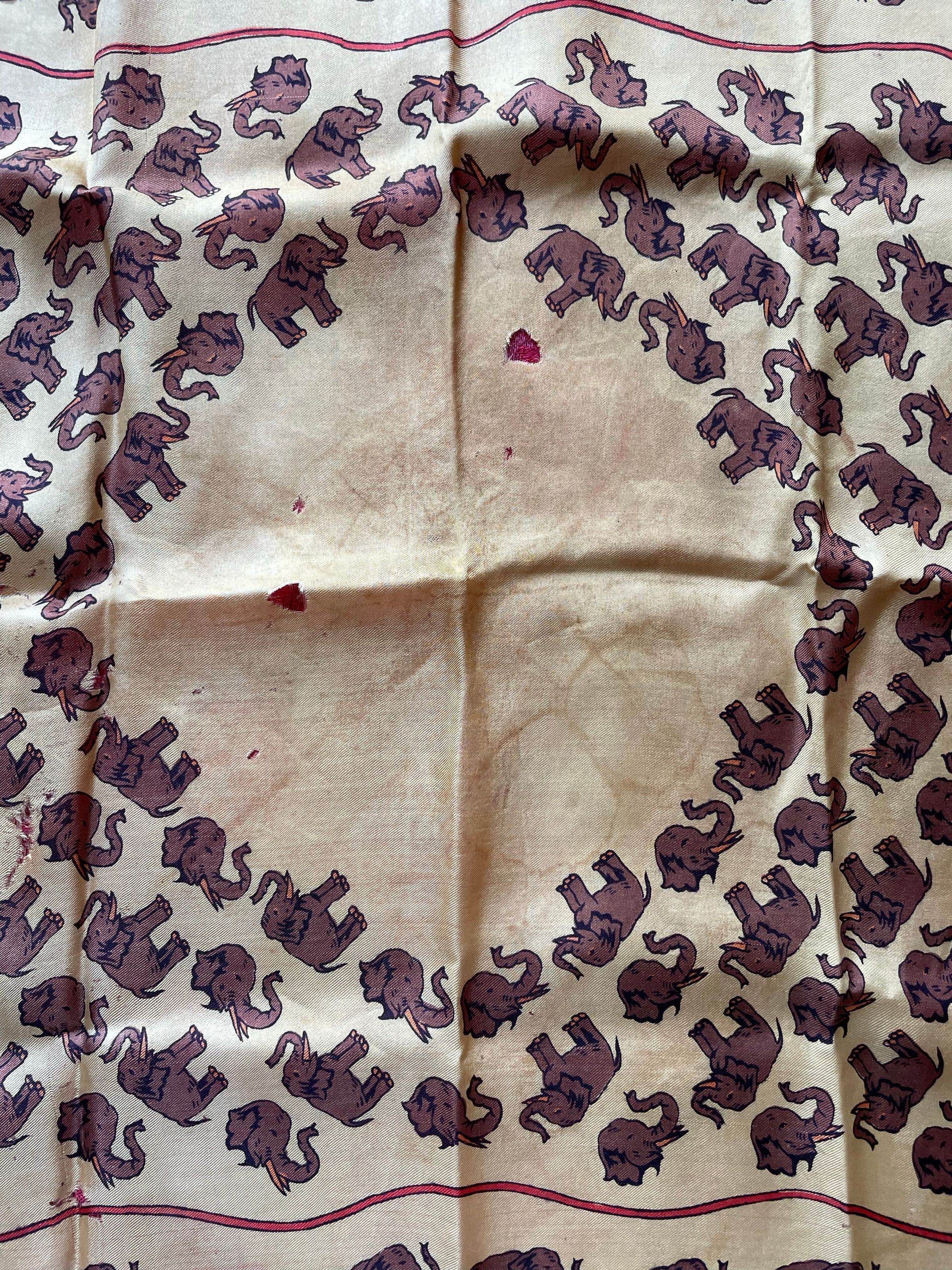 A cream scarf with a pattern consisting of brown elephants and an orange trim. Some elephants appear with their whole bodies, while others are just heads. There are some holes and light staining.Color