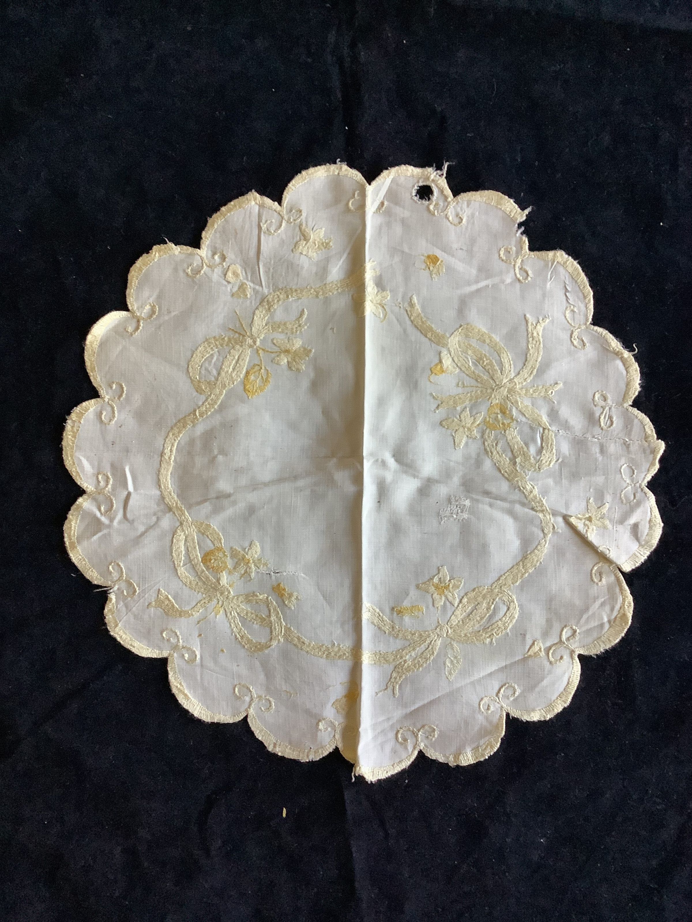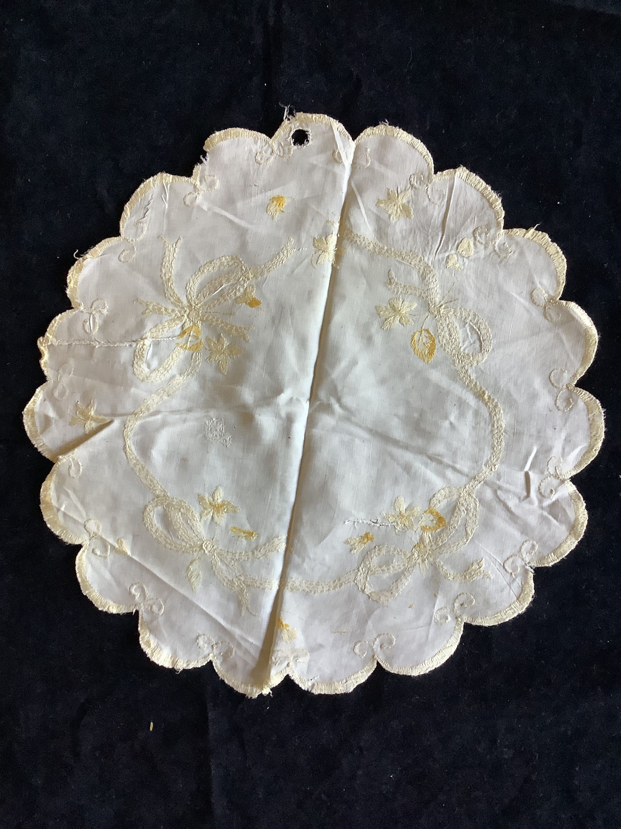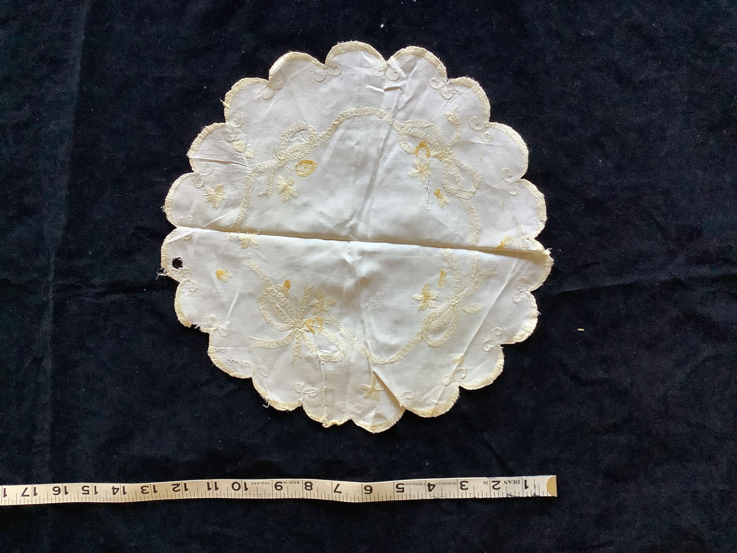 This is a cotton doily with yellow and white embroidery. This has been mended multiple times because of rips and holes