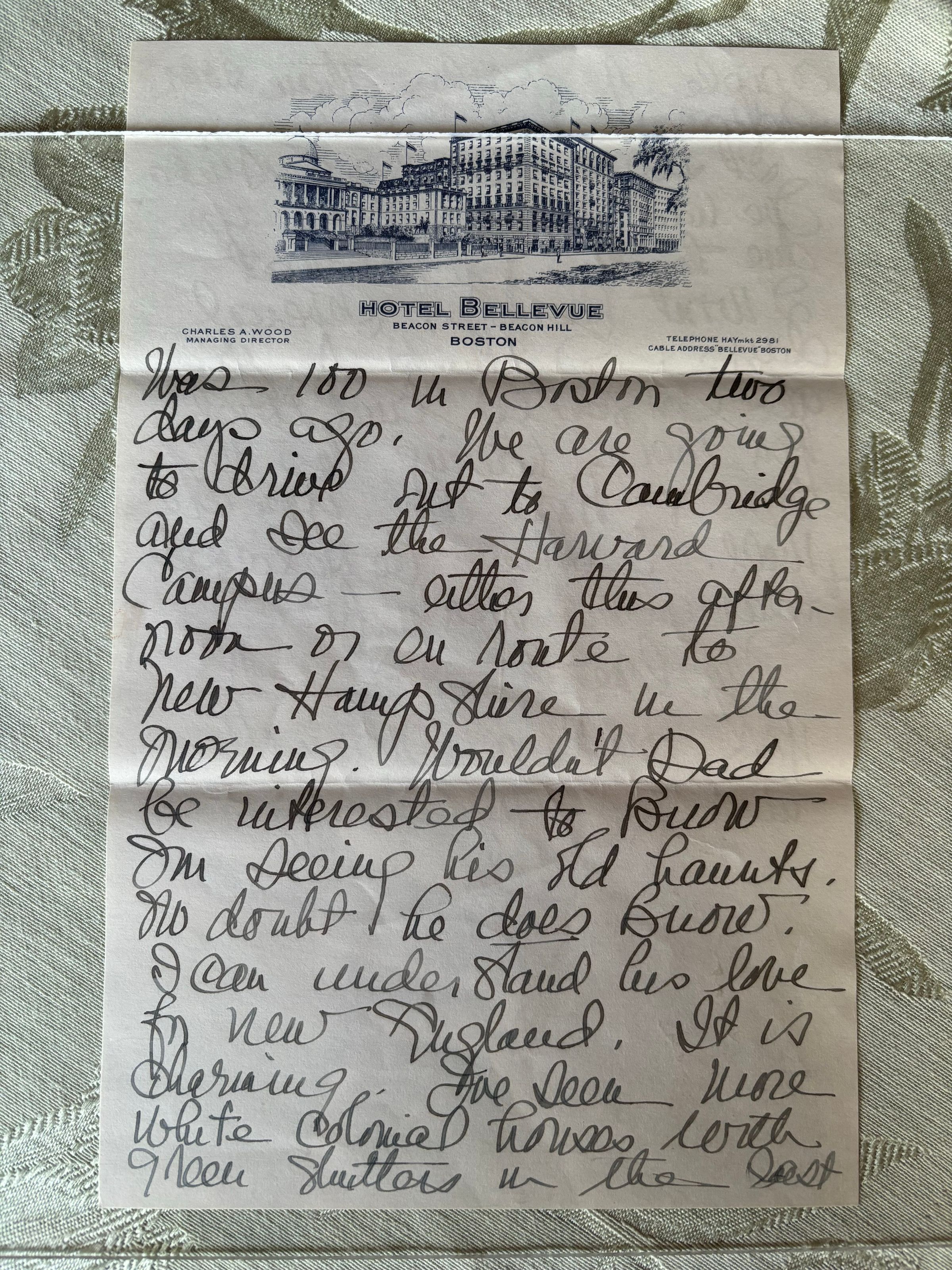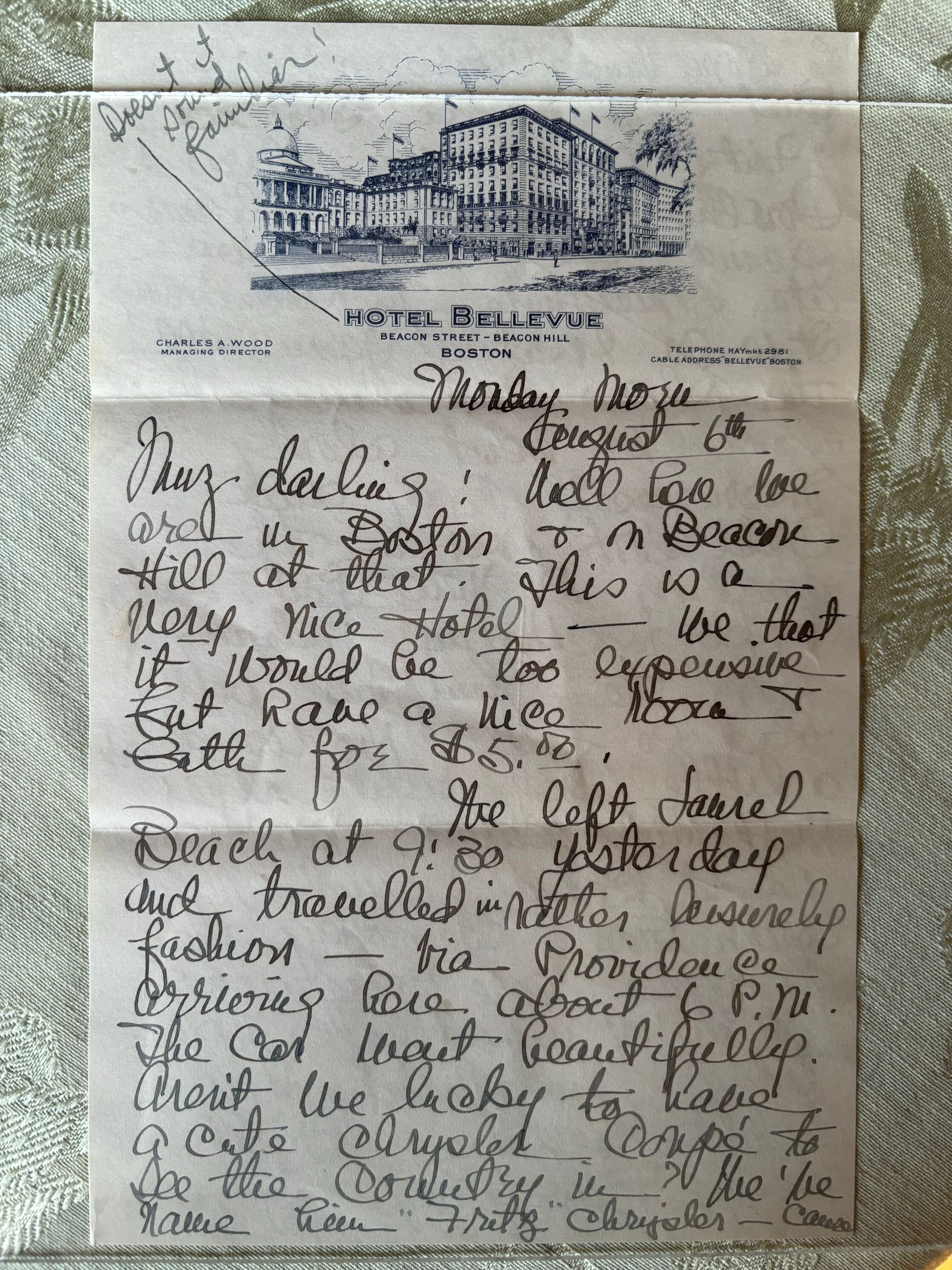 This letter is from when Emelita stayed at the Hotel Bellevue in Boston on Beacon St. She mentions how small the streets are in Boston and all the one way roads that bothered her. She is also was planning on visiting Harvard while she was in Boston.Create Date