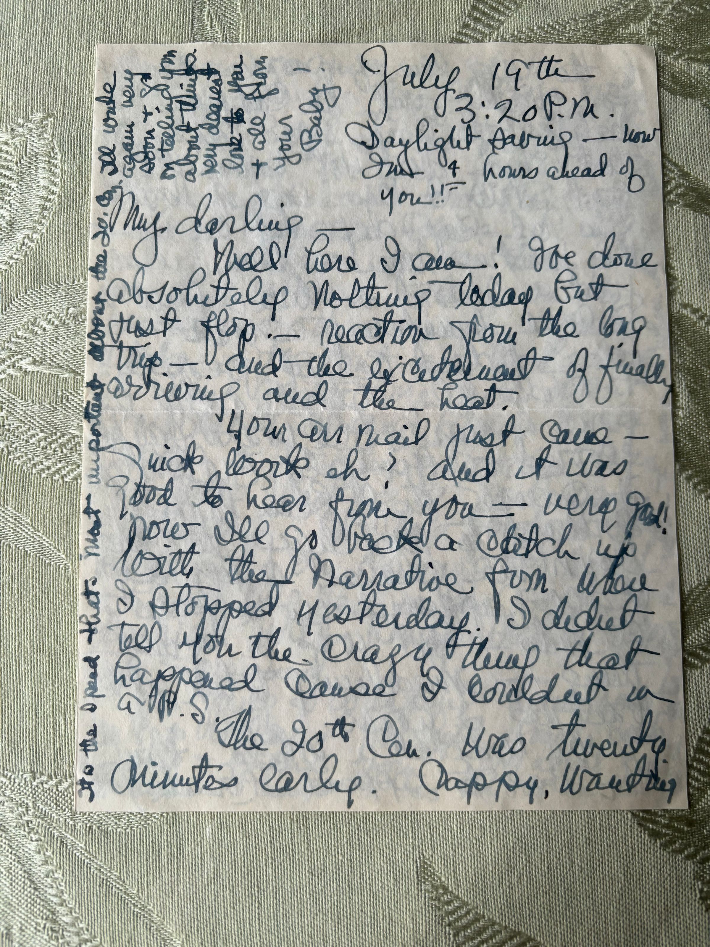 This is Emelita's letter to Emma when she went through Connecticut, she mentions that it was daylight savings on July 19th, and "now just 4 hours ahead of you!!"Create Date