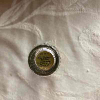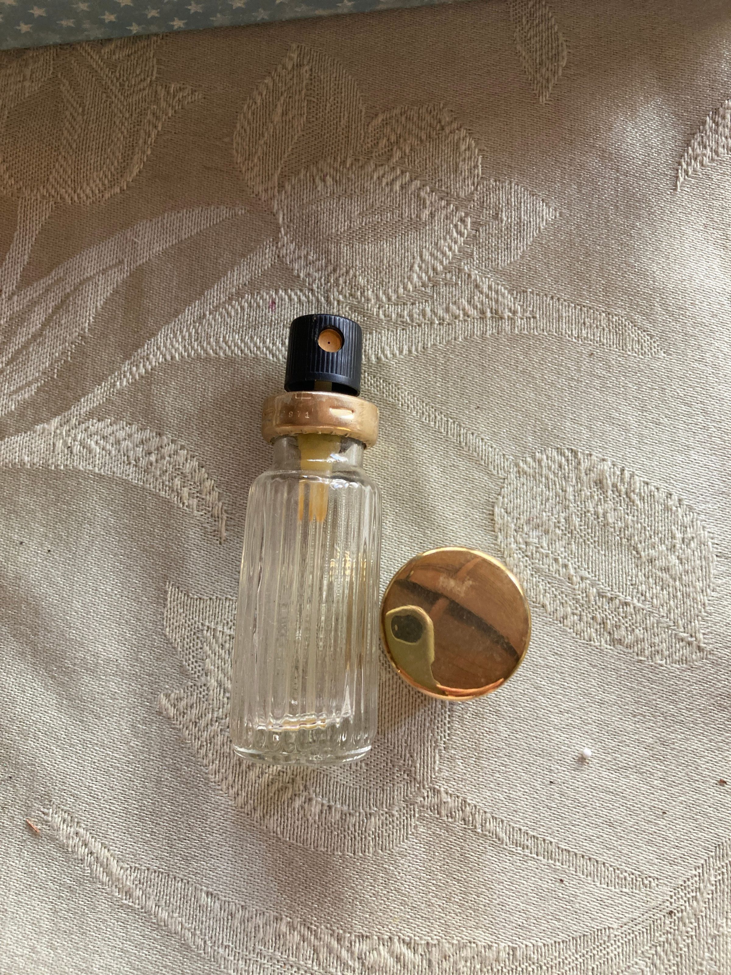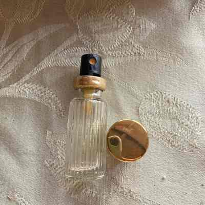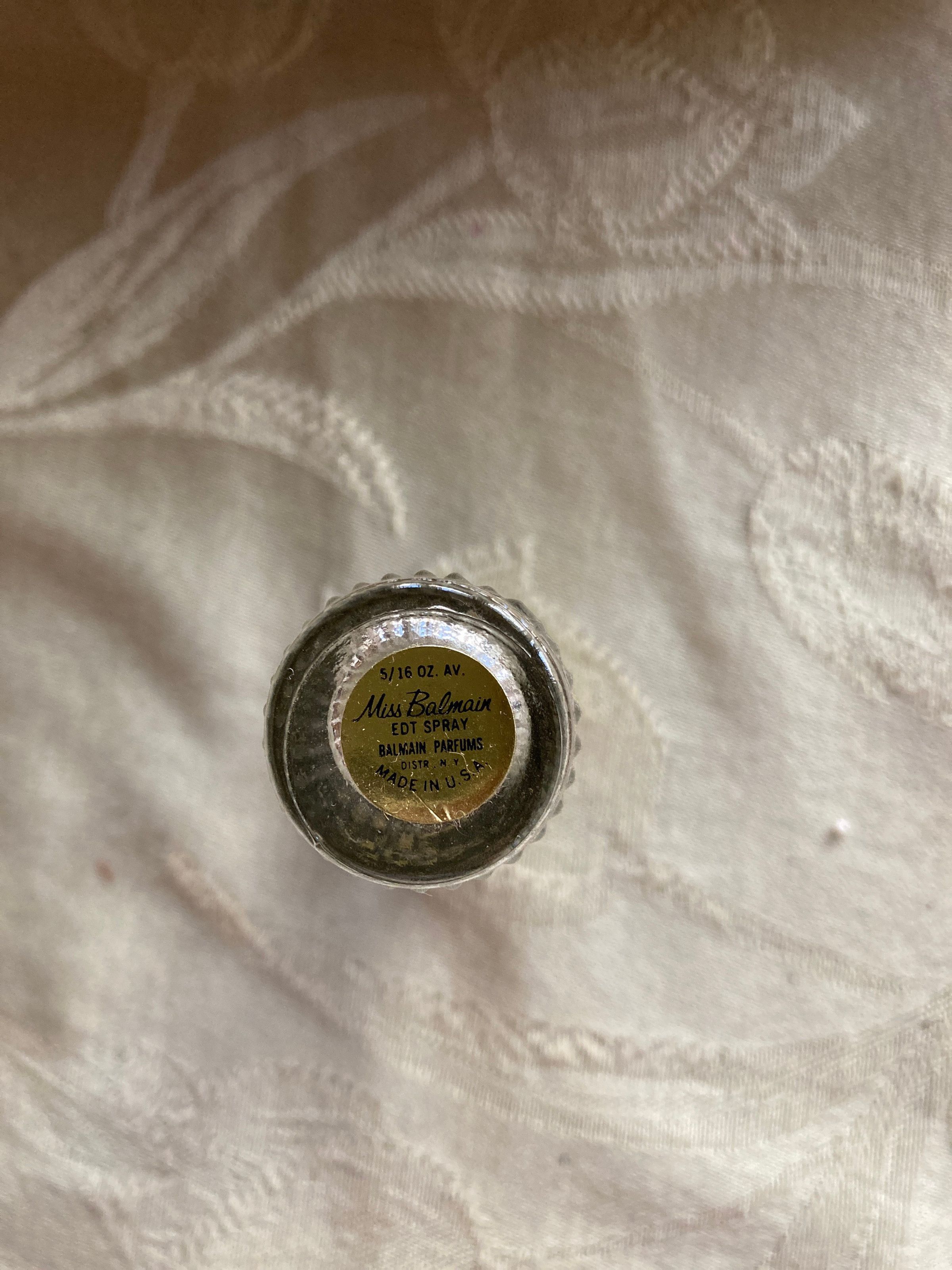 This is a clear glass bottle (5/16oz) with a gold top that has a label on the bottom that says “Miss Balmain, EDT spray, Balmain Perfumes, Distr. NY, Made in the USA.”