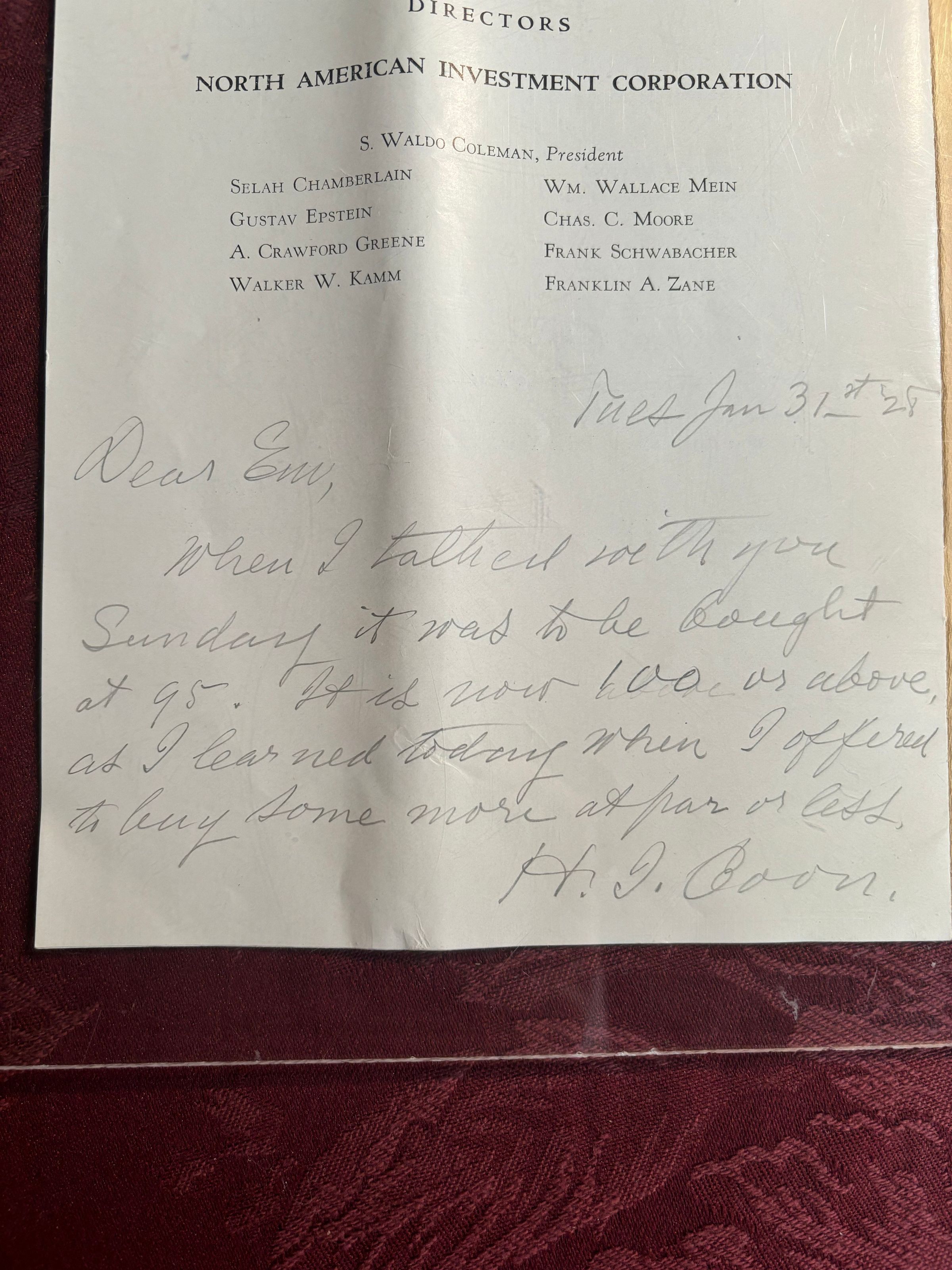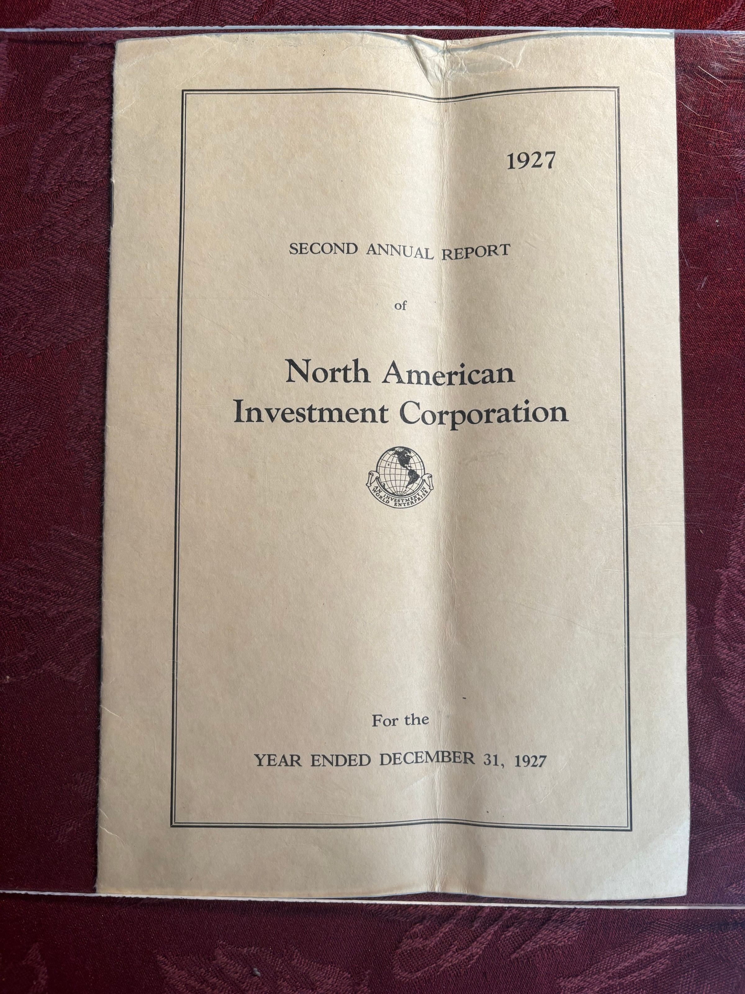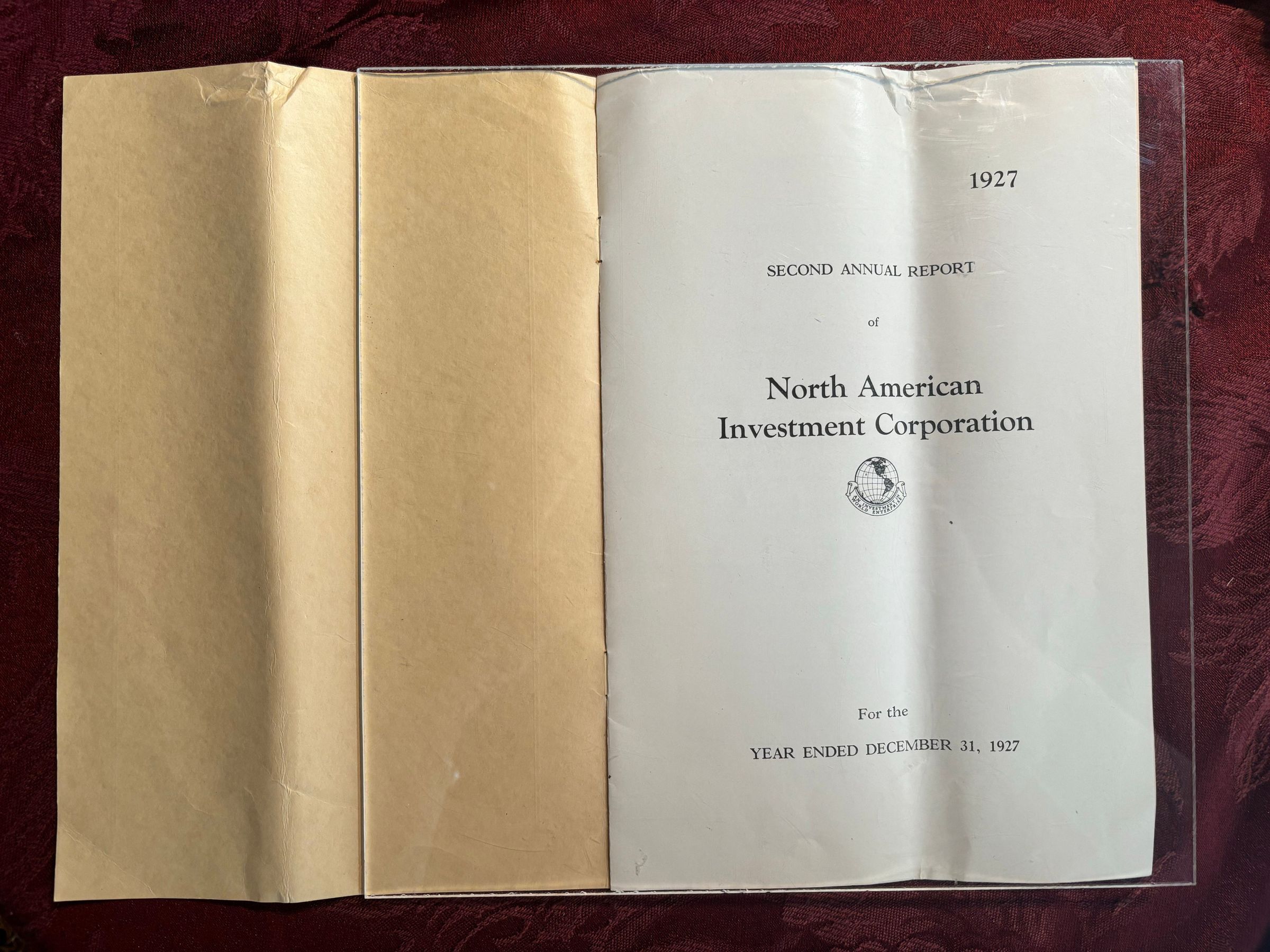 A envelope to "Mrs. A. H. Cohen" from the The Penn Mutual Life Insurance Company. Includes two pamphlets, "Second Annual Report of North American Investment Corporation" and "The Investment Trust." The envelope has a note that says it is from H. I. Coon, and a note from him in the back of one of the pamphlets. The contents are from 1927-1928. H I Coon was Emma's brother in law.Inscription/Signature/Marks
