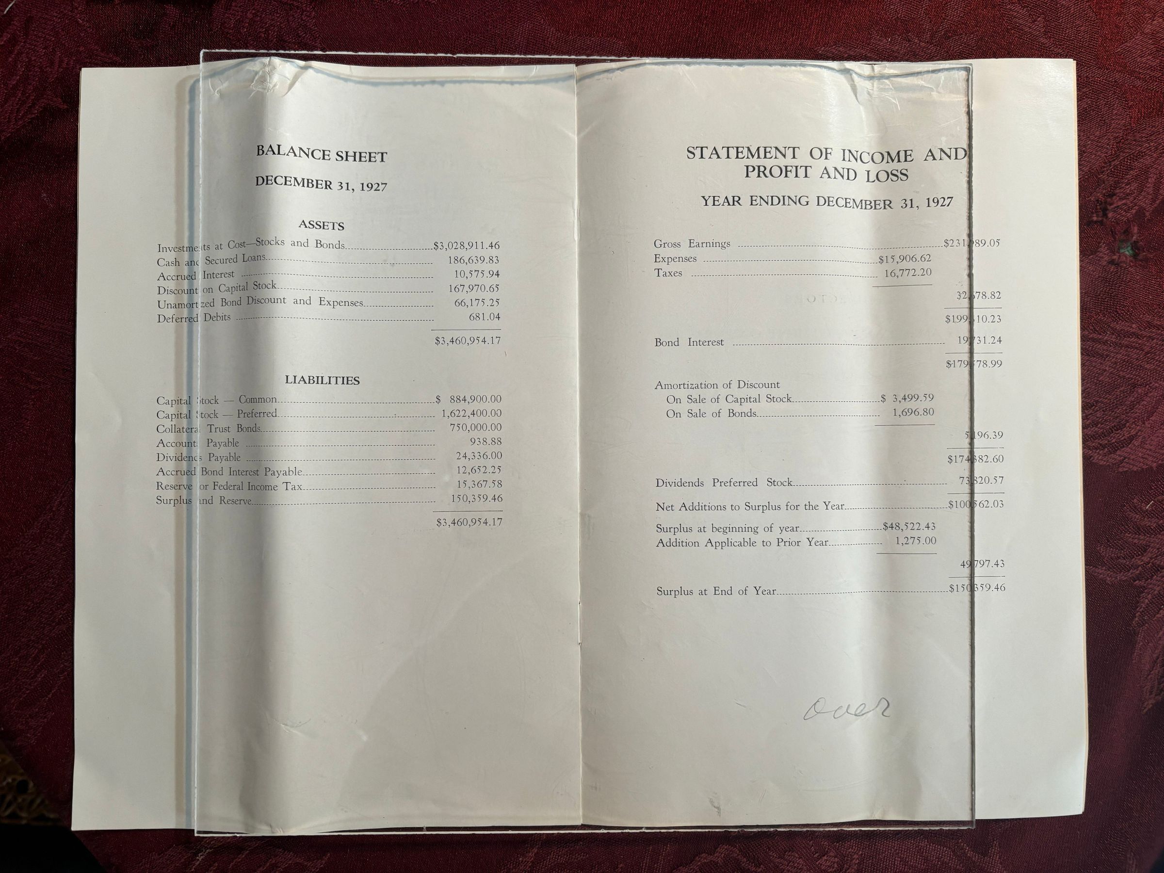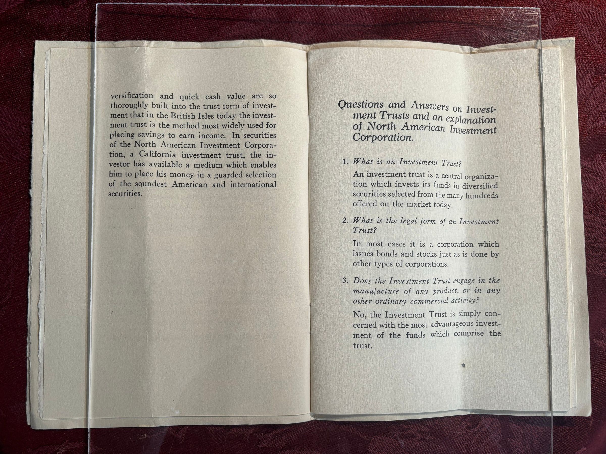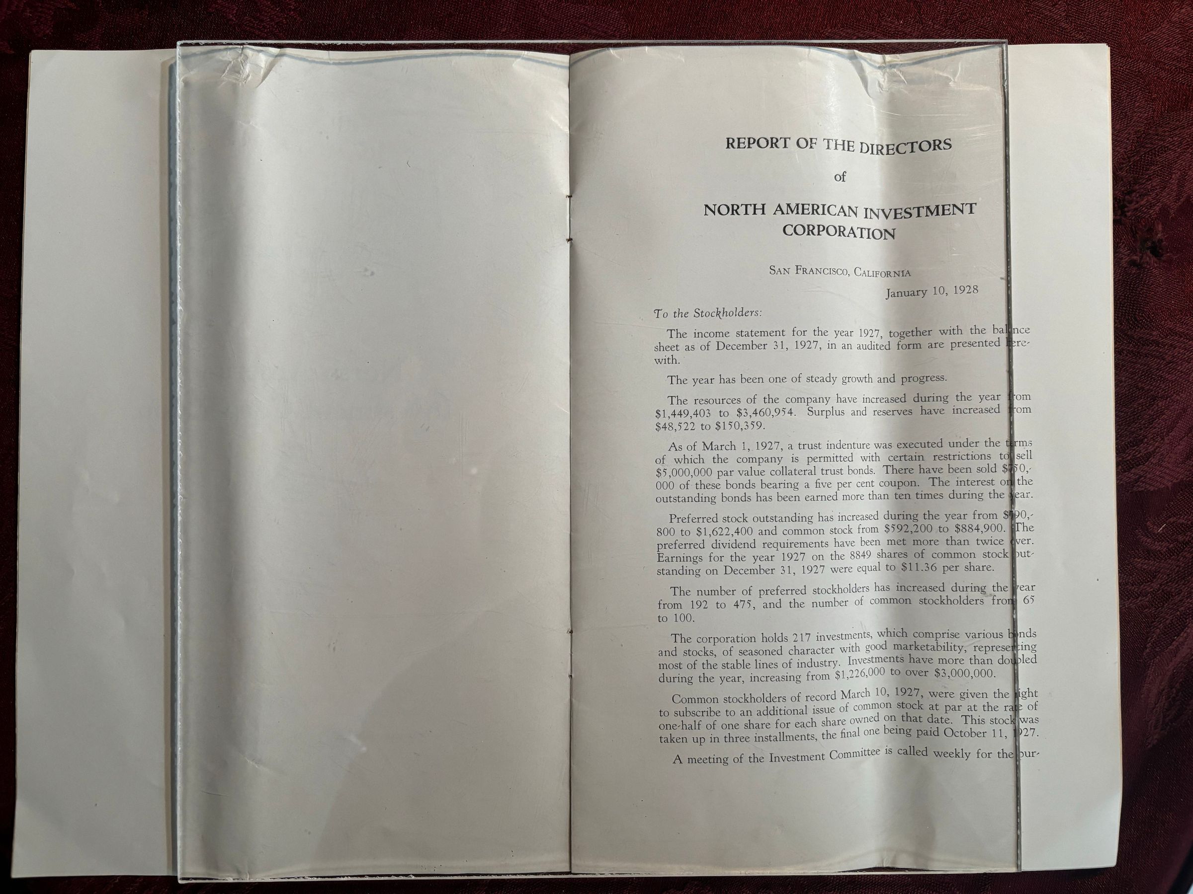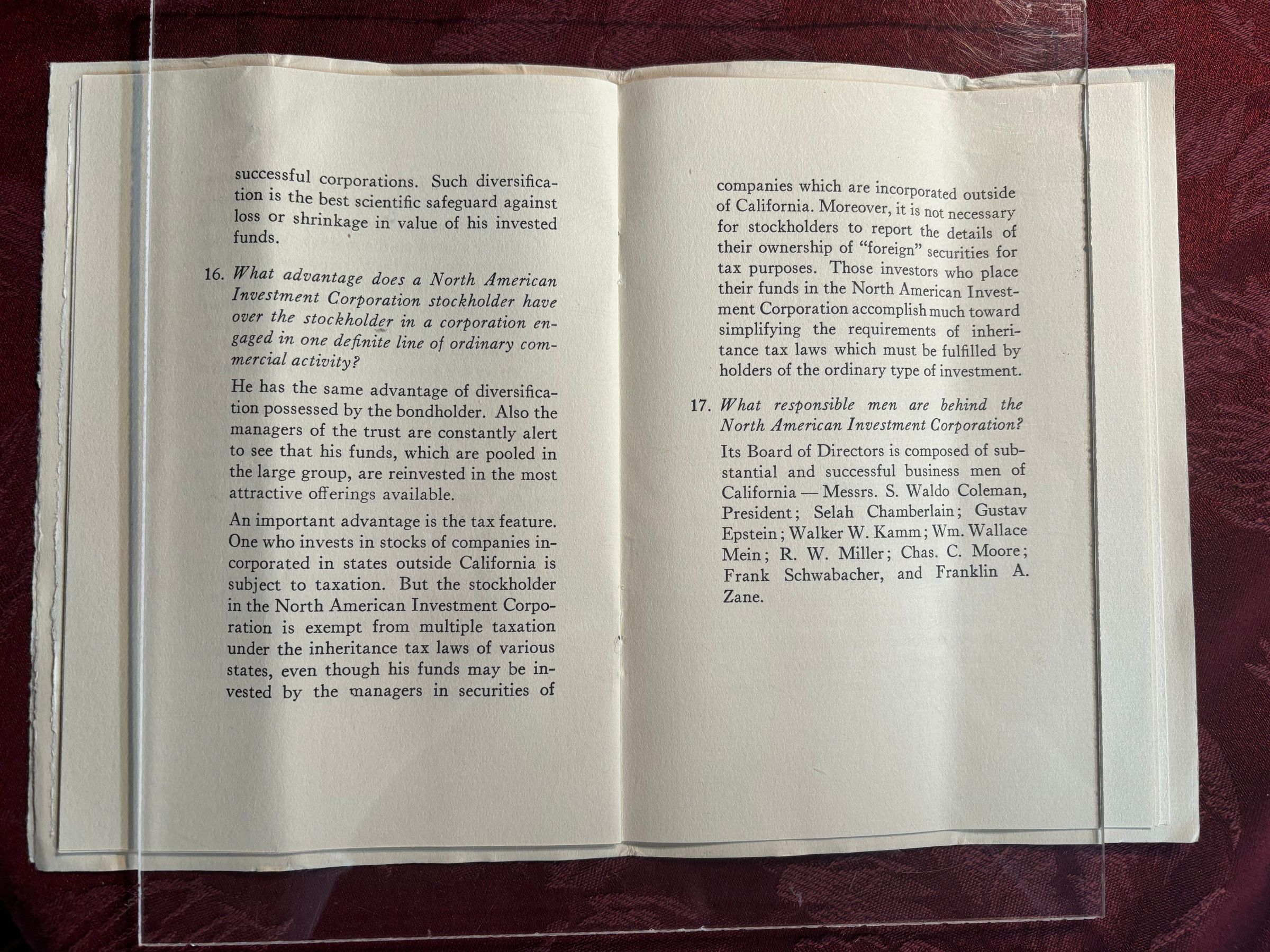 A envelope to "Mrs. A. H. Cohen" from the The Penn Mutual Life Insurance Company. Includes two pamphlets, "Second Annual Report of North American Investment Corporation" and "The Investment Trust." The envelope has a note that says it is from H. I. Coon, and a note from him in the back of one of the pamphlets. The contents are from 1927-1928. H I Coon was Emma's brother in law.Inscription/Signature/Marks