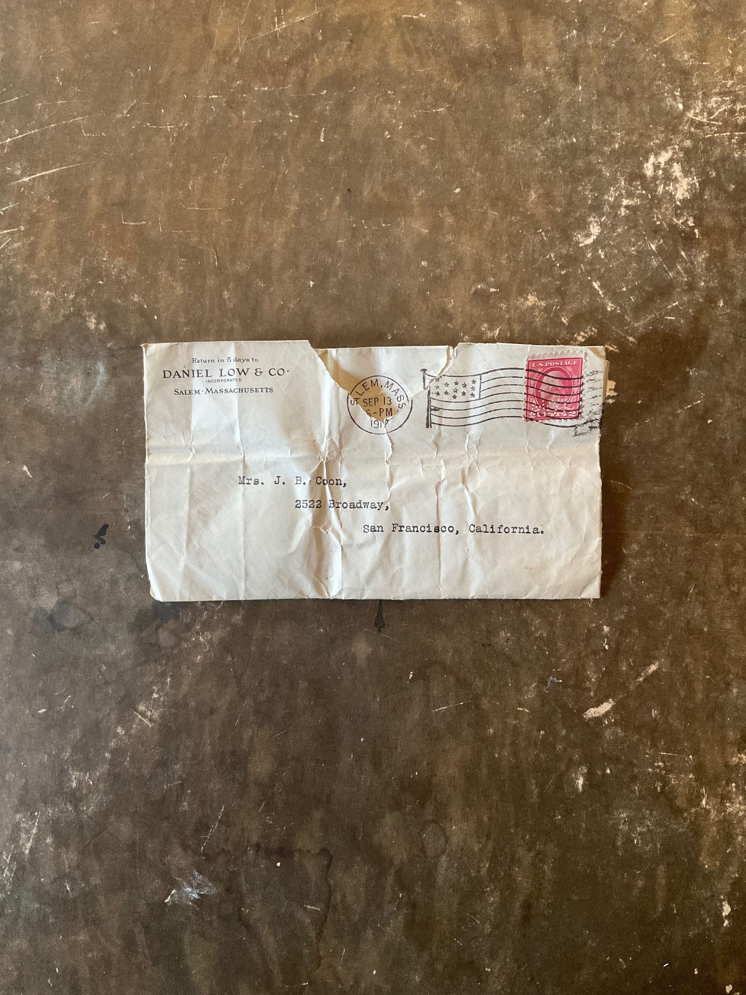 An envelope from Daniel Low & Co. addressed to Mrs. J.B. Coon. The envelope was sent from Salem, Massachusetts and arrived to an address in San Francisco, California. Inside the envelop there are a pair of glasses with no frame and a shriveled up paper. The paper has a lot of written numbers and unidentifiable words.Collection
