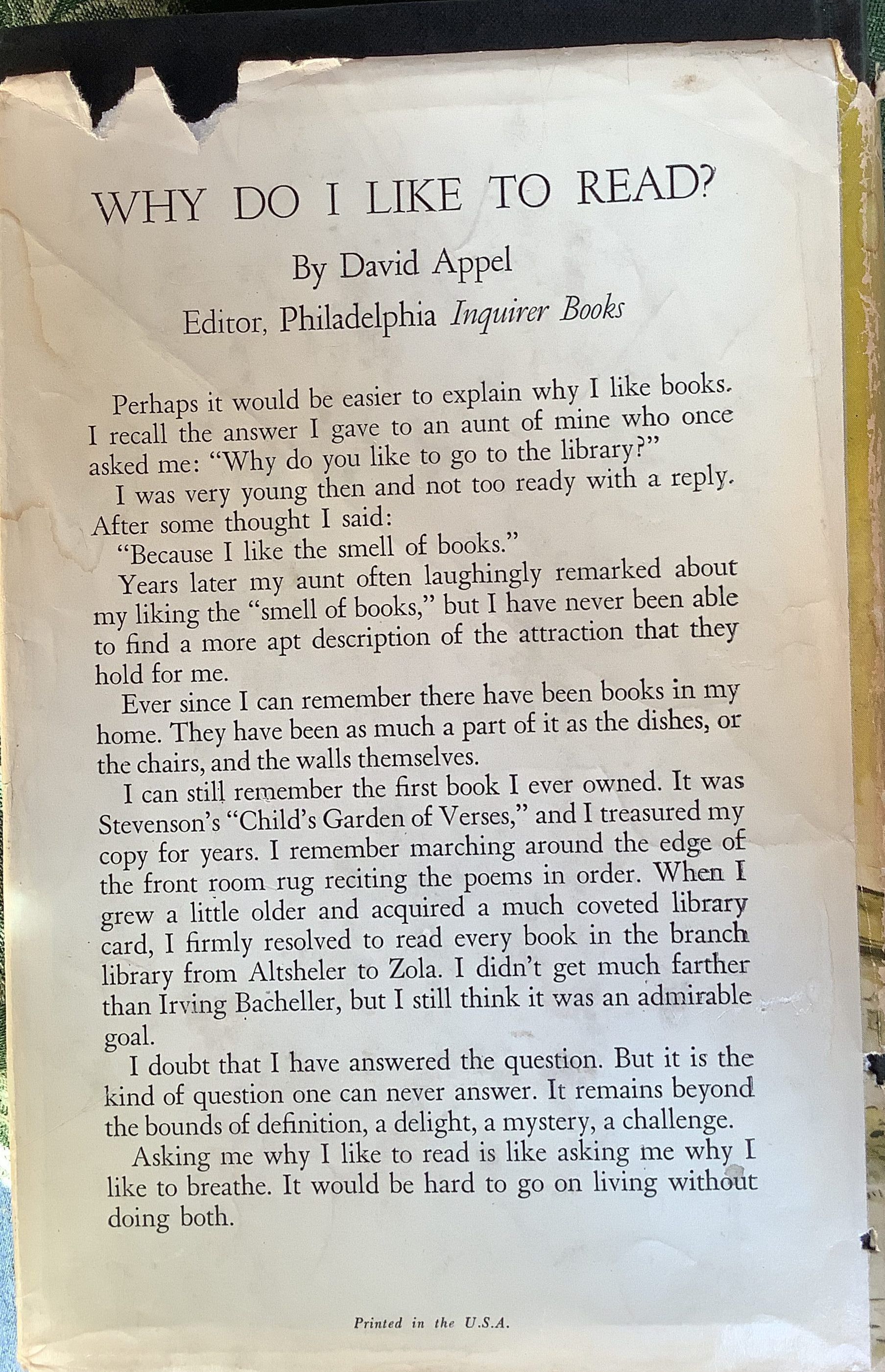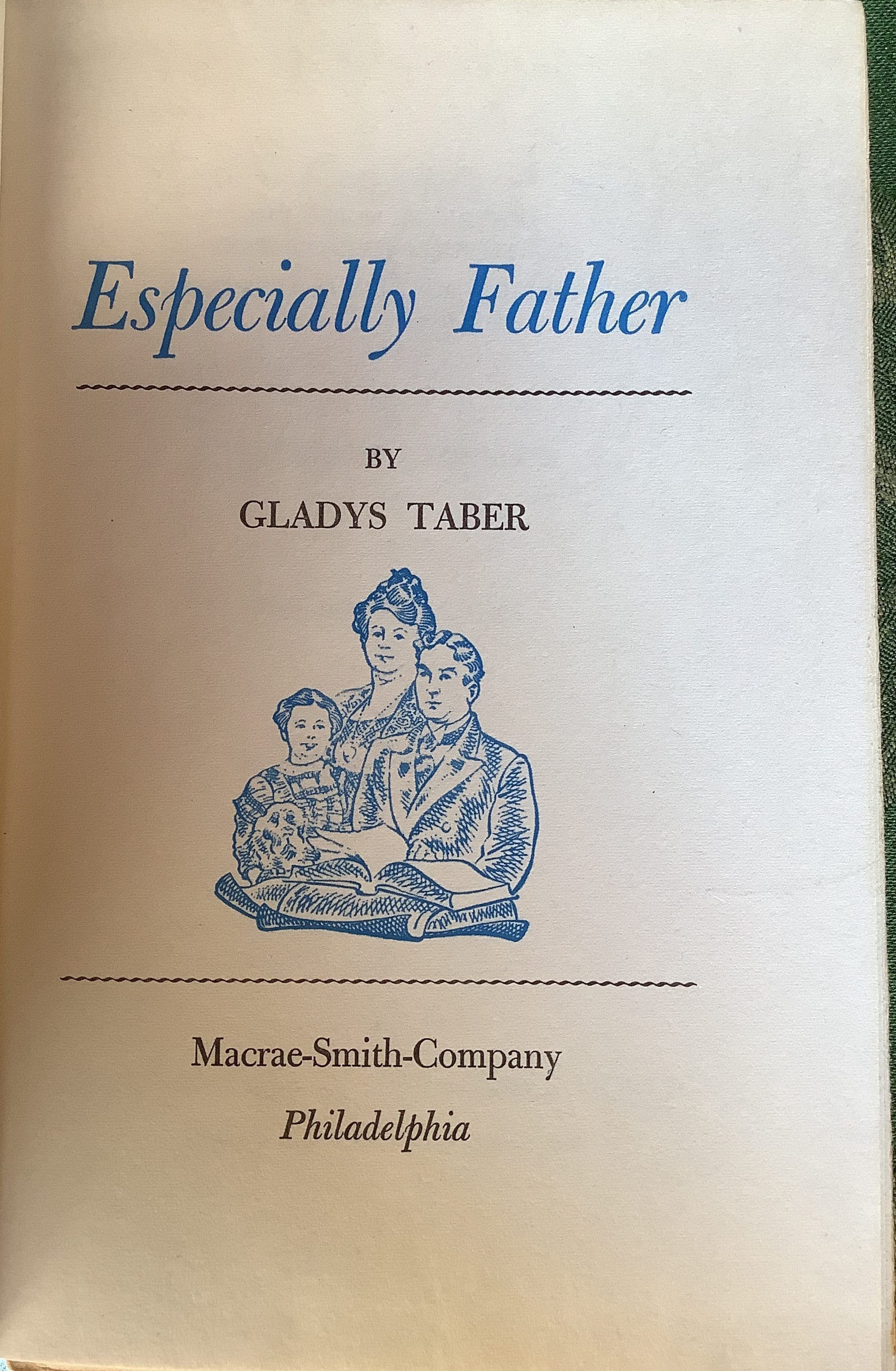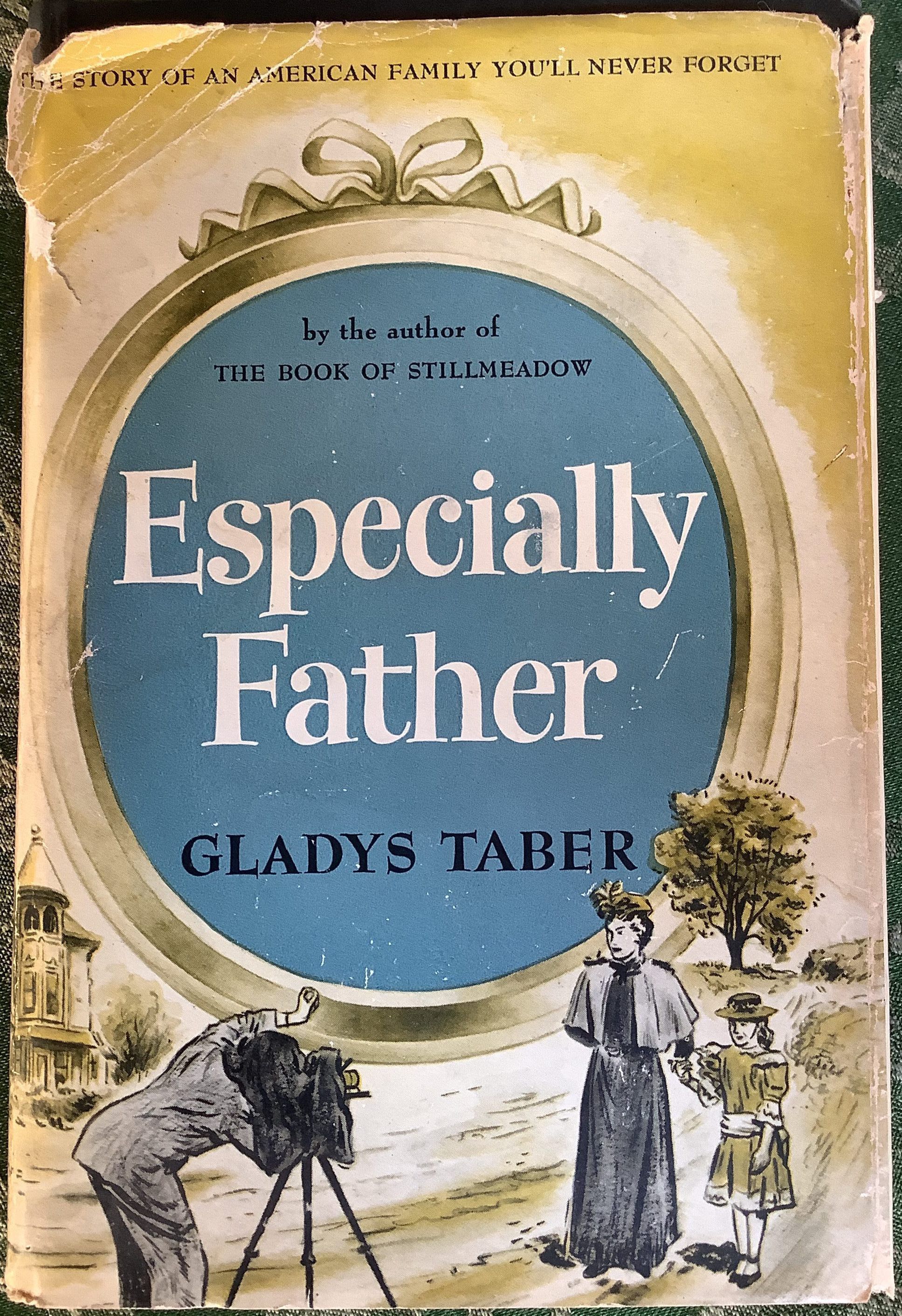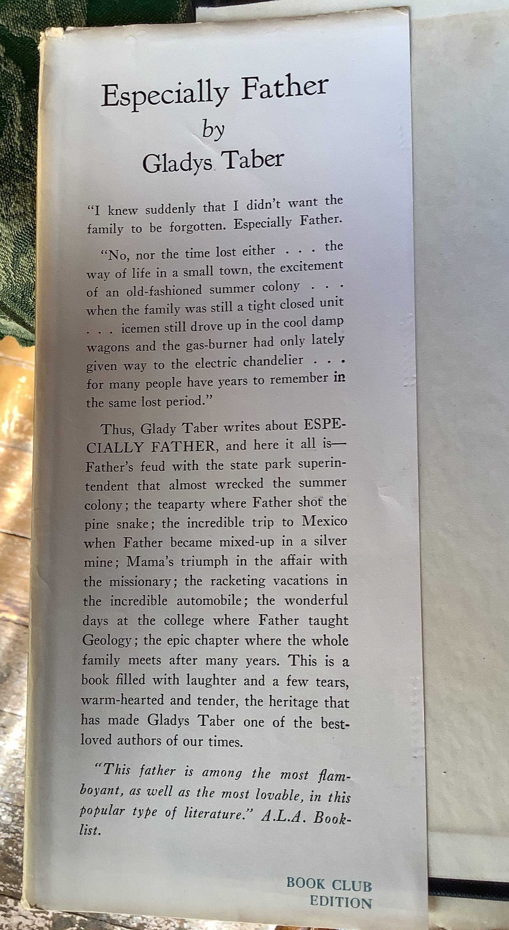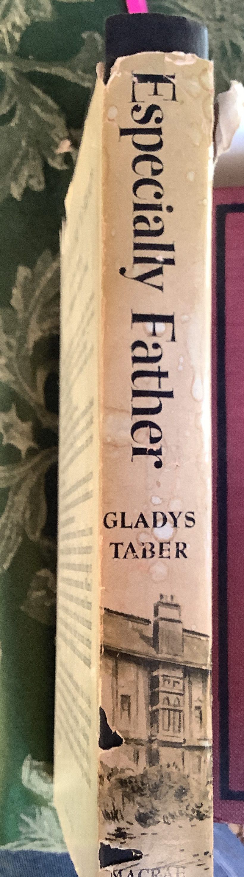 Memoir recounting the author’s experiences with her father; “Gladys Taber writes about ESPECIALLY FATHER, and here it all is—Father’s feud with the state park superintendent that almost wrecked the summer colony; the tea party where Father shot the pine snake; the incredible trip to Mexico when Father became mixed up in a silver mine; Mama’s triumph in the affair with the missionary; the racketing vacations in the incredible automobile; the wonderful days at the college where Father taught Geology; the epic chapter where the whole family meets after many years.” — book jacketInscription/Signature/Marks