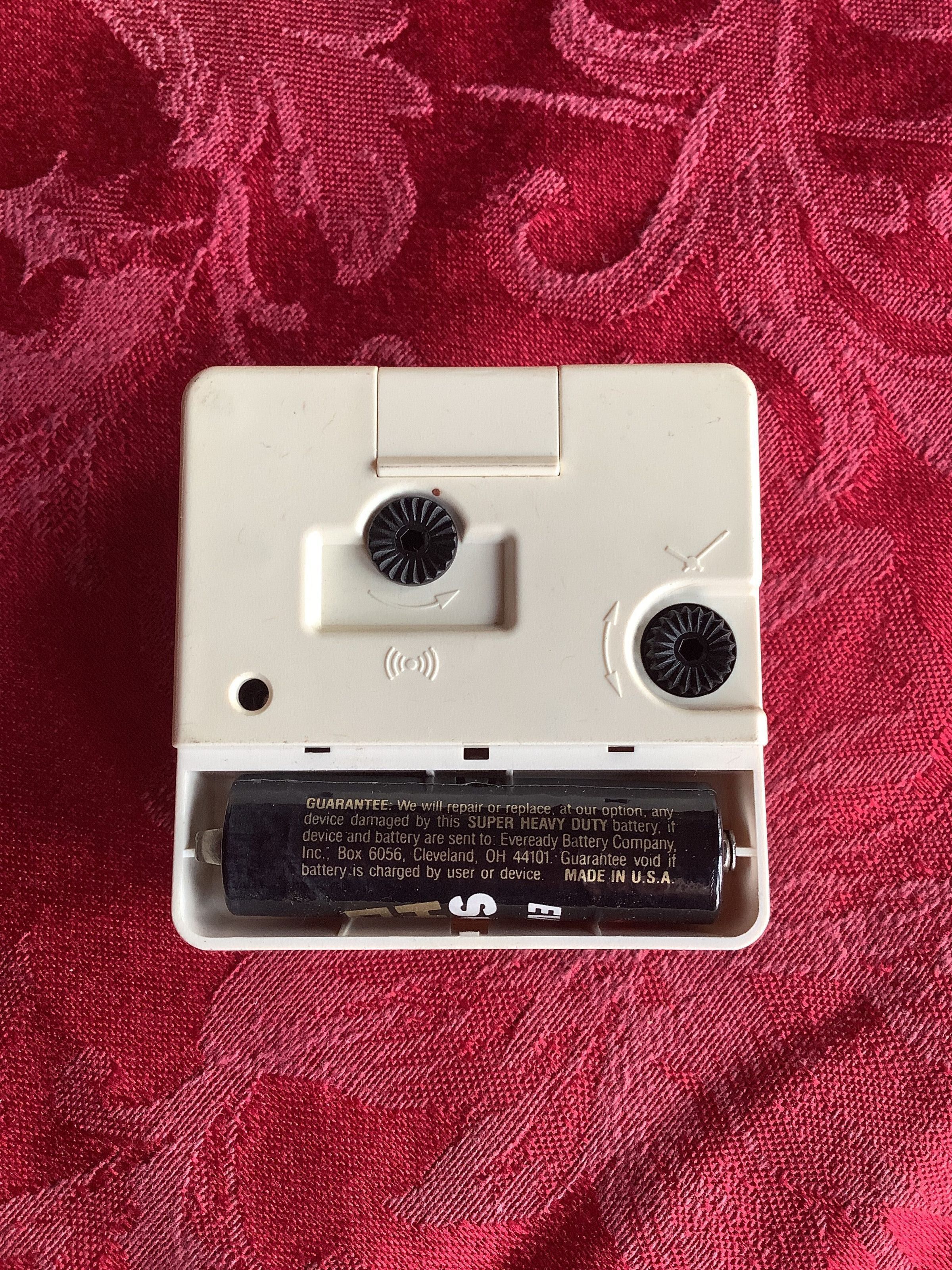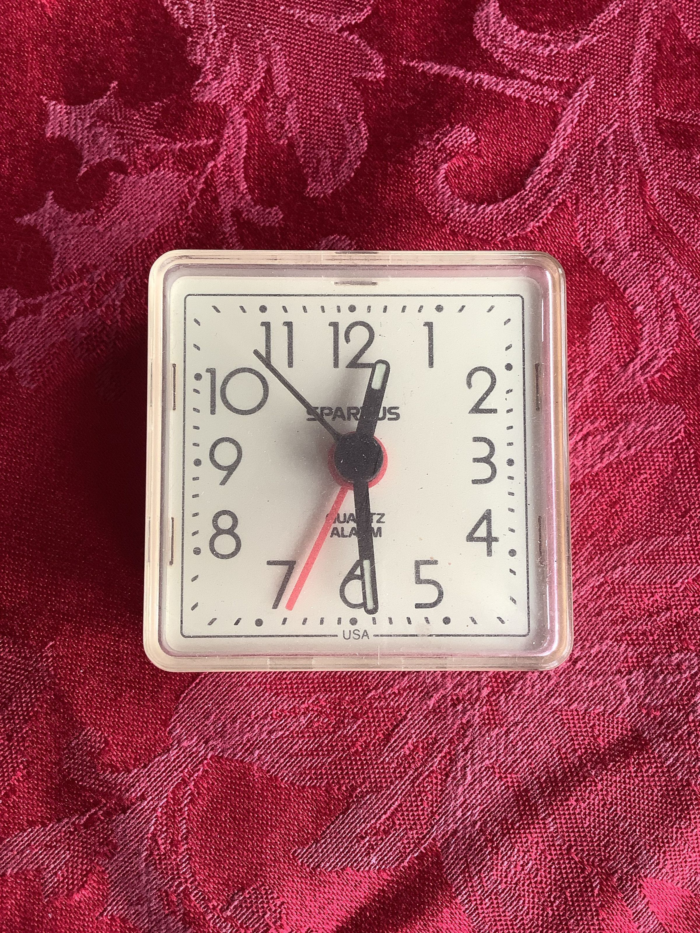 A small plastic Spartus clock that’s battery operated and has since stopped working. One piece of the plastic covering is missing on the back or might’ve broken off.Create Date