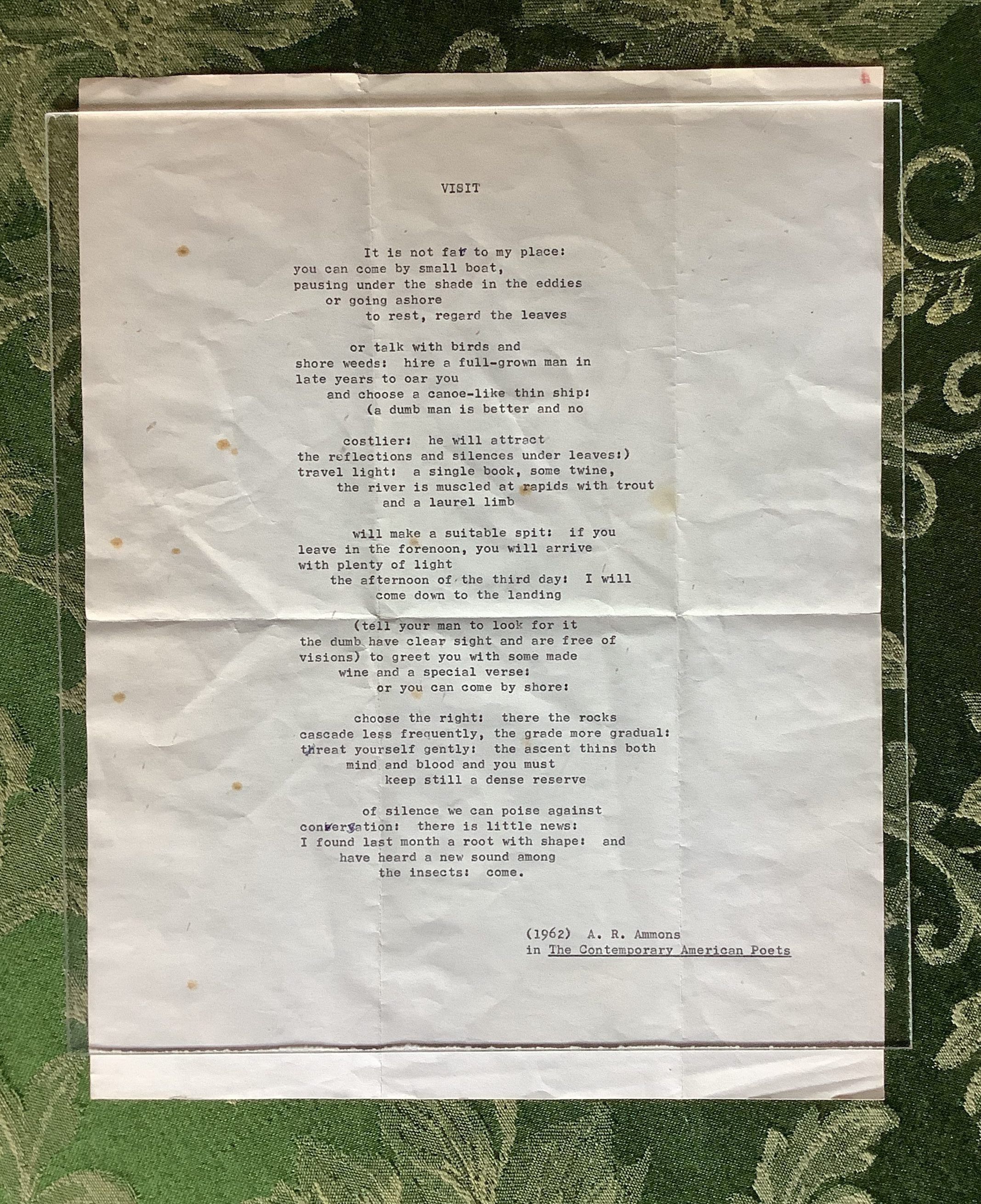 A poem titled the Visit written by A.R. Ammons in 1962. The poem was published in a book title The Contemporary American Poets