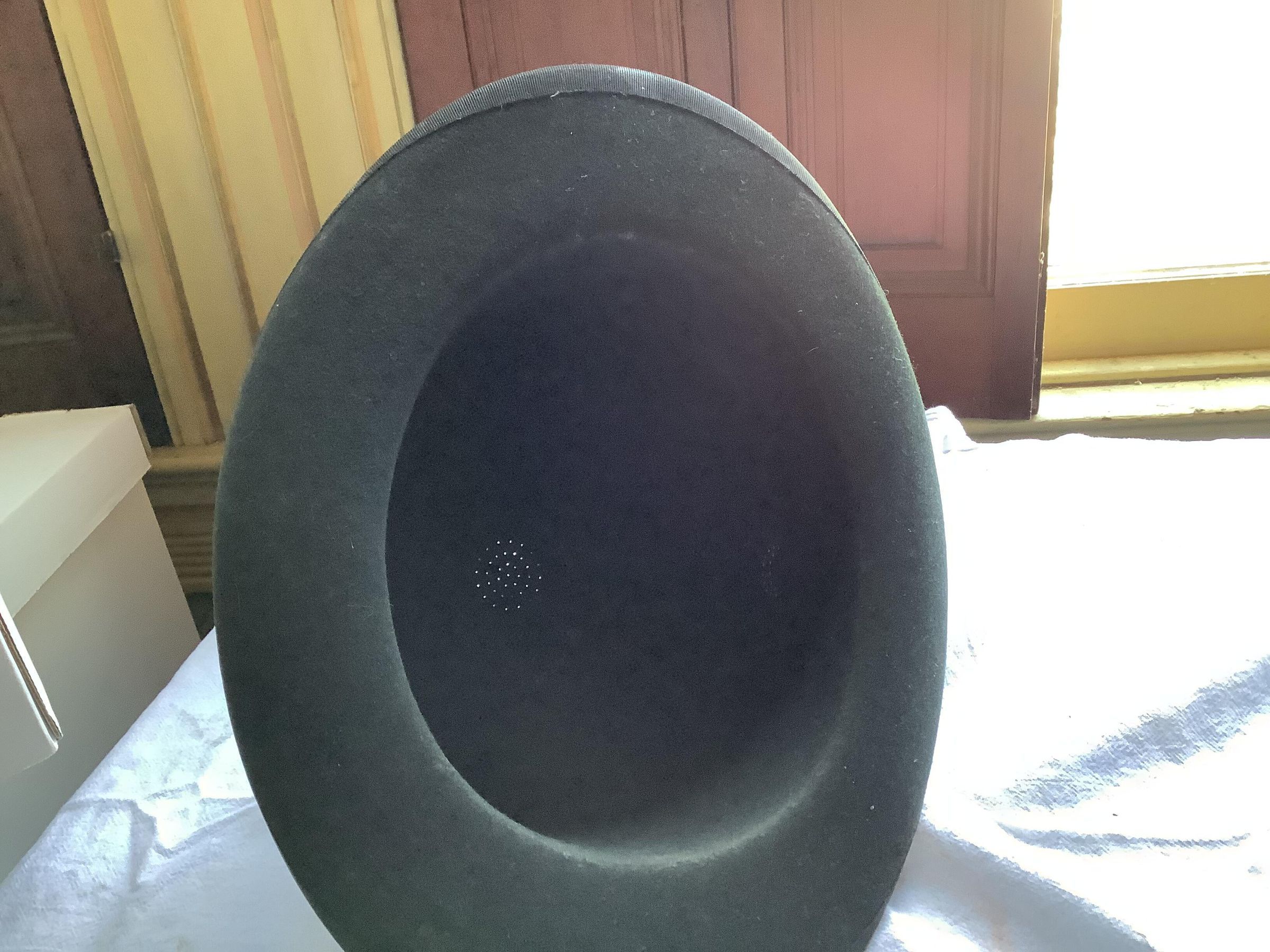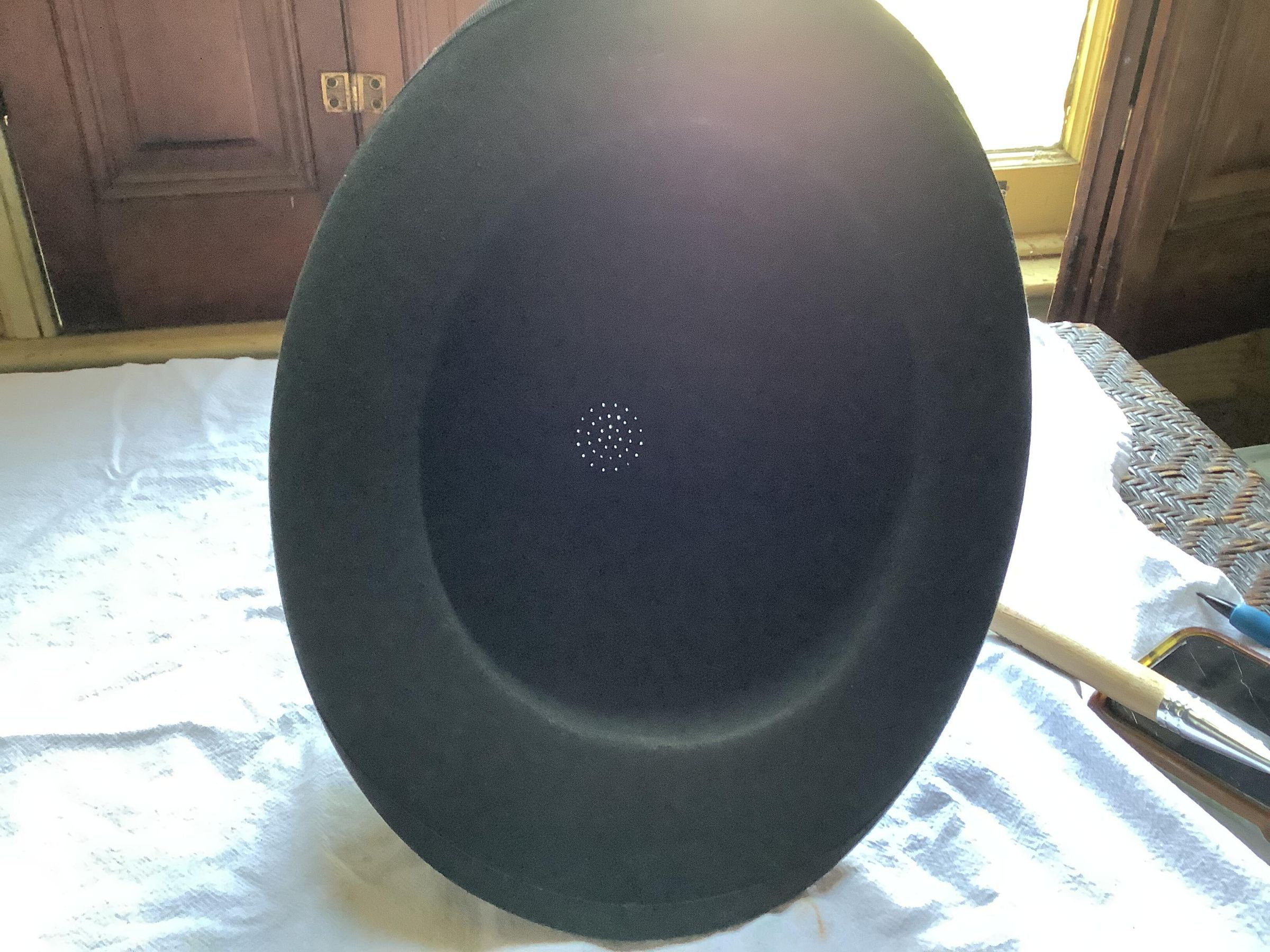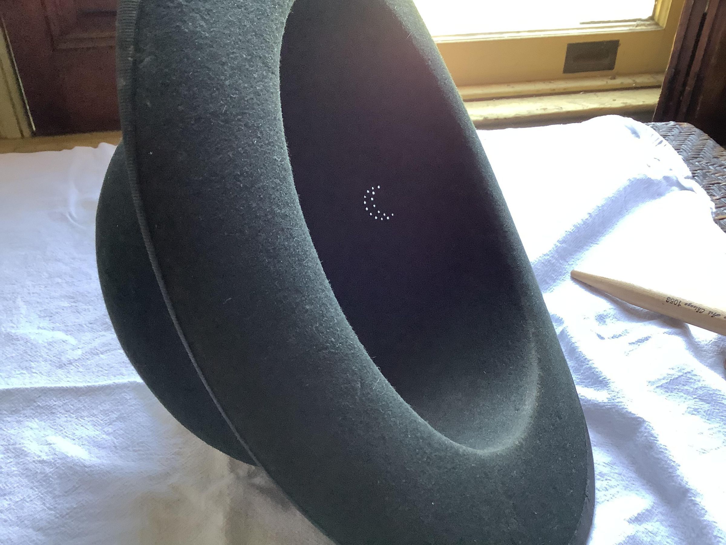 Dirty. Discoloration light stain on grosgrain ribbon on inner brim. Faint moth chews on edge of inside crown.Create Date