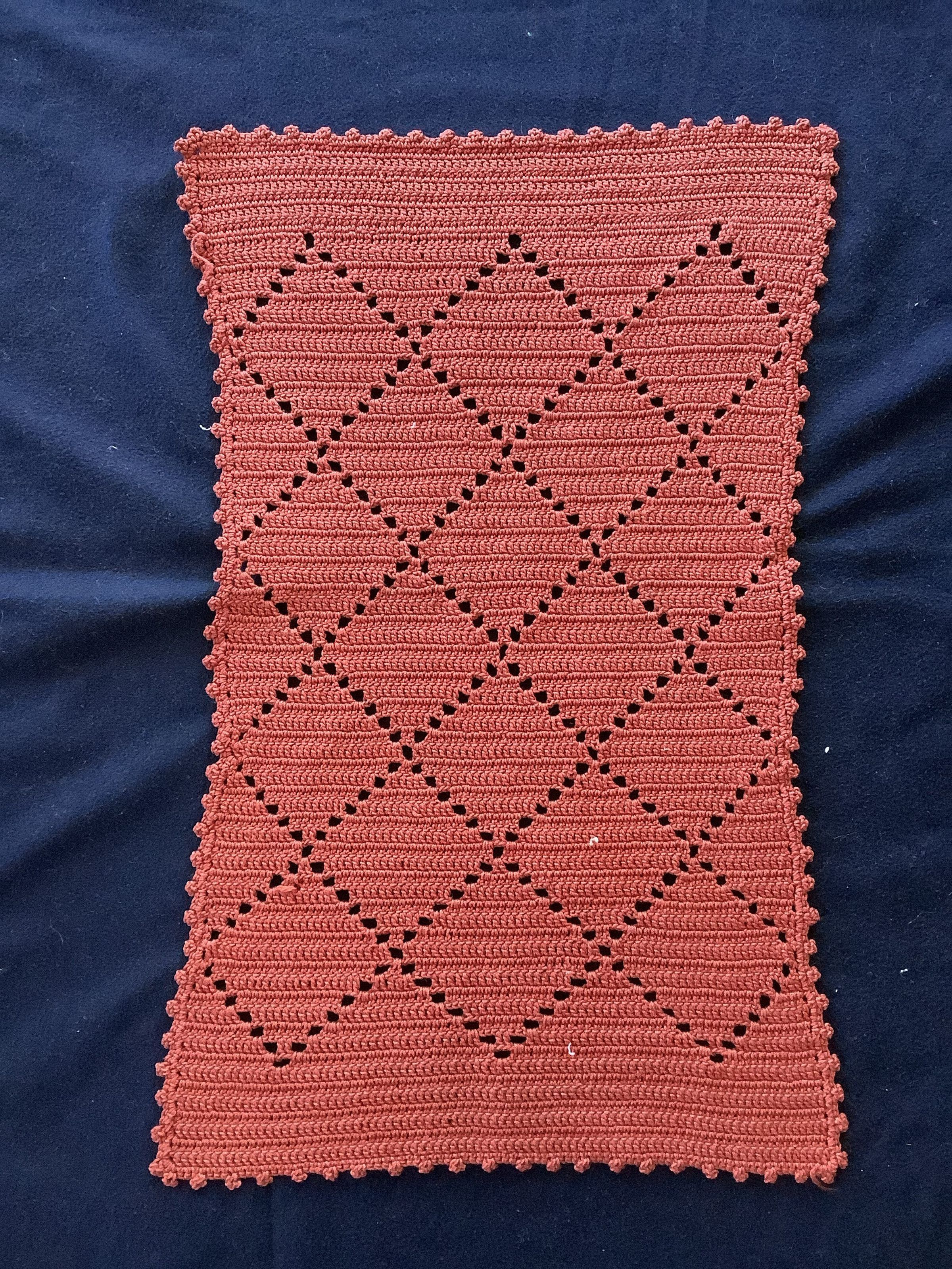 This is a crocheted textile in a rectangle shape, with a diamond design. It was possibly used as an antimacassar.