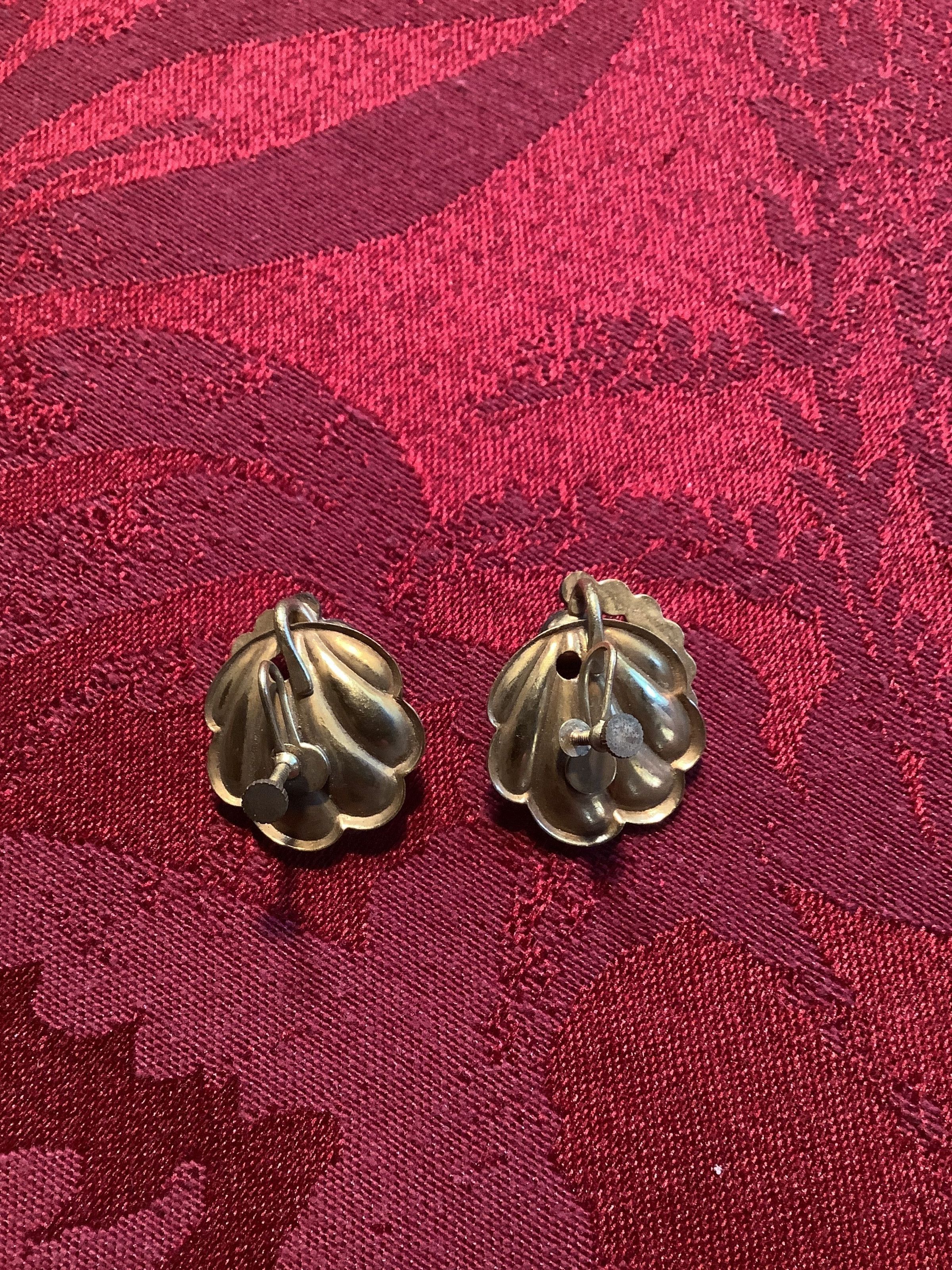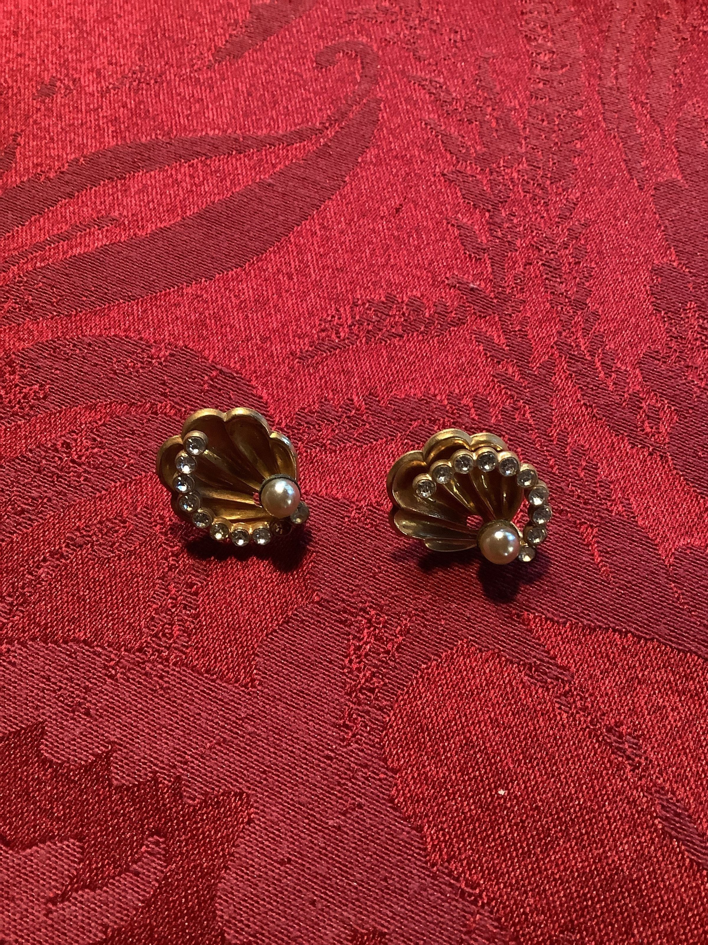 Pair of screw back earrings with faux pearl and clear rhinestones set into a gold toned metal shaped like a seashell.Collection