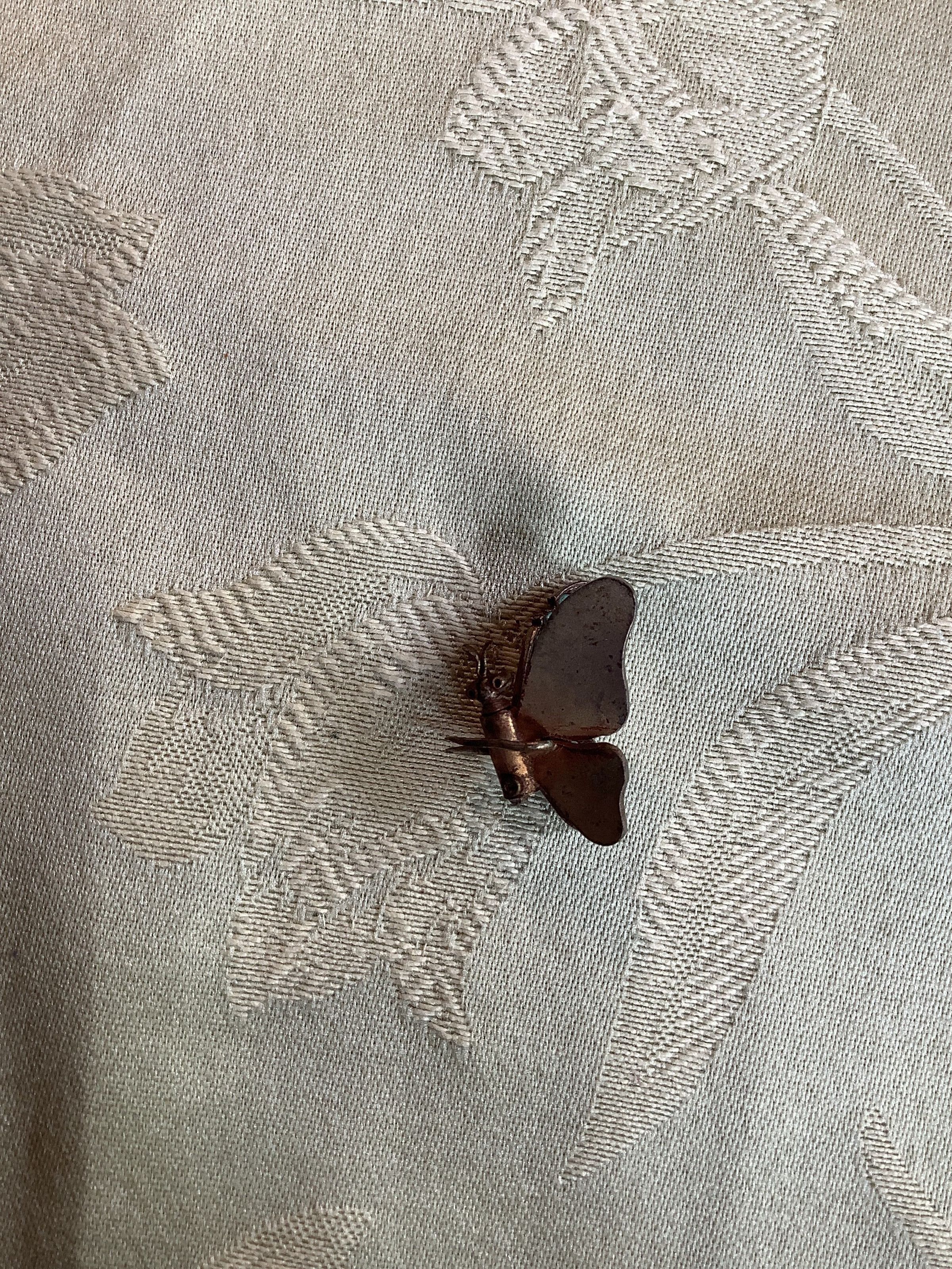 Silver toned butterfly pin with turquoise and pearl colored small round stones set into the two wings. This butterfly has a small face with antenna, and a cylinder shaped body that has two pins that look like arms reaching out from the body.Collection