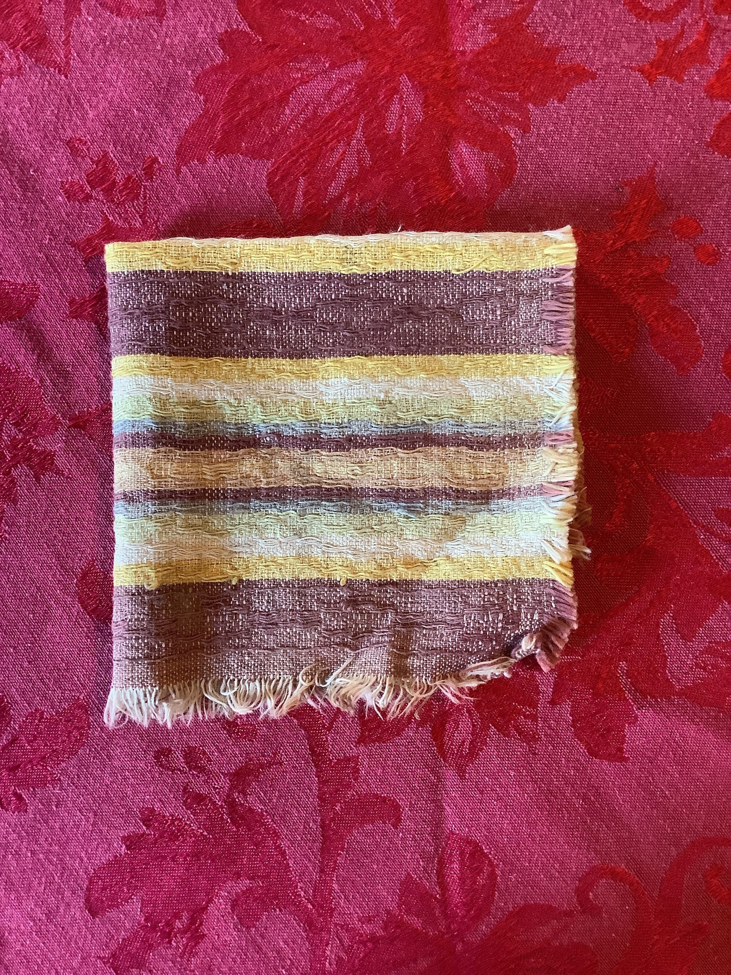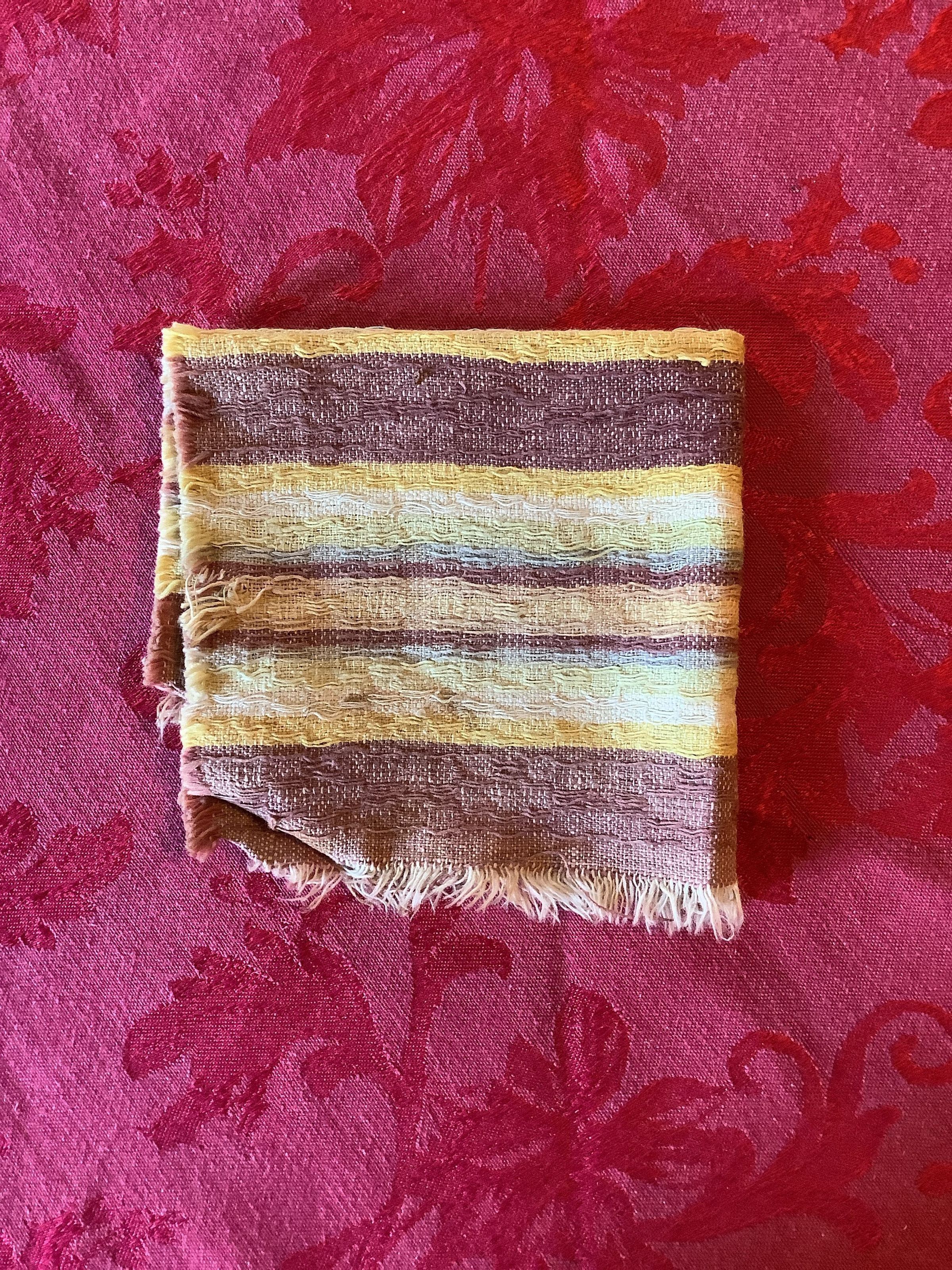 A brown, green, yellow, white, and blue striped handkerchief with fringe edges.