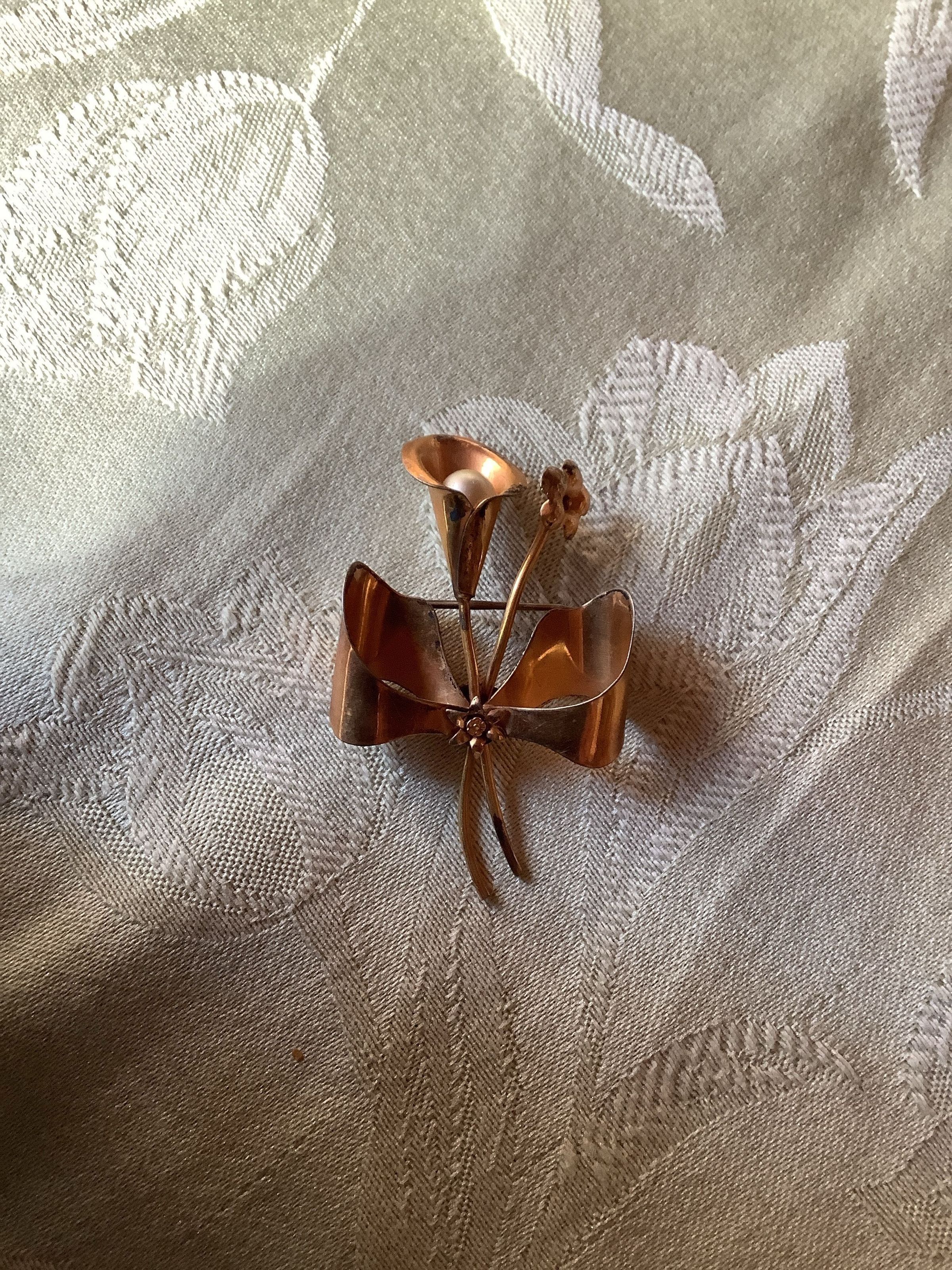 A brooch with a lily and petaled flower tied with a bow. The lily has a faux pearl center. Probably sterling silver with gold fill. Likely dating back to the 1930s.