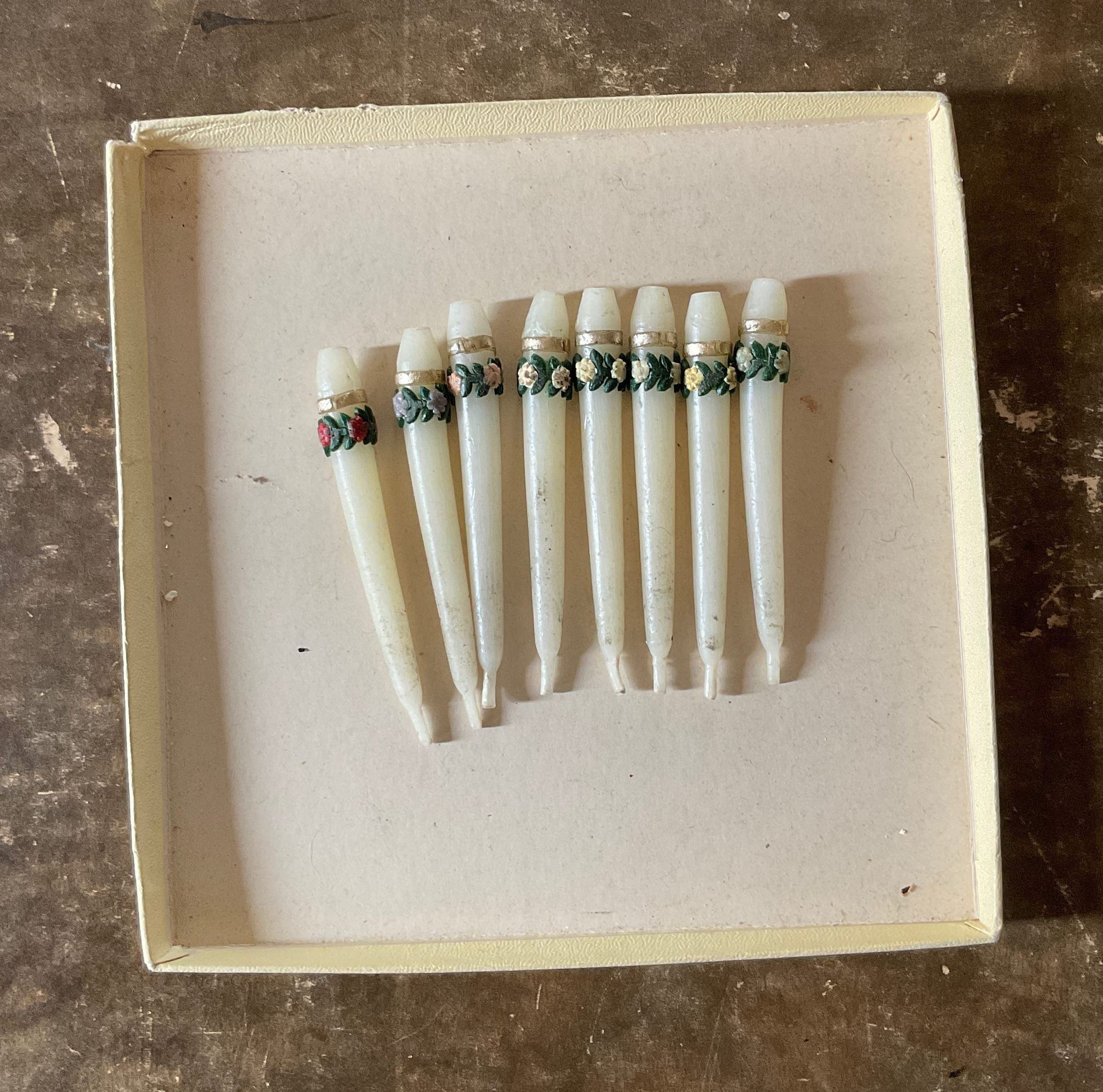 8 flower detailed candles. The candles are about 3 inches in length. They are all white with different color flowers. There is one red flower, one purple, one peach, and five yellow ones.Collection