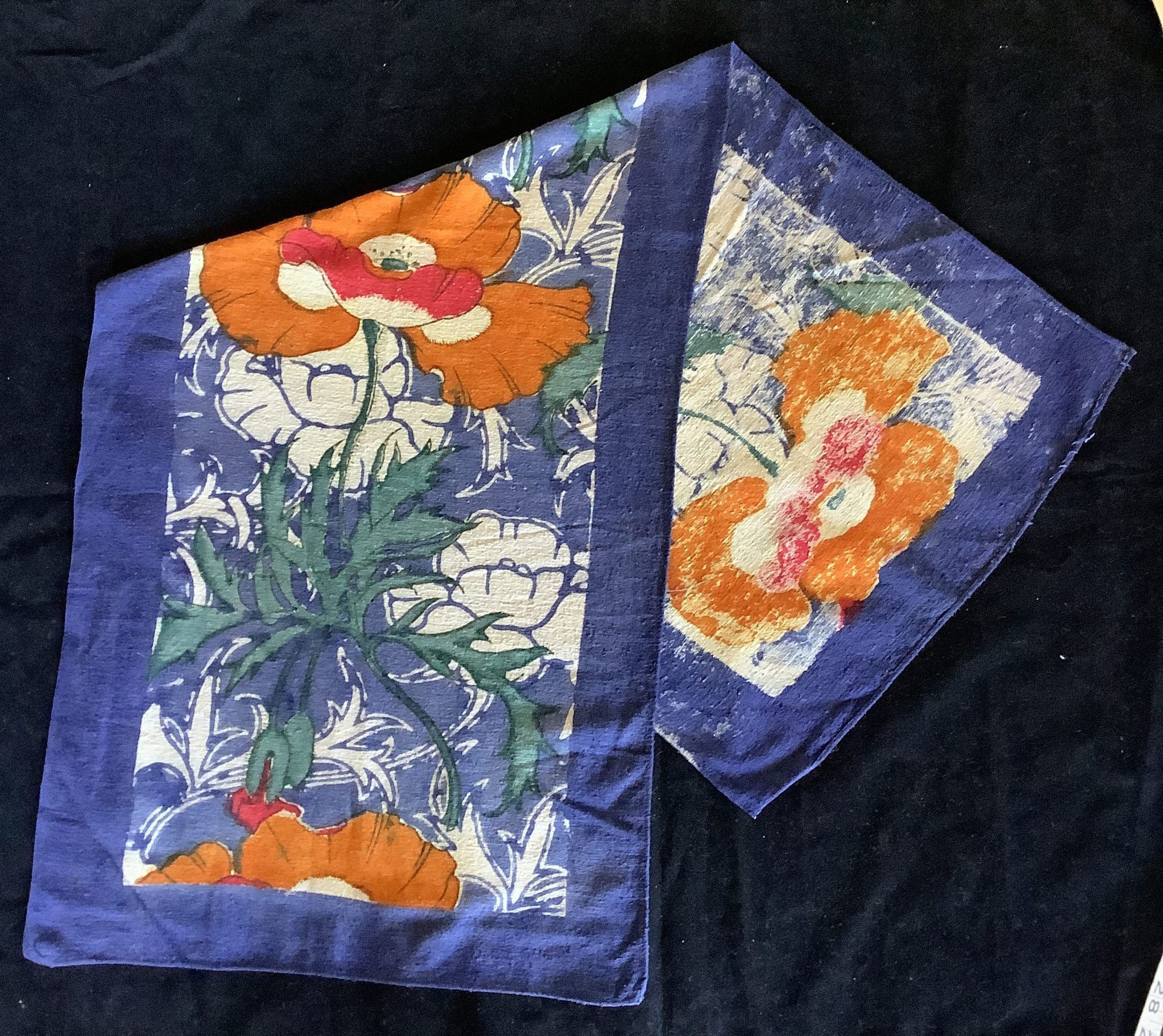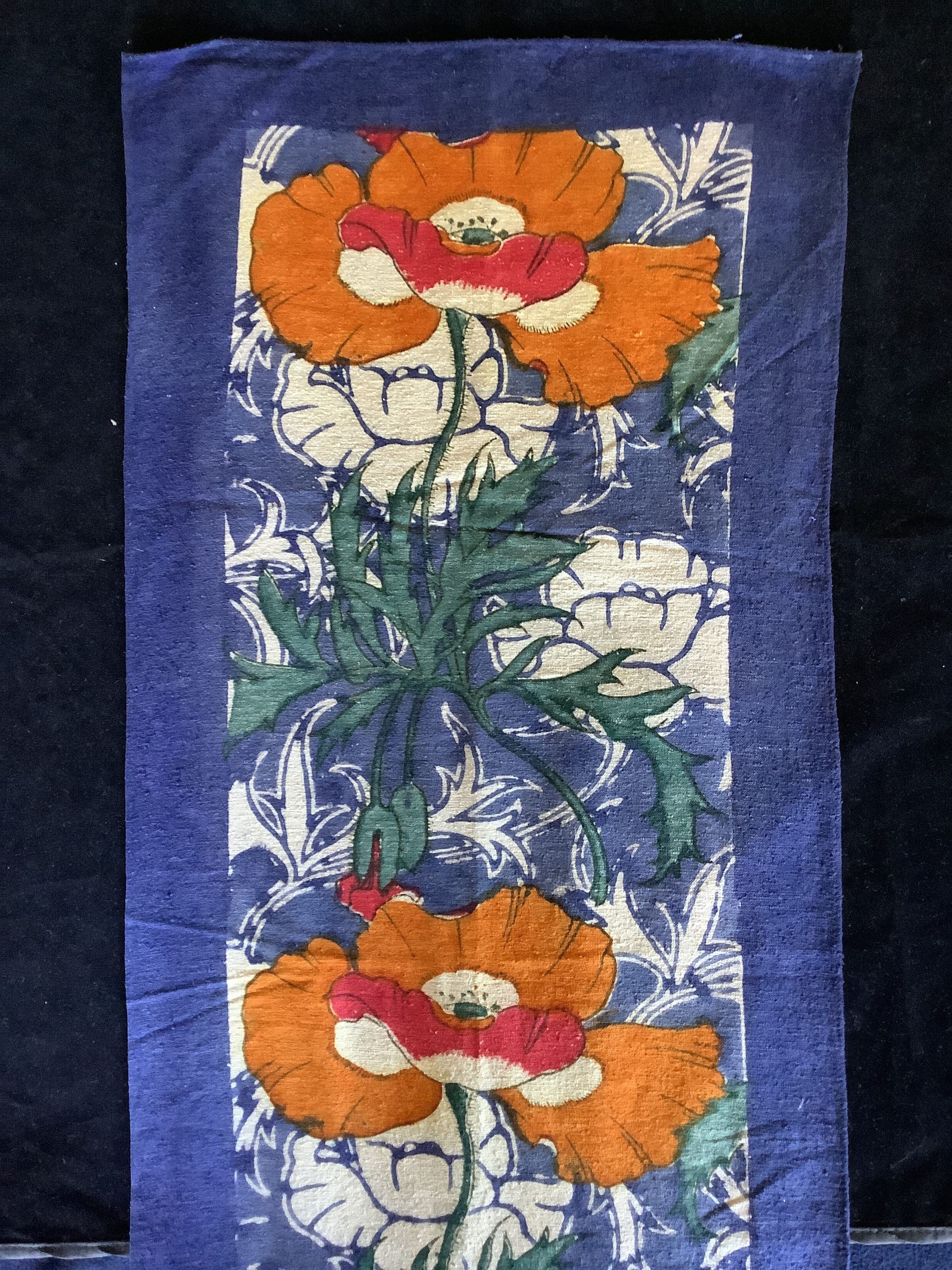 Rectangular textile, with a rough linen-like texture. It is printed blue with a flower design.