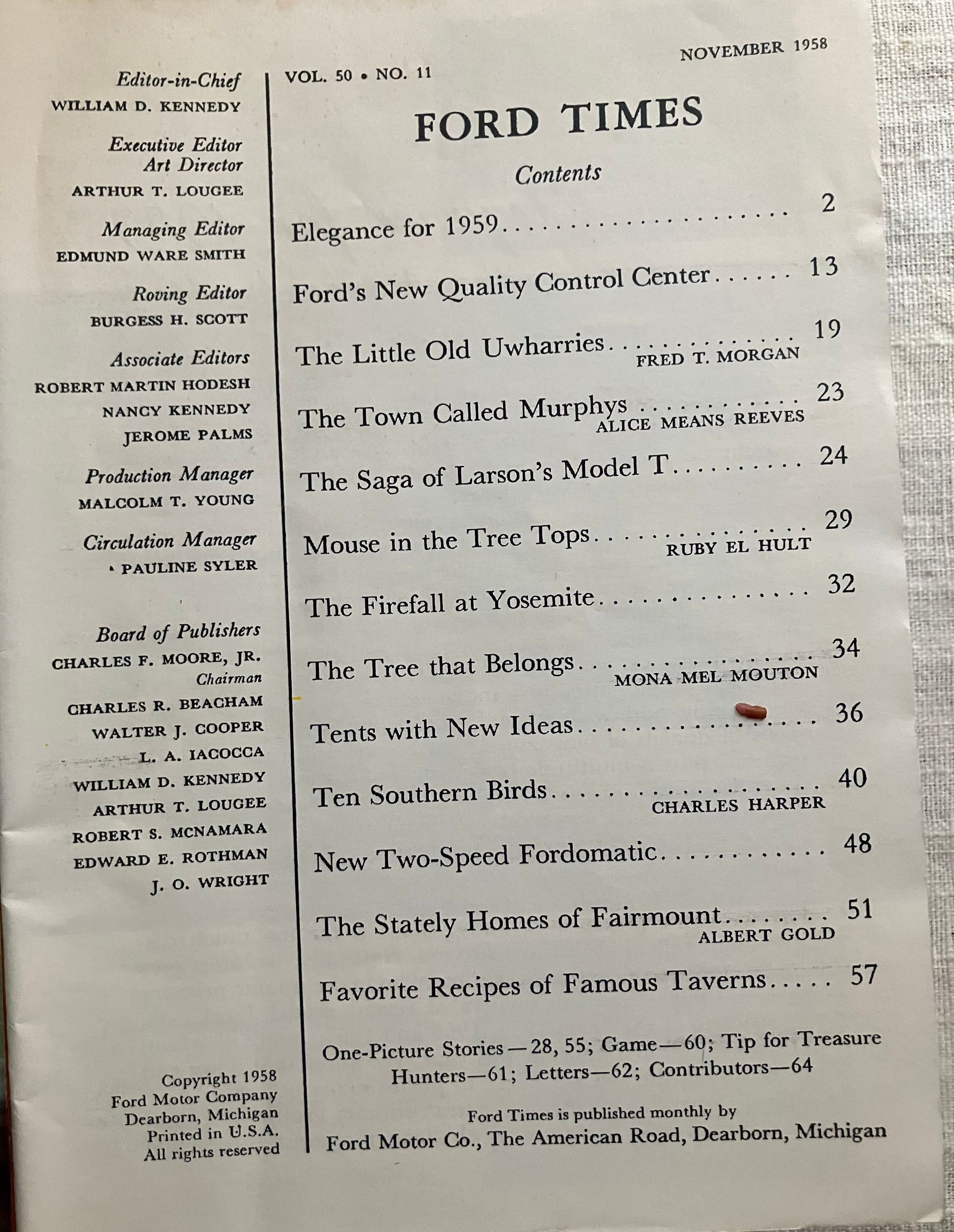 Ford Motor Company published Ford Times magazine from 1908 to 1917 and again from 1943 to 1993. Intended for dealers and consumers, the publication was key to Ford's public relations efforts. With articles emphasizing a range of topics, including automobiles but also recreation, food, history, nature, and culture, Ford Times became an important document of 20th-century American life. - The Henry FordCreate Date