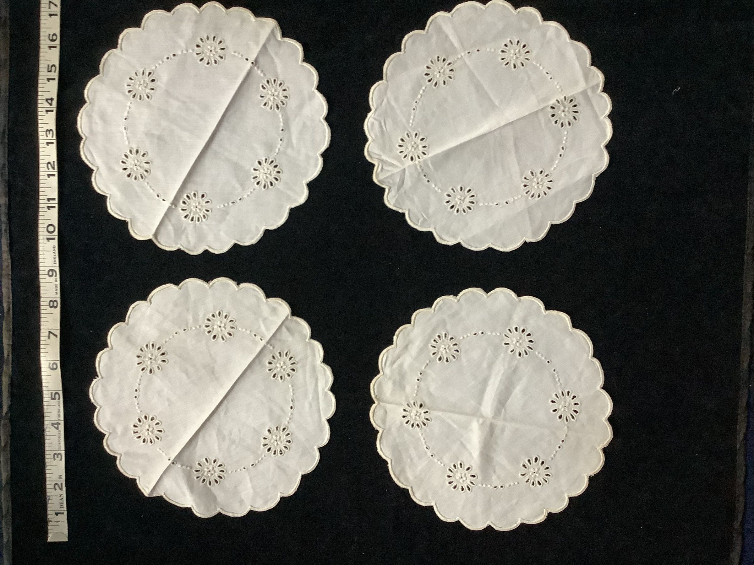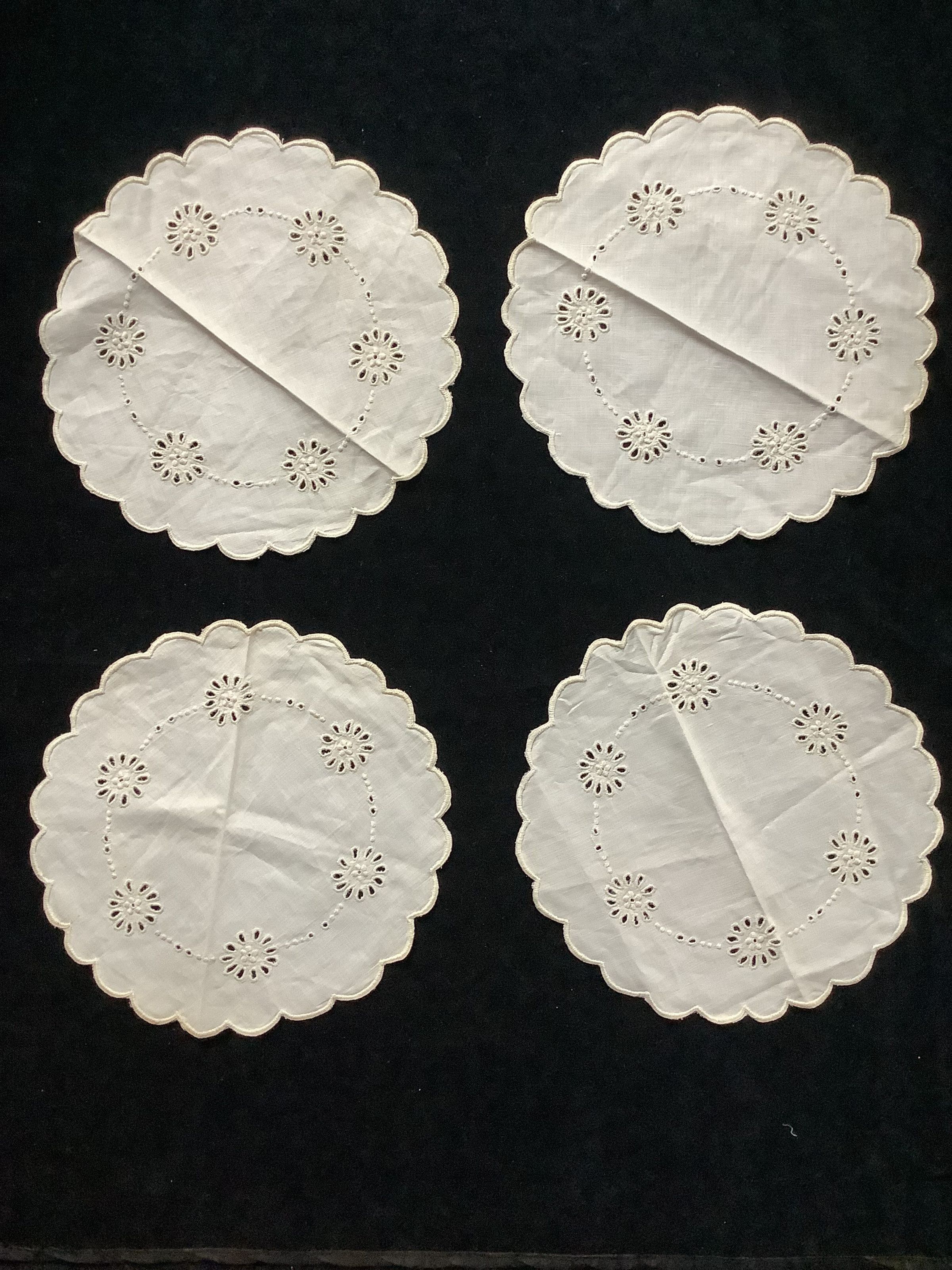 These are small cotton rounds with flower details, made with drawn holes. There’s four in total and they have scalloped edges.
