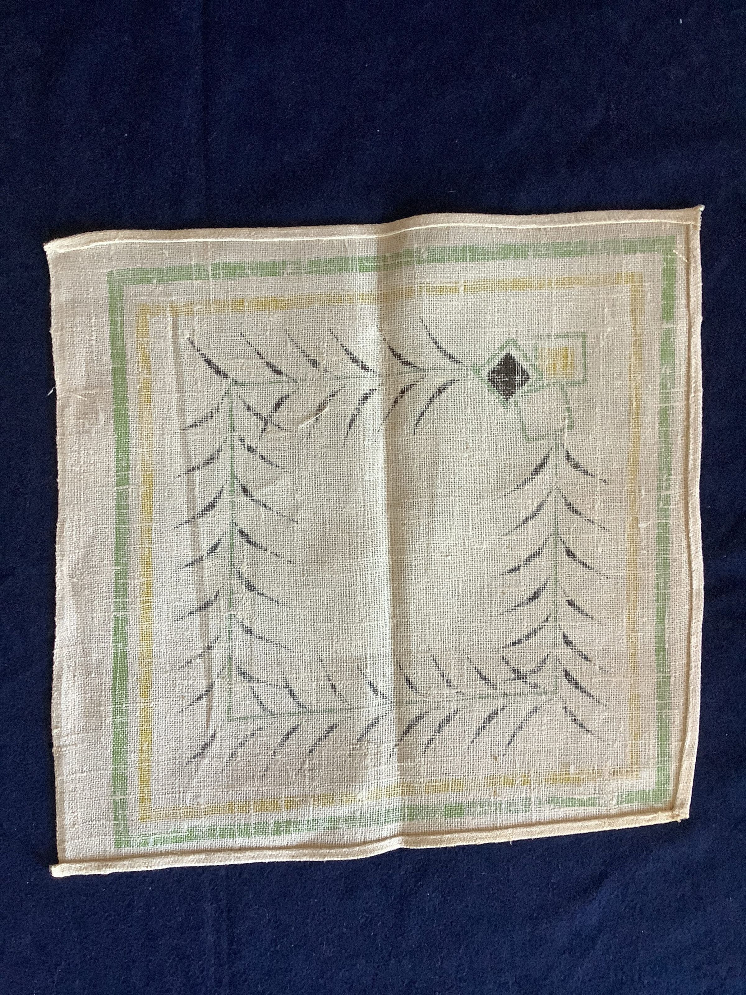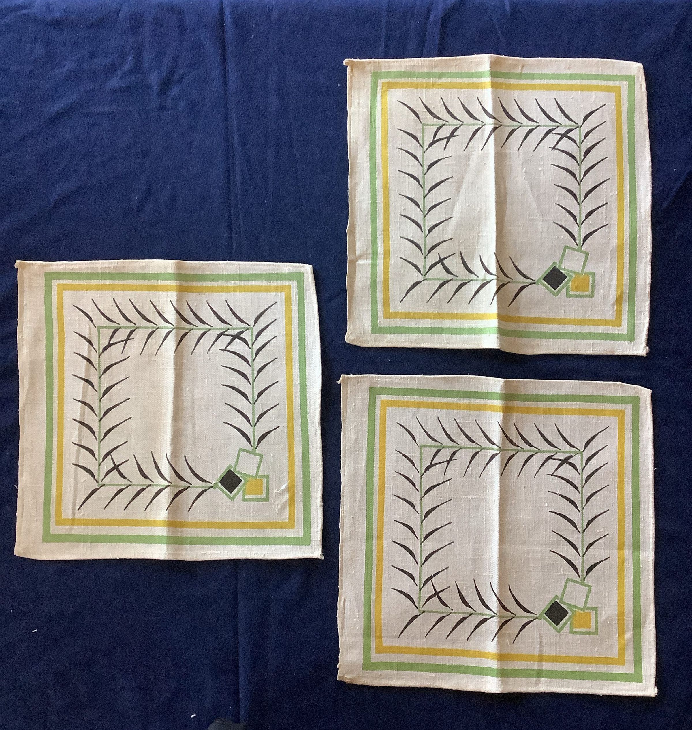 Four decorative squares made of linen with a green and yellow printed design and hemmed edges.