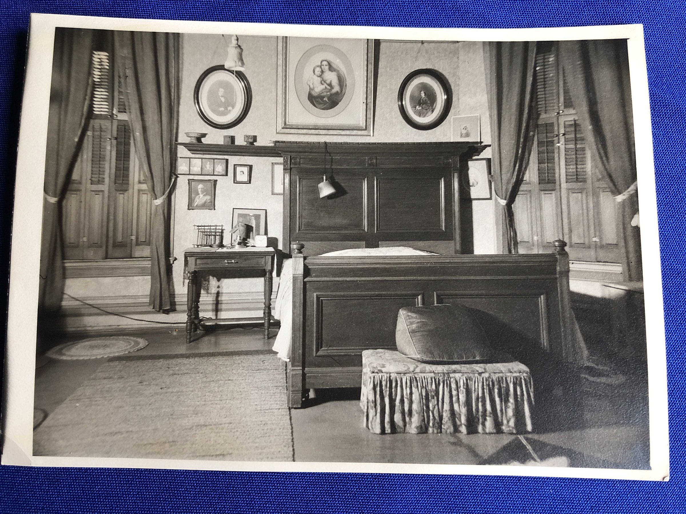 This shows the bed and south wall. In 2018 you can see the same bed, Rug, and covered box. The pictures have been moved to other rooms in the house
