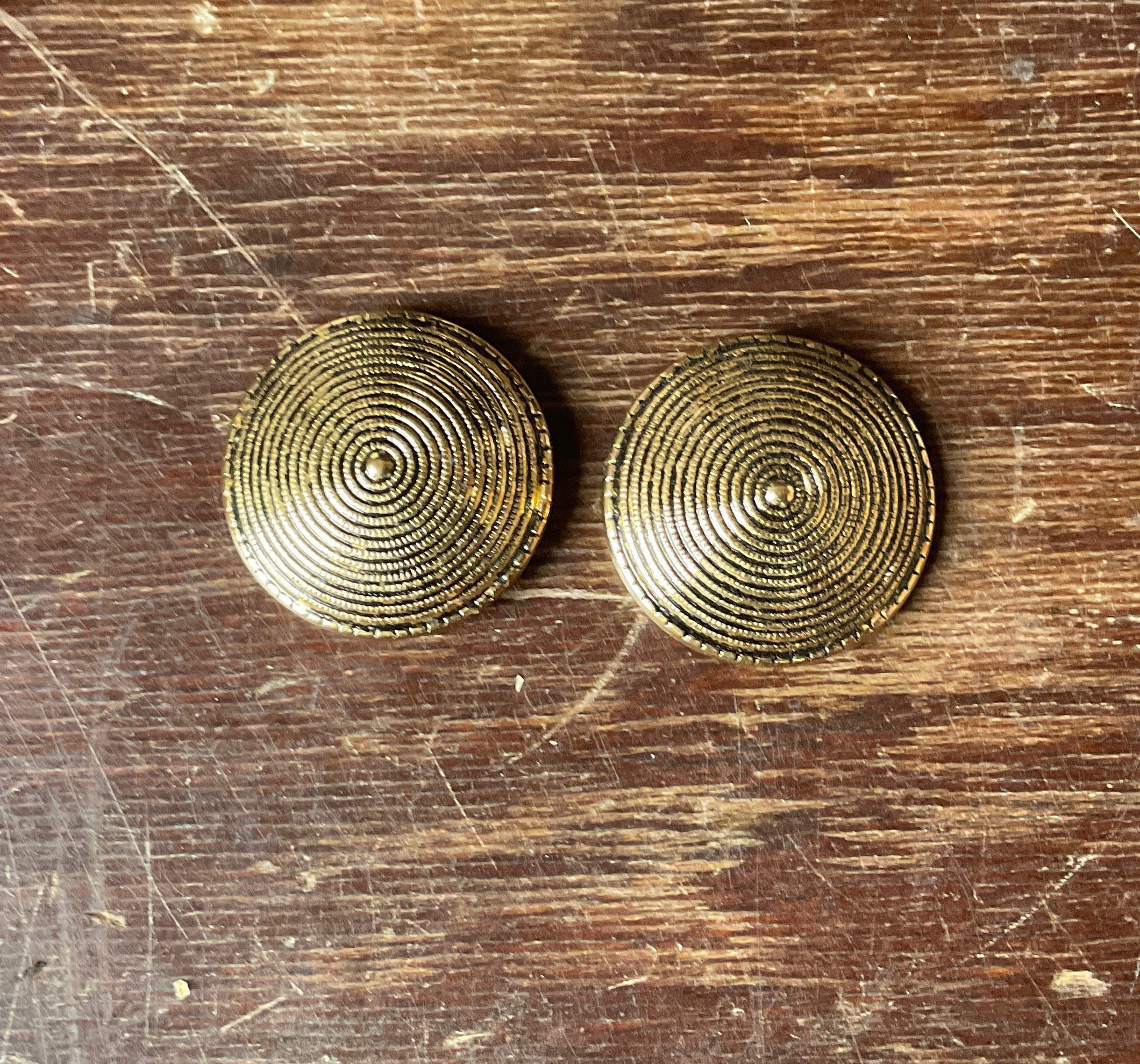 Pair of gold color buttons. They have a spiral pattern on the front.