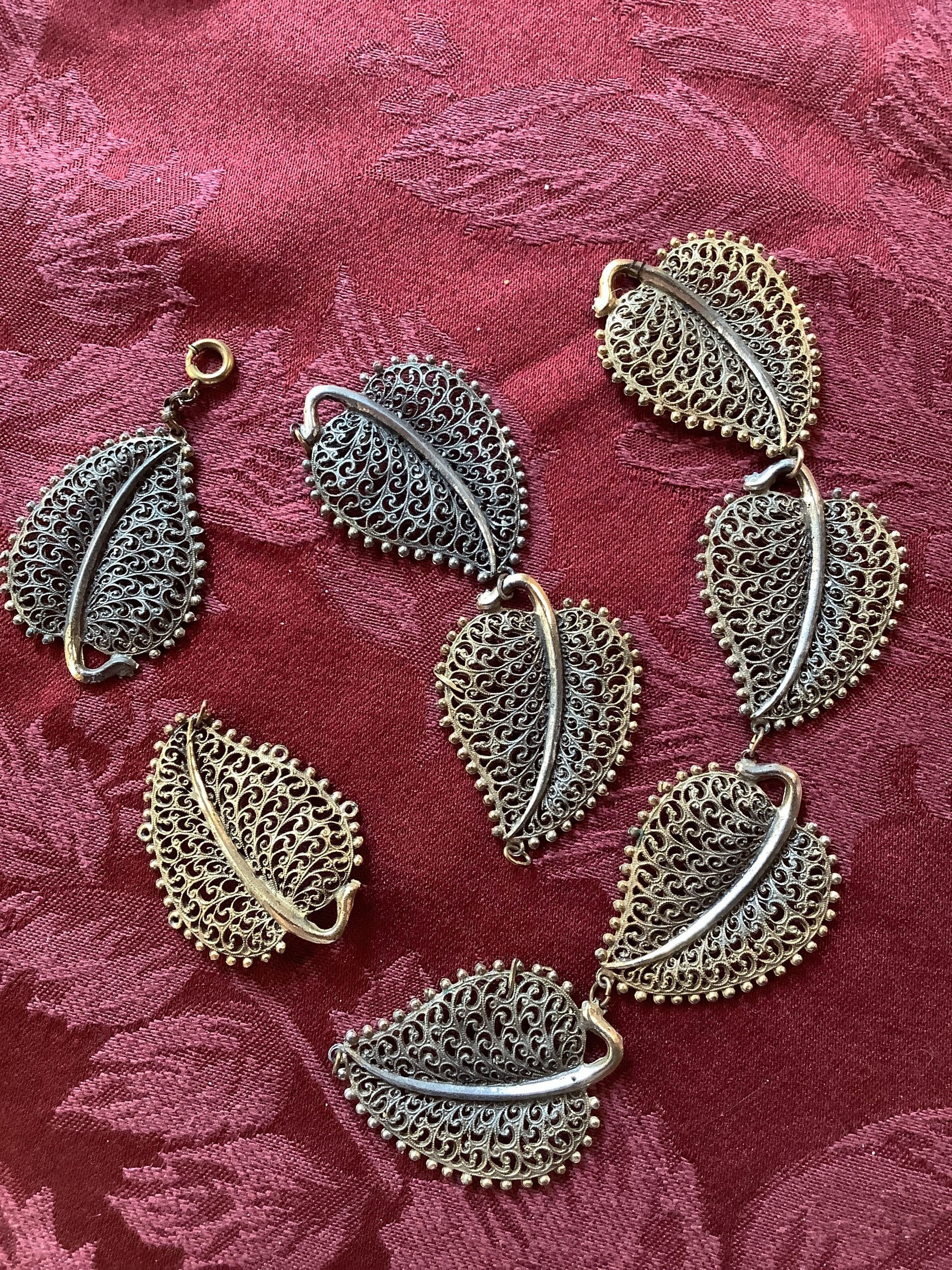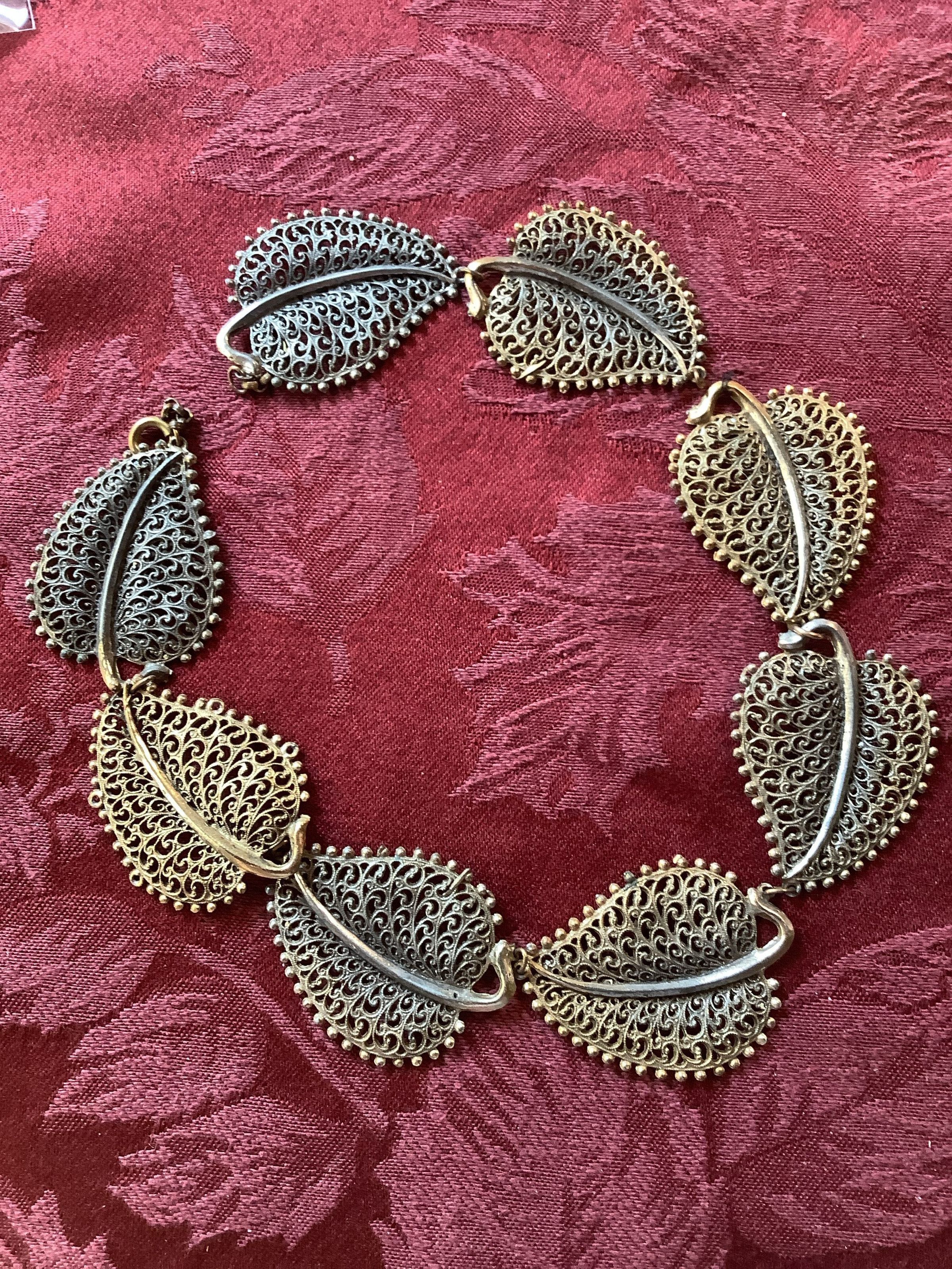A necklace made of gold toned, metal leaves connected by metal hoops. The leaf pendants feature an intricate filigree design.There is a spring ring clasp at the end. The necklace has broken into 4 pieces.Collection