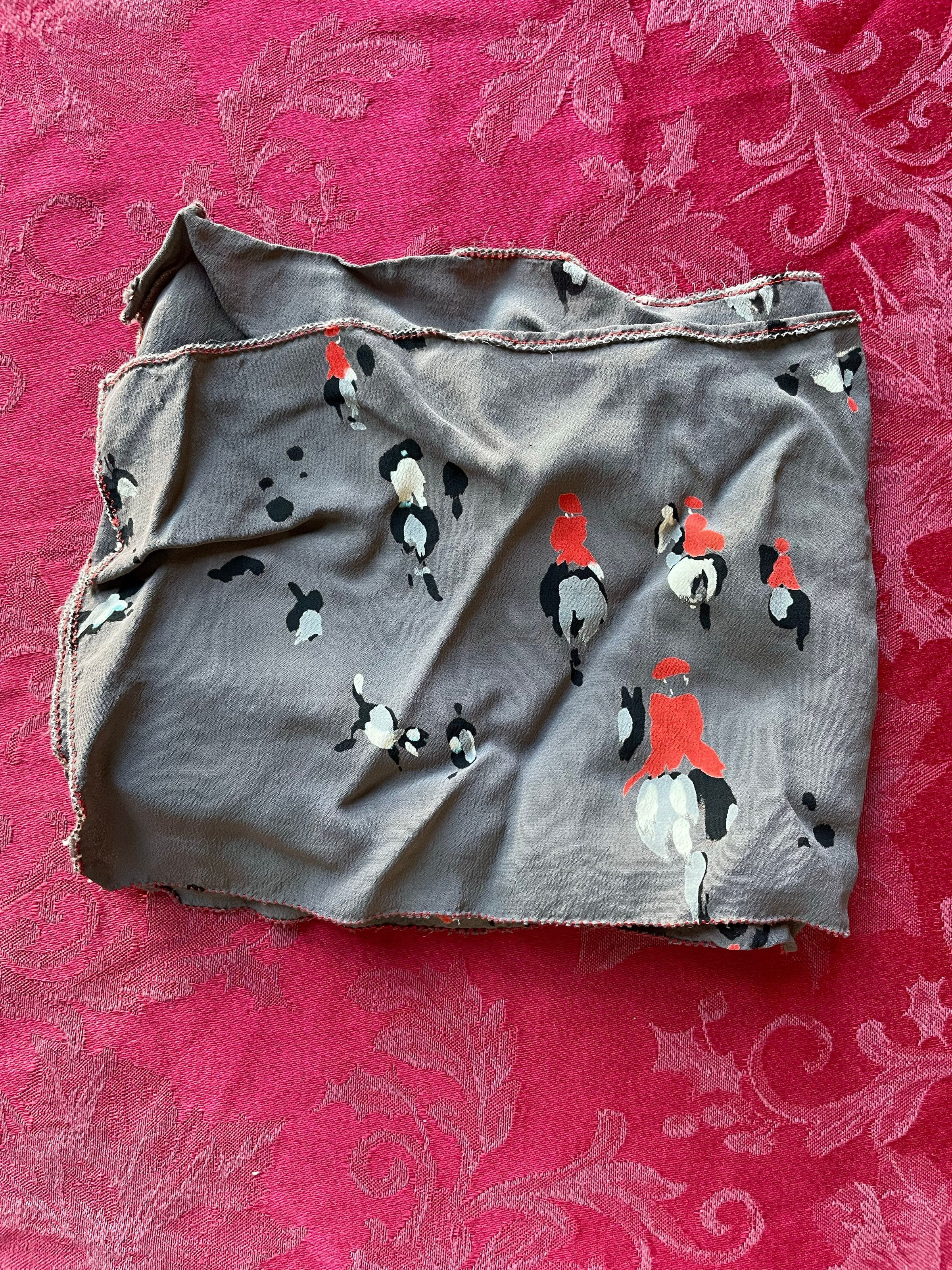 A patterned gray scarf depicting equestrians and their horses.