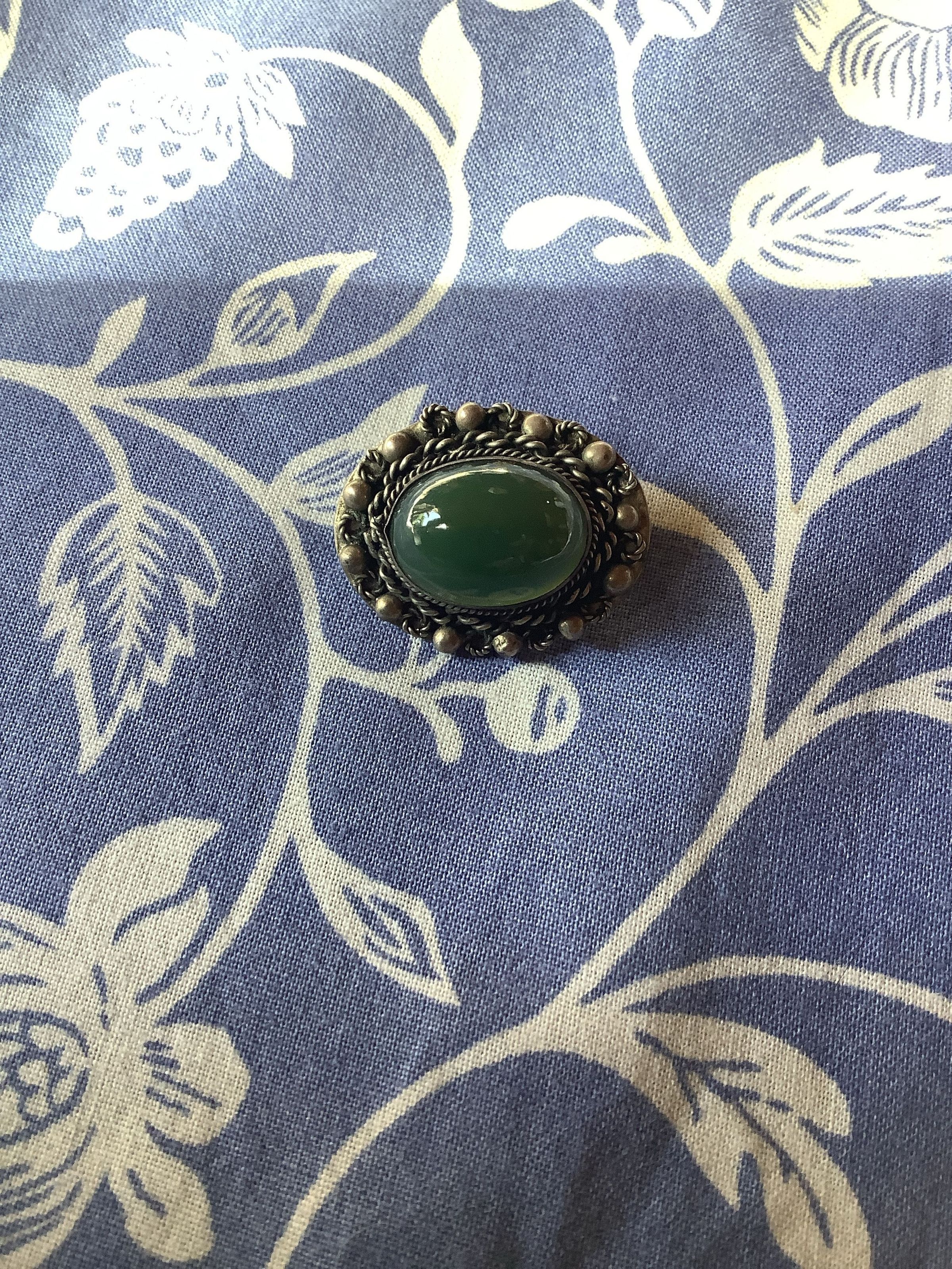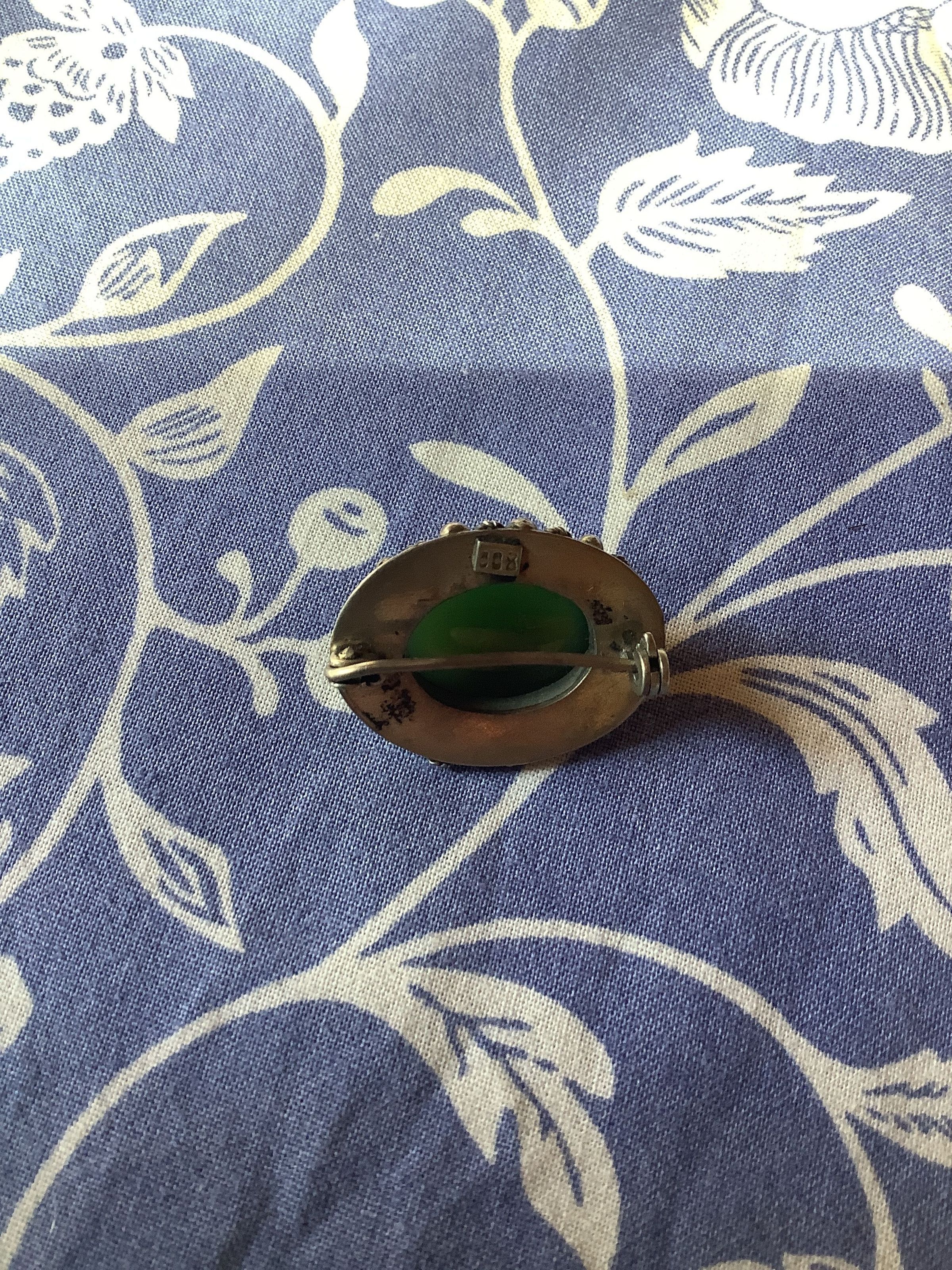 This brooch features a green stone, probably agate or chrysoprase. The stone is set into a silver, art deco style design.