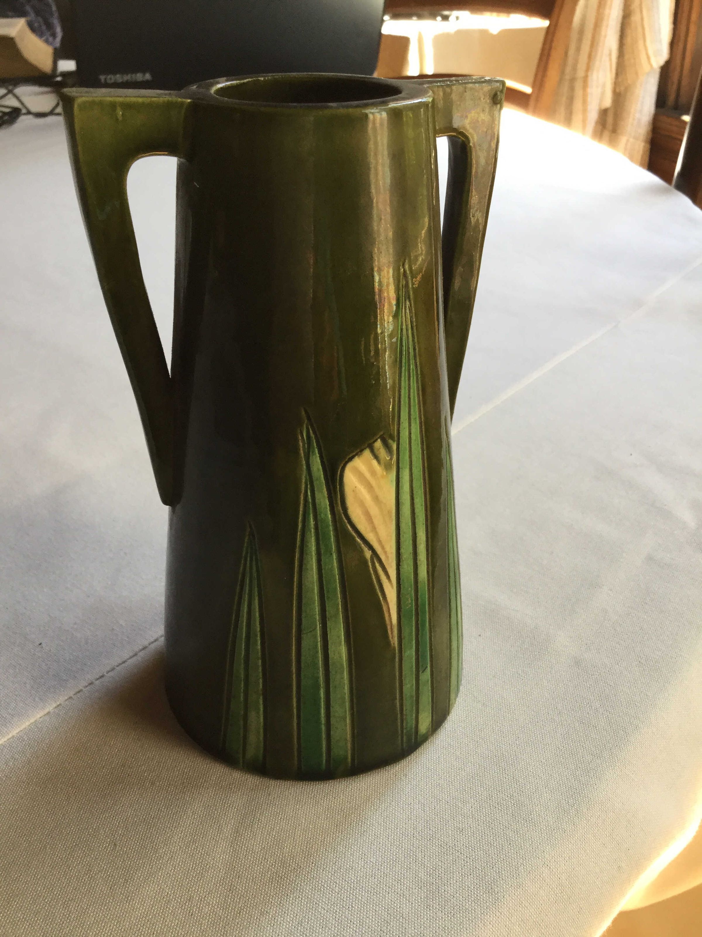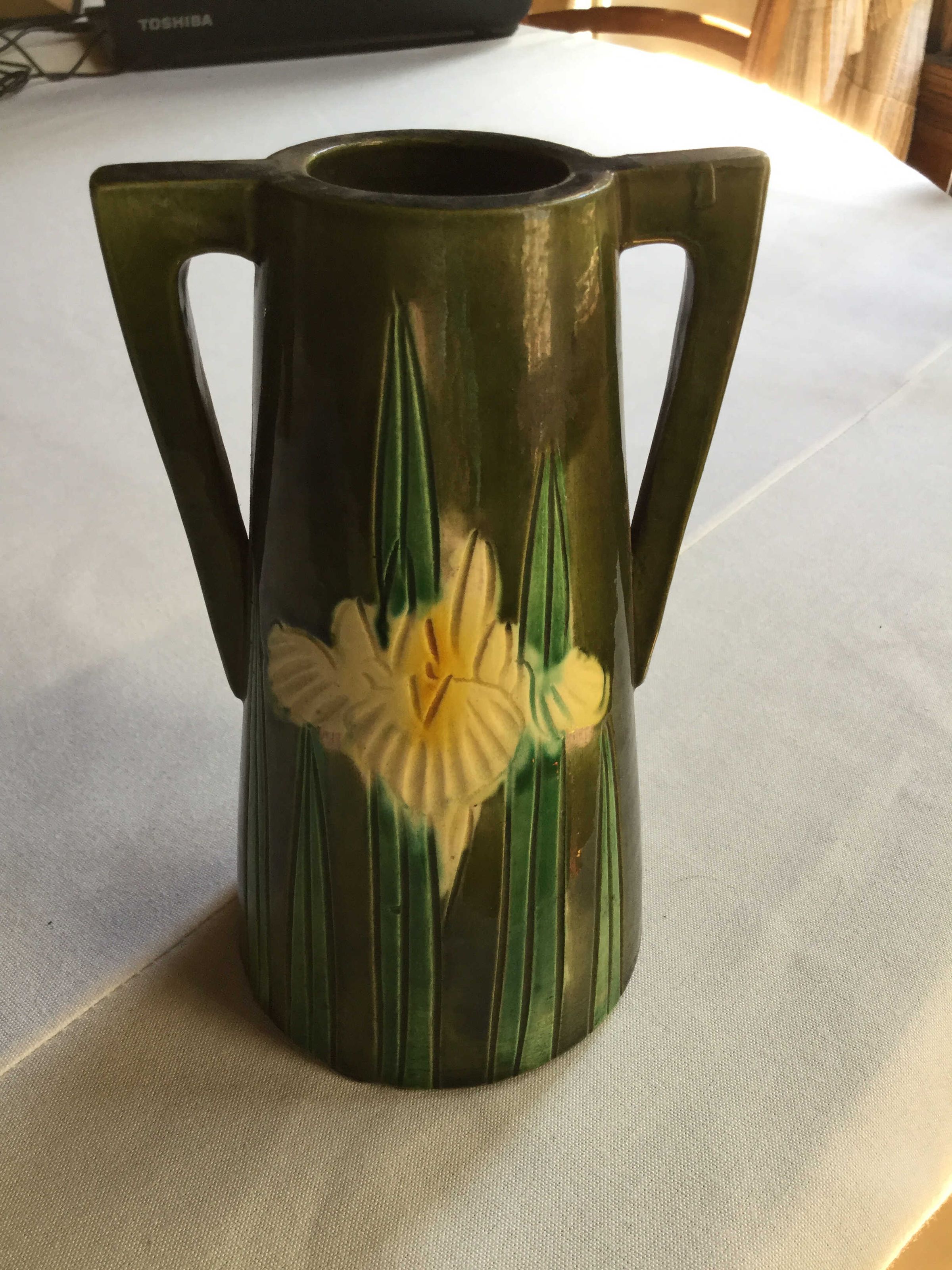 Olive green ceramic vase, double handles shaped like triangles, with etched and painted yellow daffodil with pointed green leavesInscription/Signature/Marks
