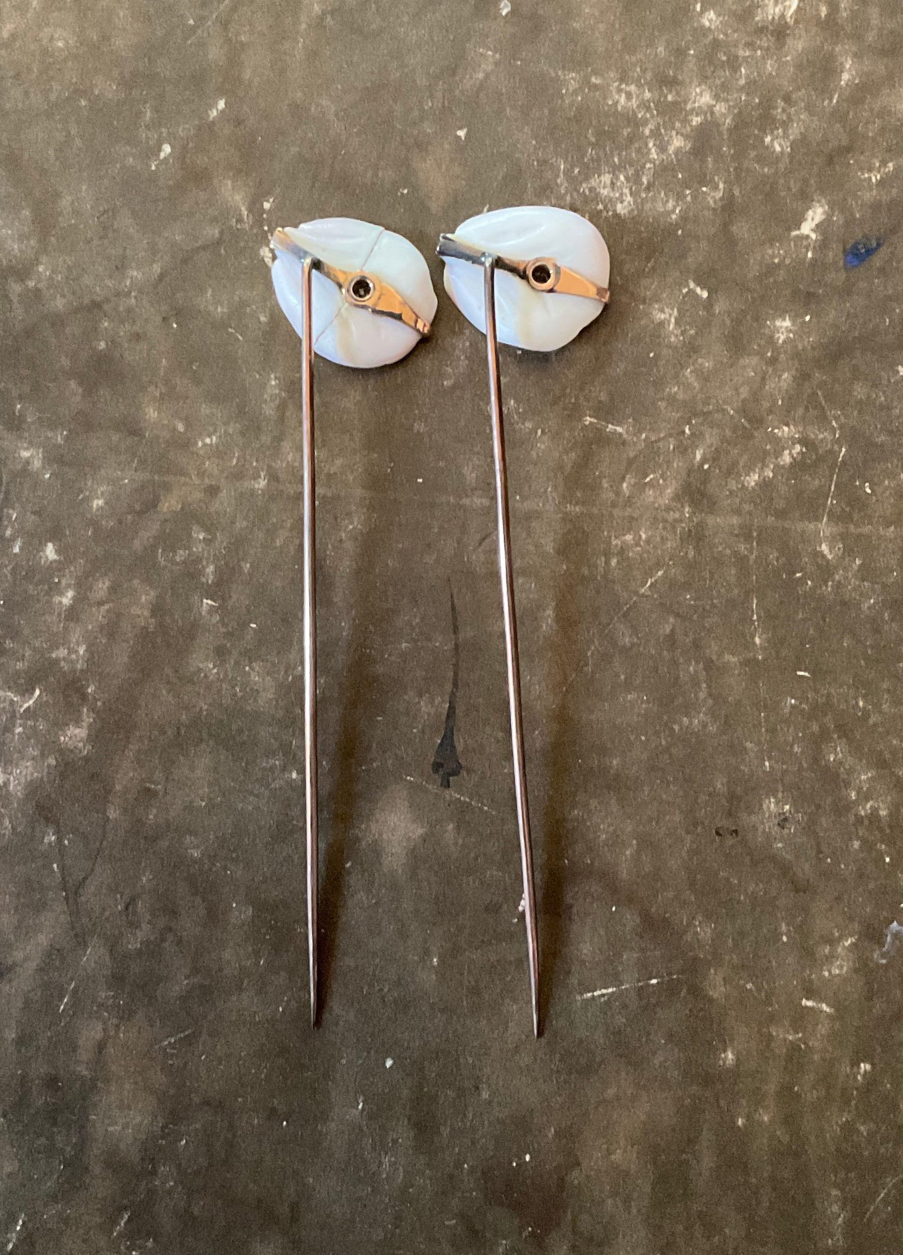 A pair of porcelain/ceramic hair pins in the shape of a flower petal. The petals are white and pink with a diamond-like jewel in the middle. Each has one long, metal pin attached.Collection
