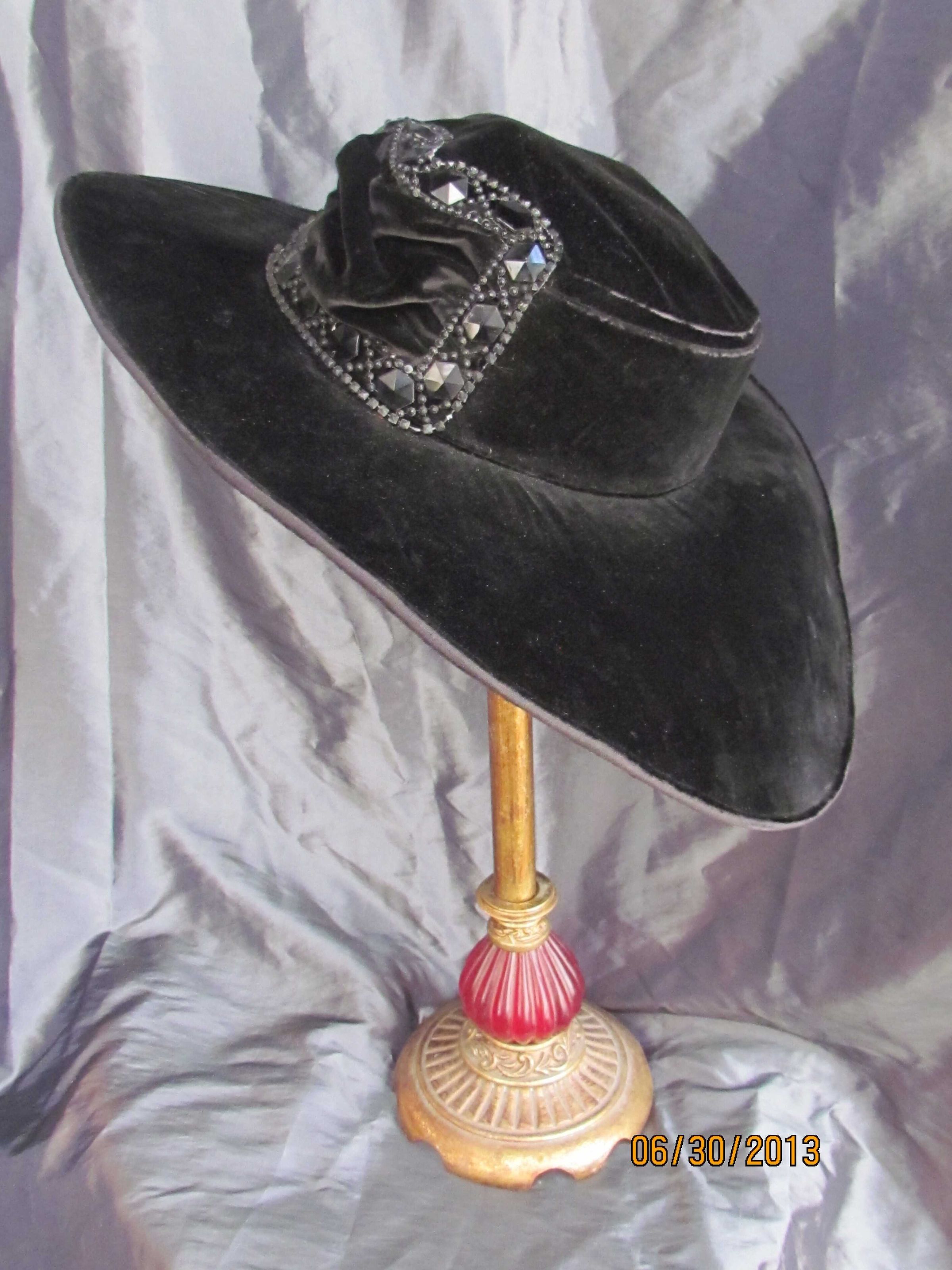 Hat, picture hat, black with black faceted jet bead embellishment, black silk lining, no label,