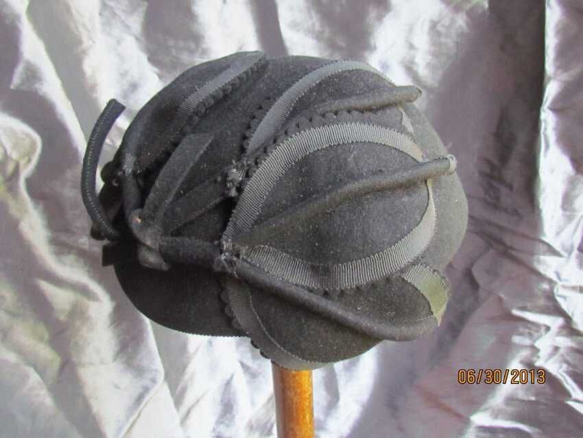 Hat, cocktail hat, black wool felt, 5 black wool leaves embellishments, each leaf has petersham ribbon edge, labeled "Modern Miss"; Date: 1940sCollection