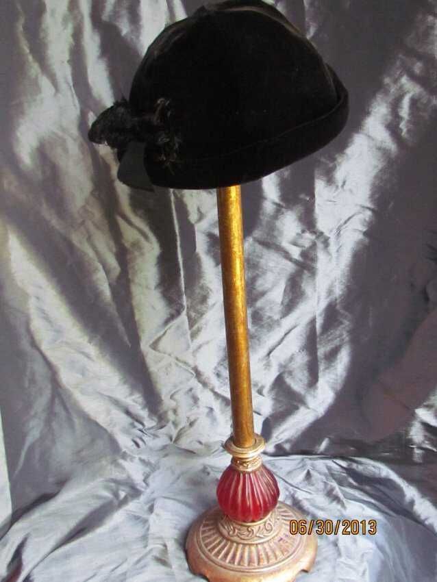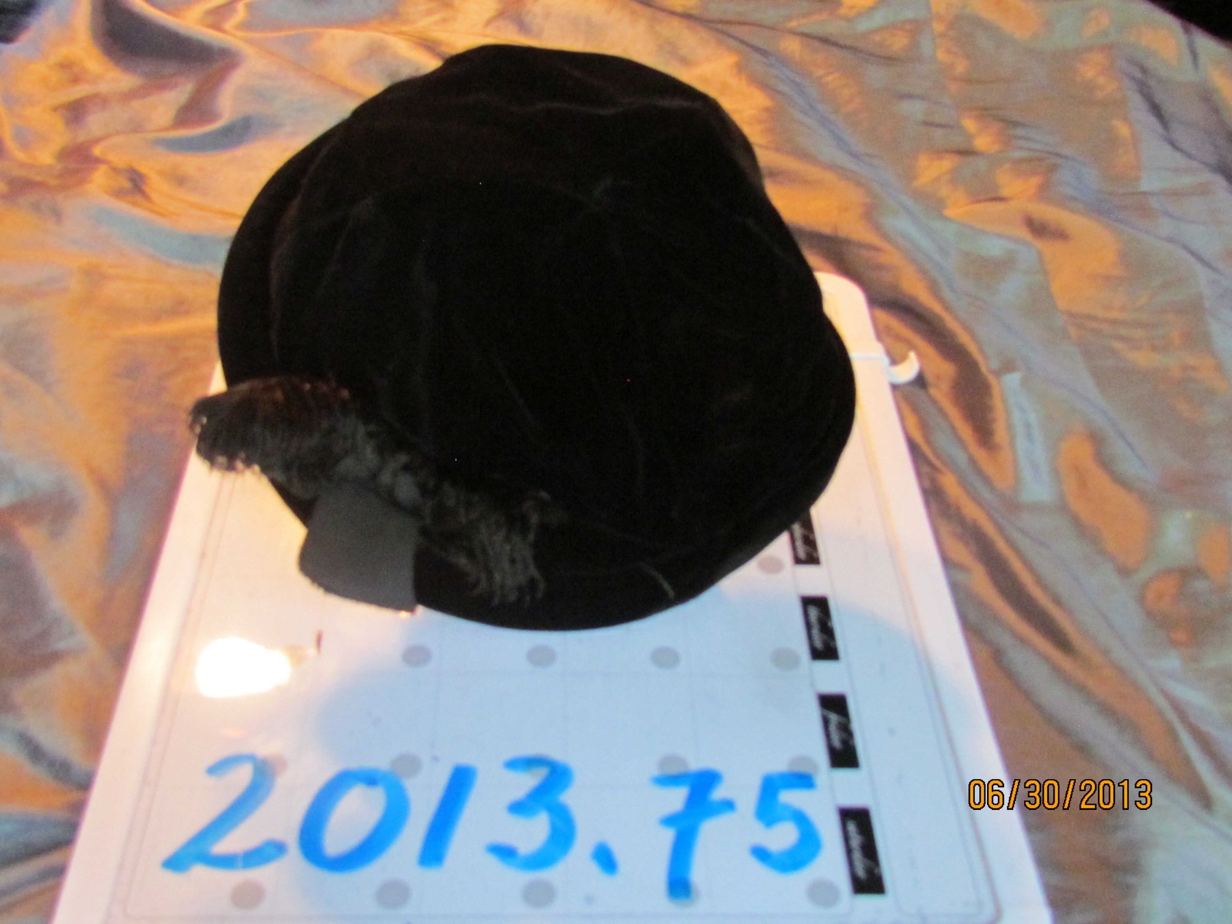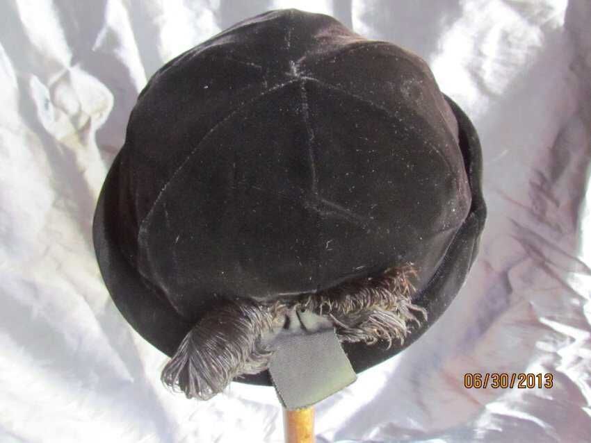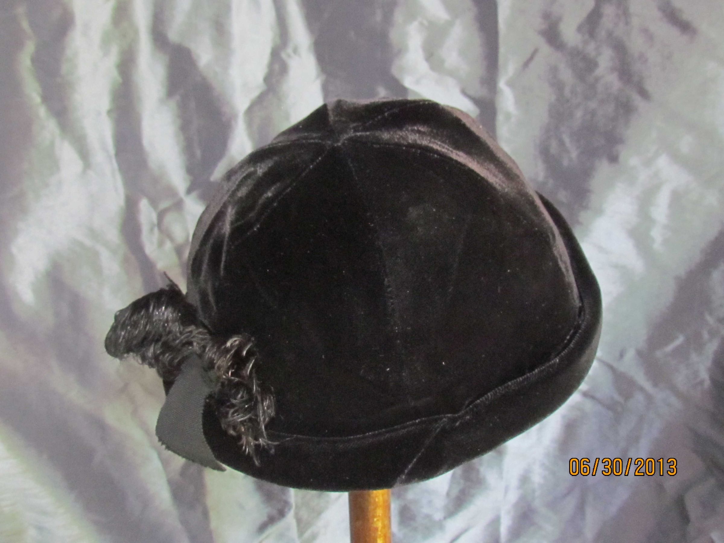 Hat, black beanie with bumper roll, 2 short feathers (thought to be ostrich feathers), black silk velvet, silk lining with petersham headsize ribbon,Collection