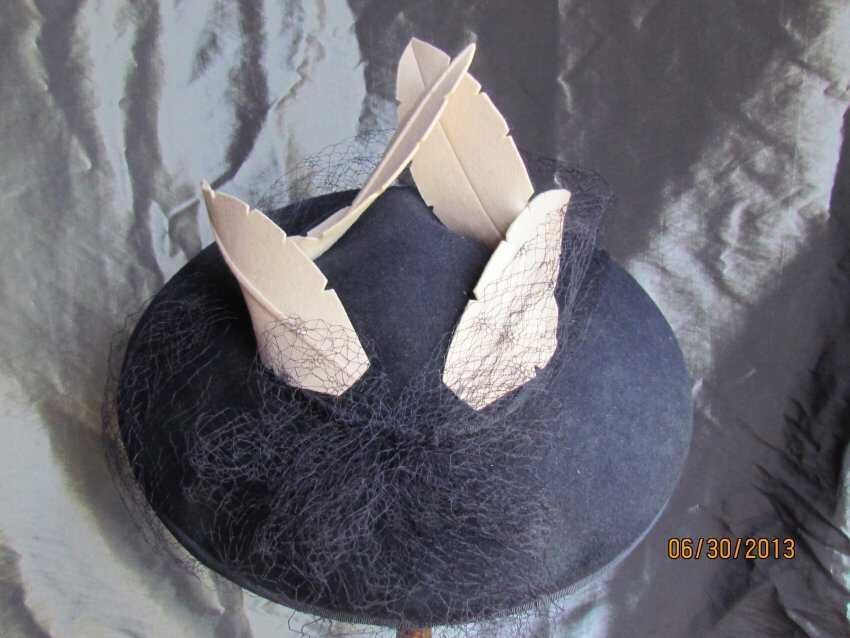 Hat, platter hat with skull cap, blue wool felt with a petersham trim on the brim and on the skullcap, blue veiling, 4 decorative cream wool feathers, elastic; labels reads "American Modes, 22 ½ inch, created in California"; Date: 1940s eraCollection