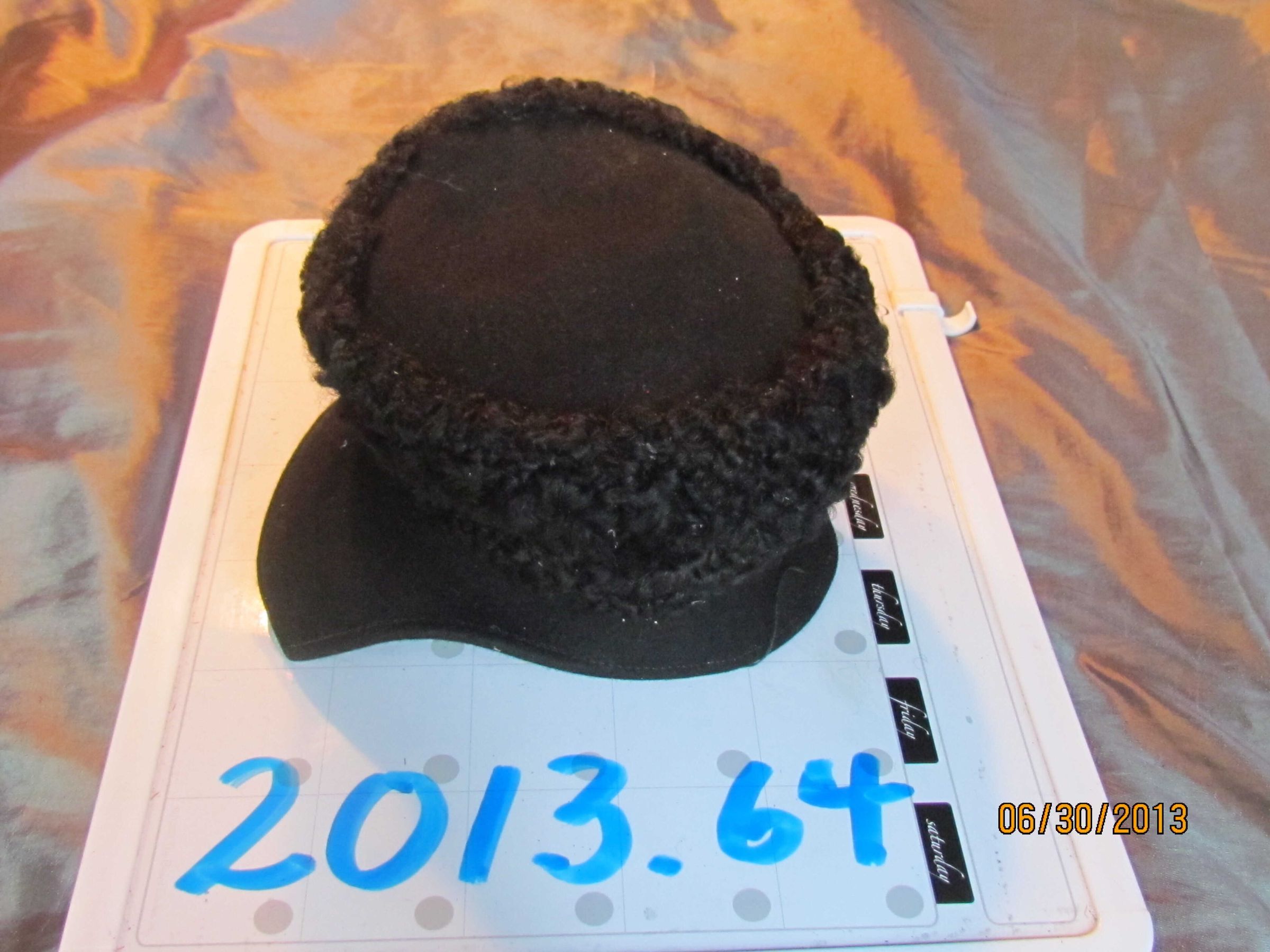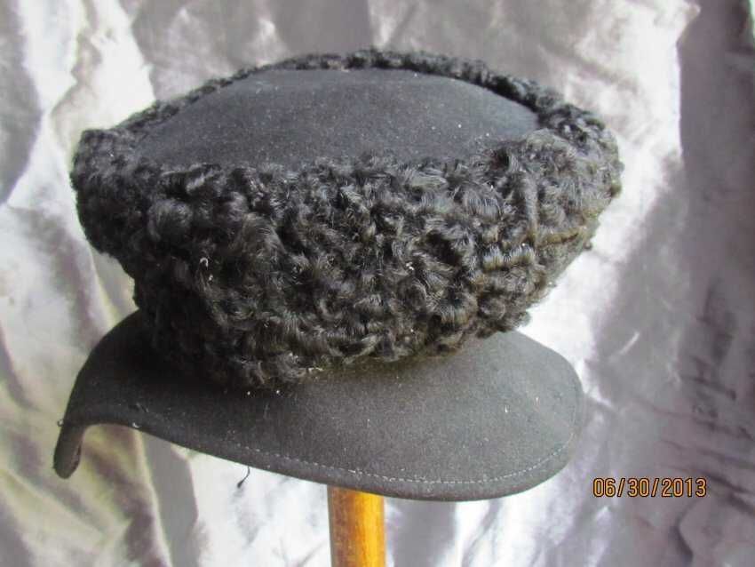 Hat, Moorish style, black wool felt with wire brim and Persian lamb wool trim. No label inside. Probably not manufactured.