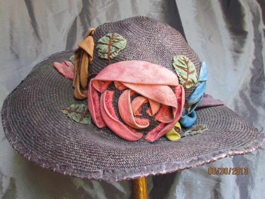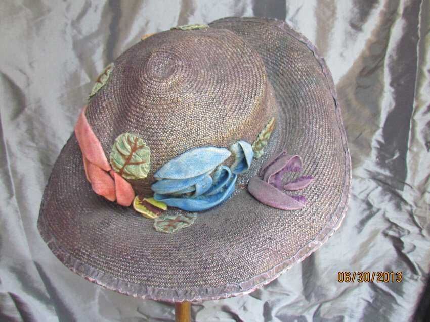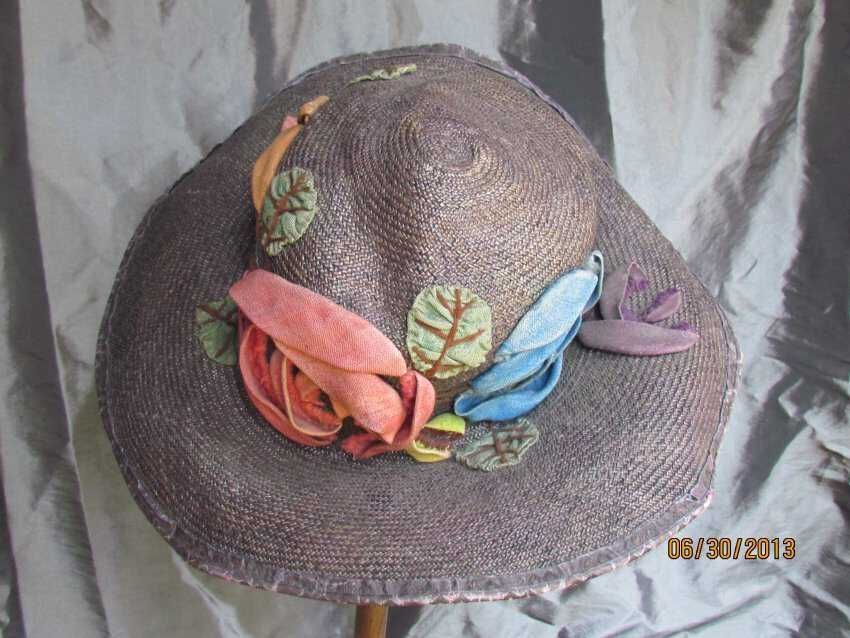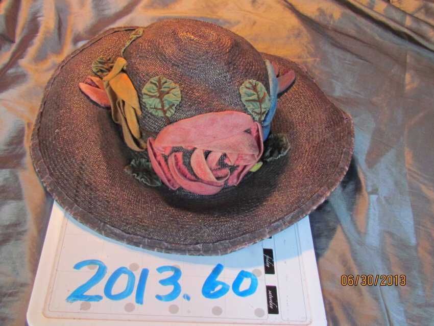 Hat, straw weave (possibly) with blue and cream taffeta ribbon trim with bow in back. Inside: petersham ribbon with maker's label "I. Magnin & Co. Ranleigh" and size label "22 ½". Crown:Collection